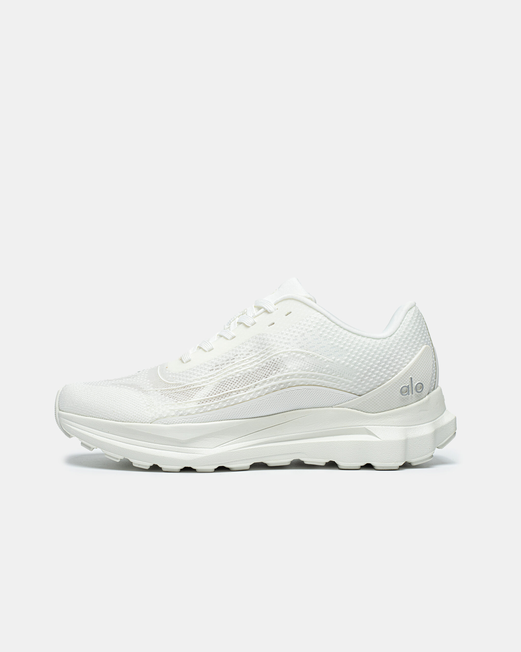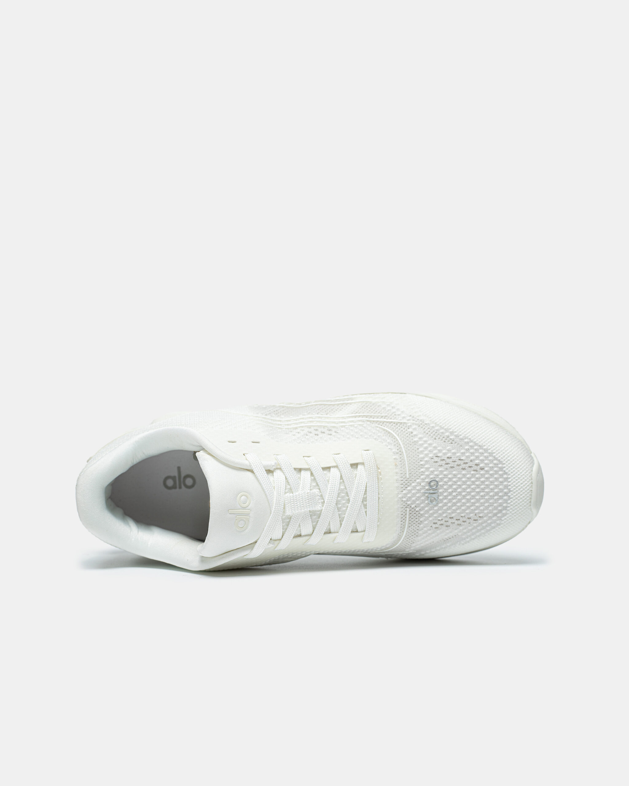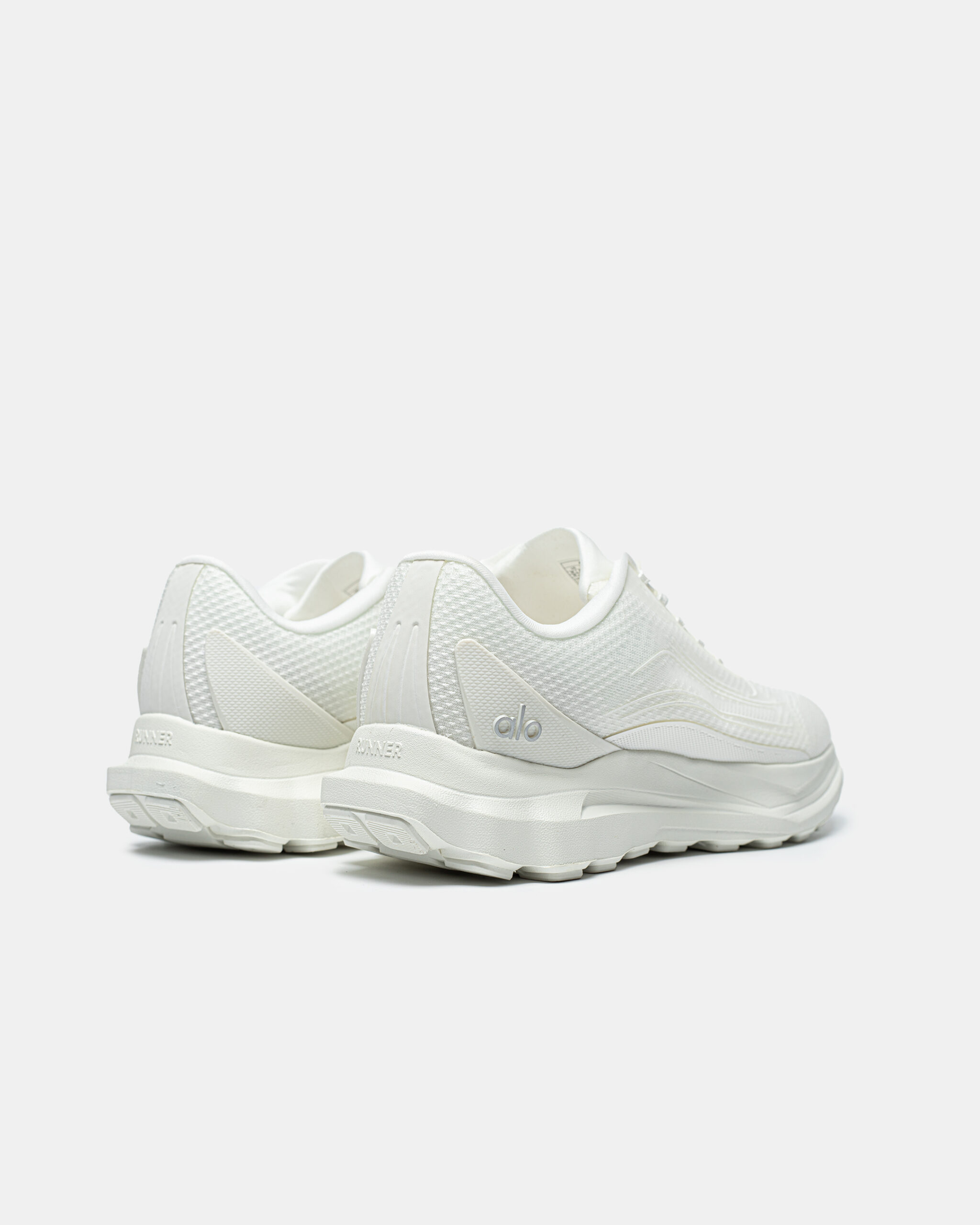 ALO Yoga Runner White— стильні універсальні кросівки з дихаючим подвійним сітчастим верхом, стабілізуючою п’ятковою кліпсою і двошаровою підошвою для комфорту, підтримки та адаптації до різних поверхонь, при цьому виготовлені на 70 % з перероблених матеріалів.