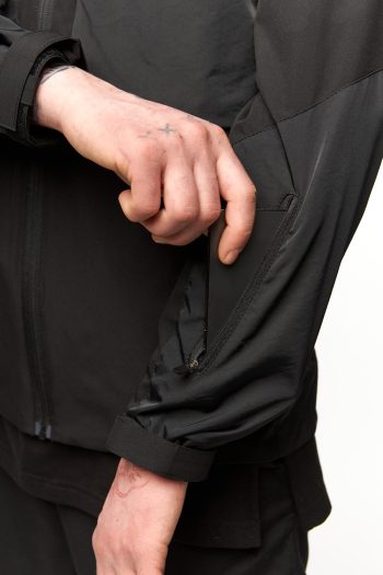 Куртка виконана з матеріалу софтшел (мембранна тканина на основі з мікрофлісу), накладні кишені куртки виконані з водонепроникної плащівки. Верхні накладні кишені відлетні, фіксуються за допомогою магнітних кнопок. Під основною кишенею є приховані кишені для гаманця та смартфону. Вхід в накладні кишені на блискавках.