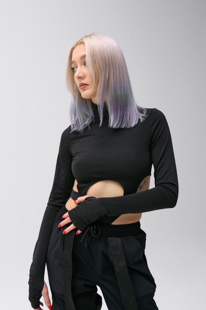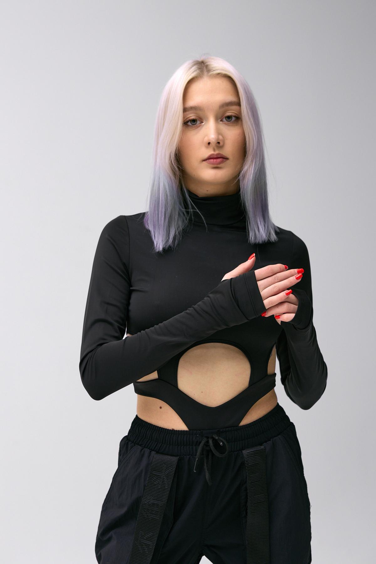 Боді з фігурними вирізами виконаний з еластичного матеріалу біфлекс. З високим горлом. Рукава подовжені, для зручності носіння, в шві рукава є отвір для пальця. Застібається на кнопки внизу.