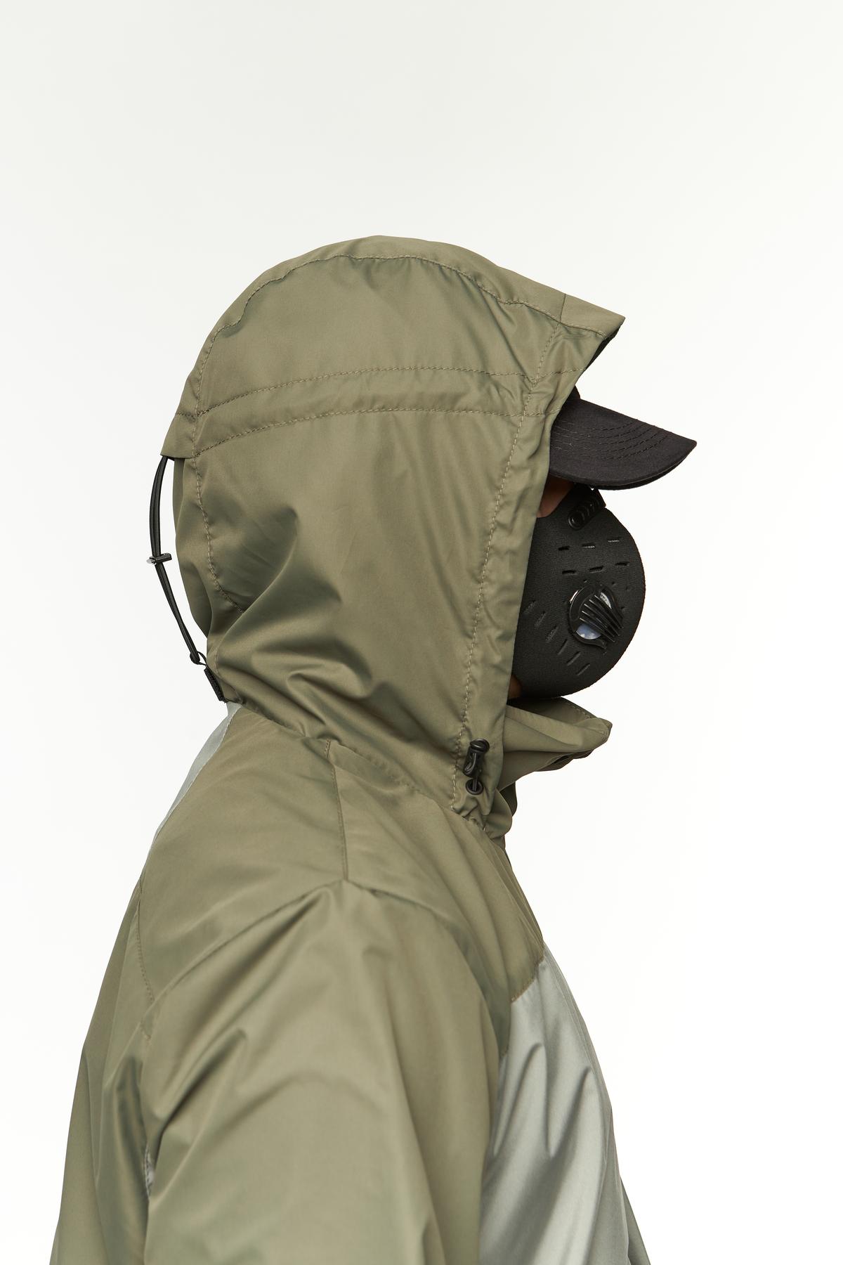 Вітрівка на блискавці з високим коміром і капюшоном. На рукавах пати з липучкою для регулювання ширини рукава. Капюшон ховається в високий комір та регулюється по ширині та висоті. Всього шість кишень: накладні кишені з контрастної тканини, дві кишені з блискавкою, одна кишеня на лівому рукаві та внутрішня кишеня з блискавкою.