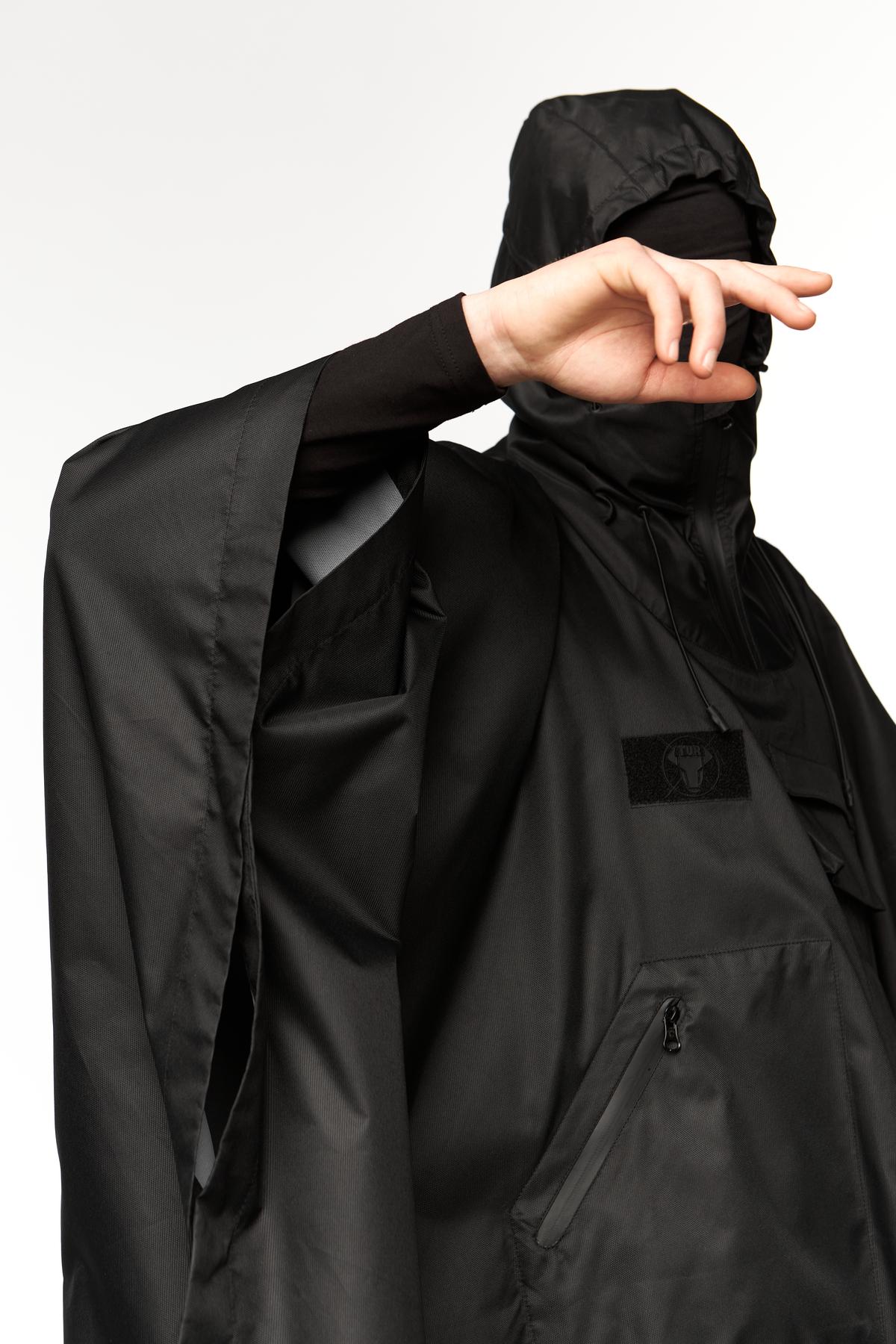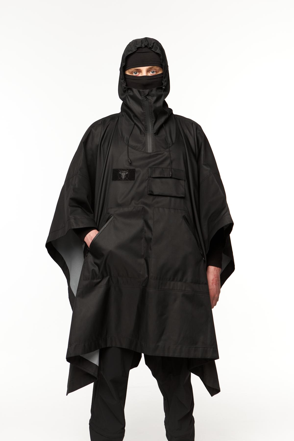 Дощовик пончо вільного крою, виконаний з водовідштовхувальної тканини. Глибокий капюшон з блискавкою, ширина капюшона регулюється по горизонатлі та вертикалі. В бокових деталях вшиті магнітні кнопки, для фіксації виробу та створення імітації рукавів. На спинці є спеціальний отвір для вентиляції. Спереду одна накладна кишеня та дві великих на блискавках. Має фірмовий шеврон.