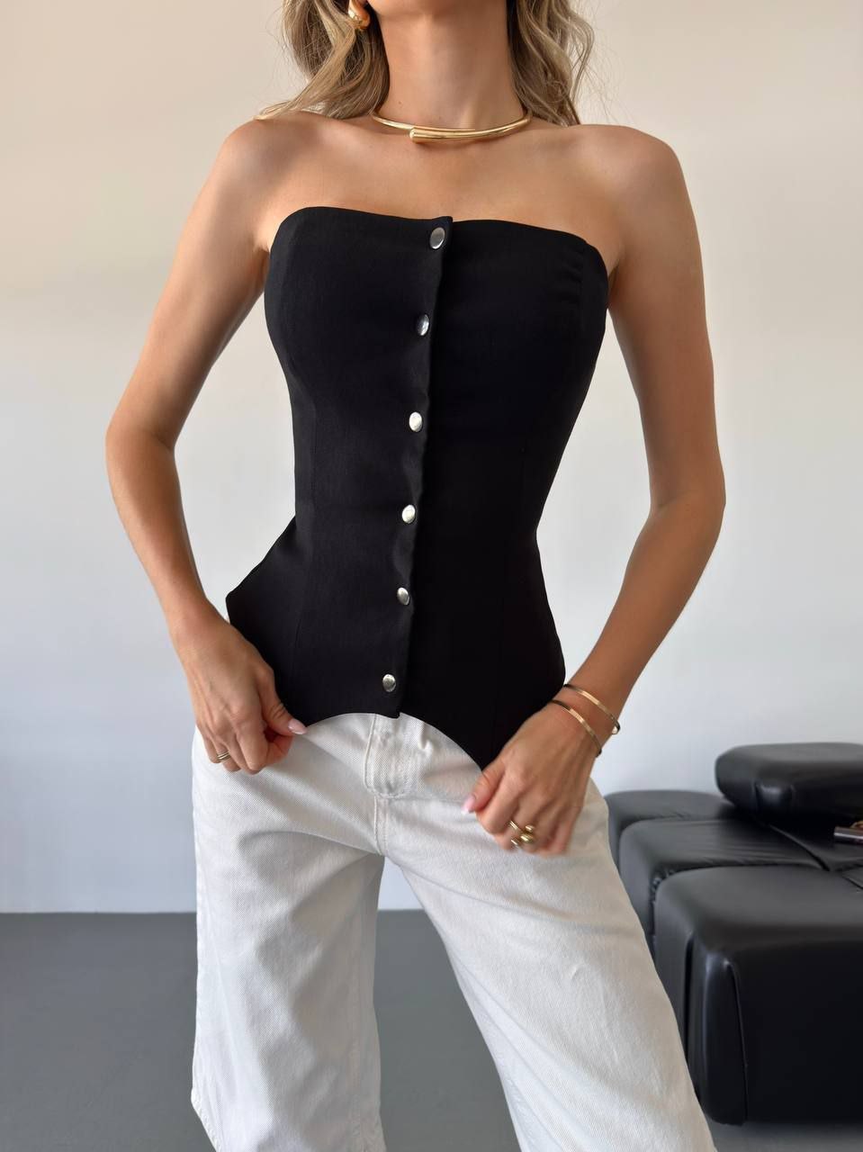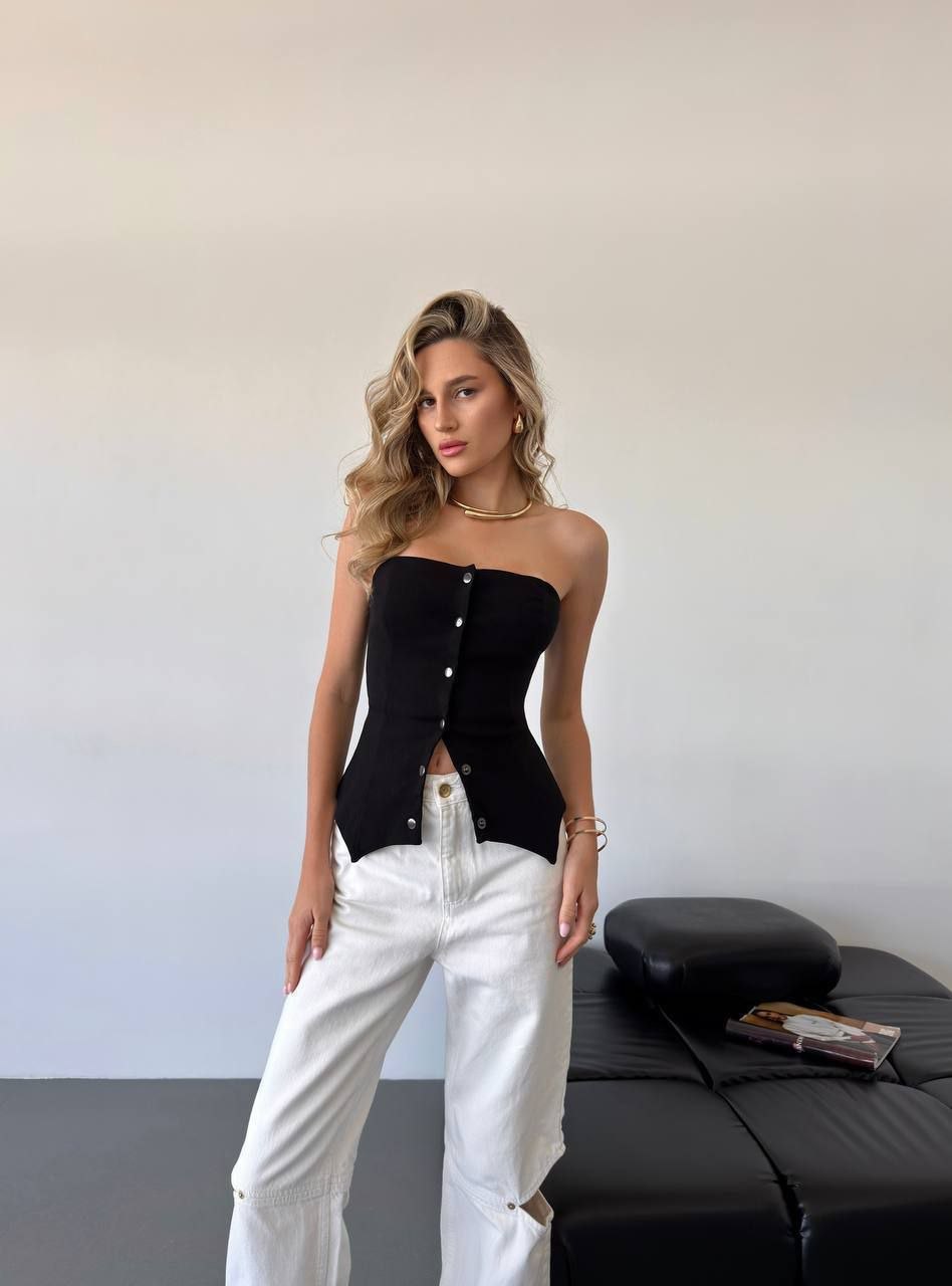 Жіночий корсет чорного кольору на гудзиках — стильна модель для створення акцентних образів. Має приталений крій, який формує силует.
