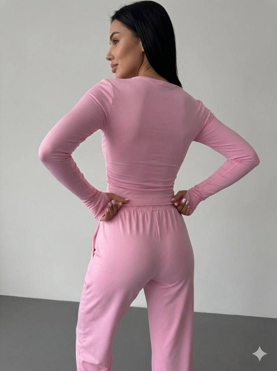 Матеріал еластичний і приємний до тіла, добре тягнеться та зберігає форму після прання. Комплект складається з футболки, лонгсліва та штанів, що дозволяє створювати різні поєднання з іншими елементами одягу.