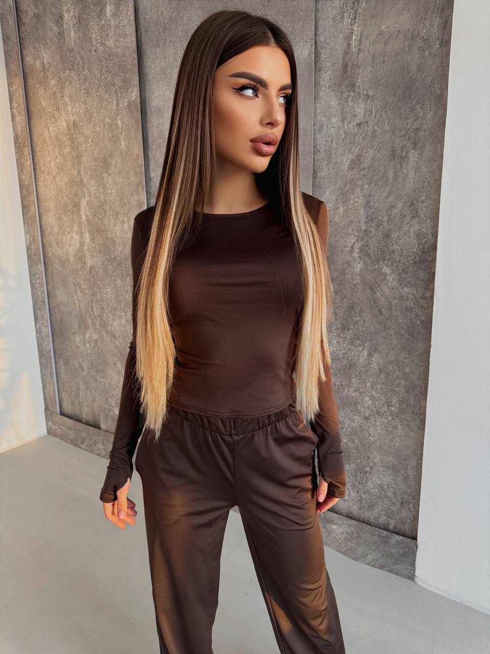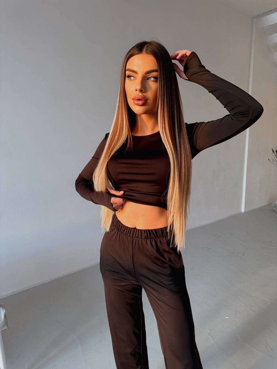 Лонгслів має вирізи для пальців на рукавах, що додає практичності. Штани палаццо з прямим широким кроєм забезпечують свободу рухів та створюють сучасний силует. Тканина приємна до тіла та сприяє комфортній посадці.