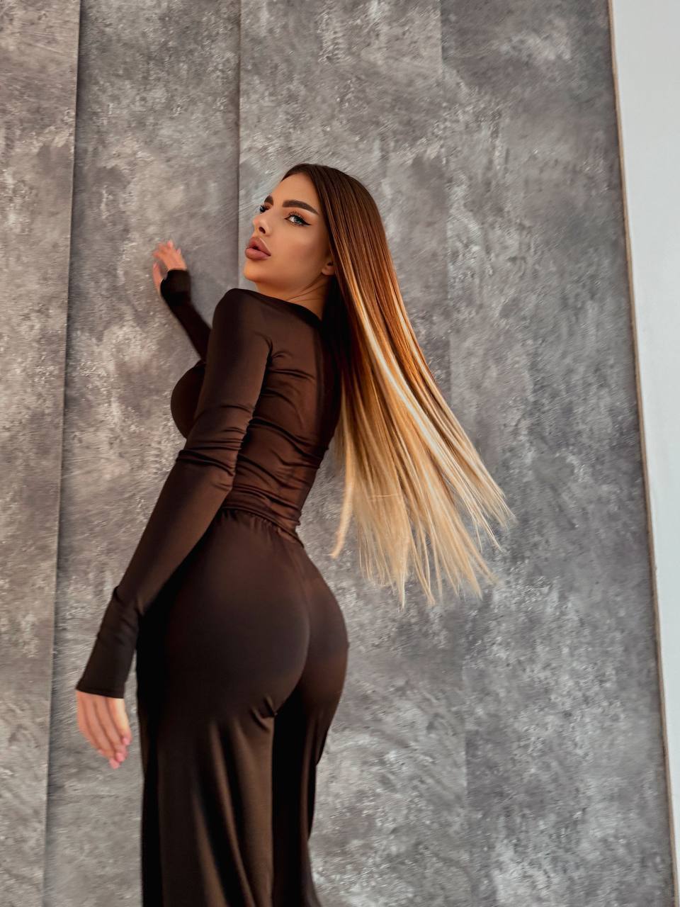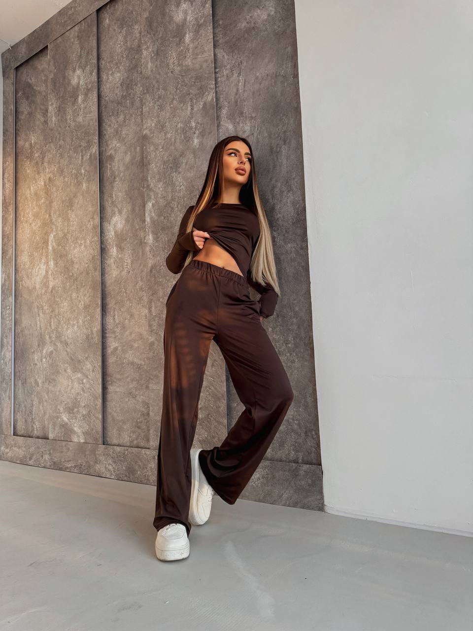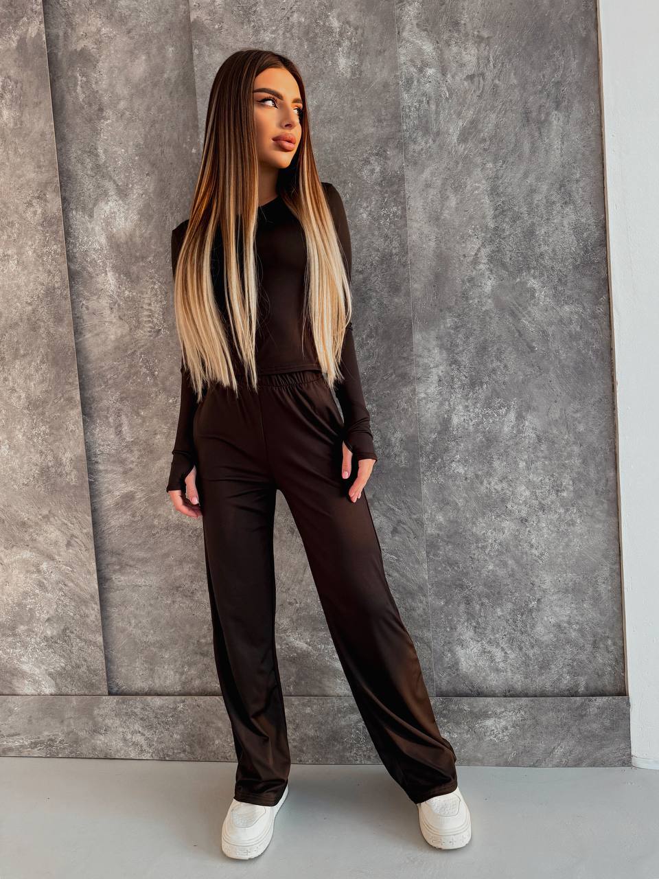 Жіночий костюм, що складається з лонгсліва та штанів палаццо — зручний варіант для повсякденного гардеробу.