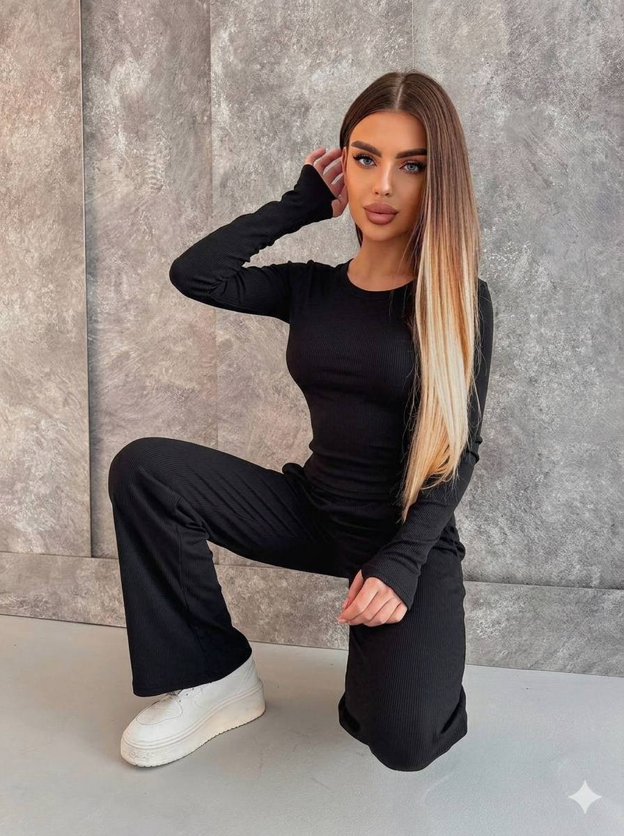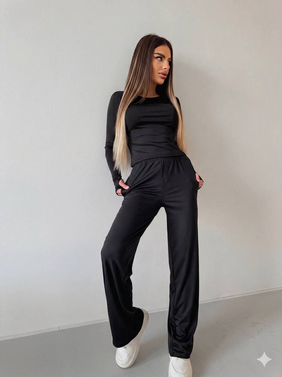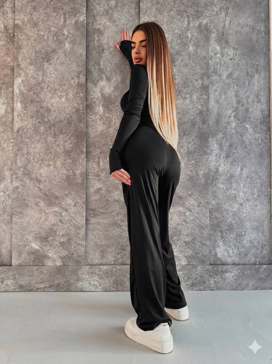 Лонгслів має вирізи для пальців на рукавах, що додає практичності. Штани палаццо з прямим широким кроєм забезпечують свободу рухів та створюють сучасний силует. Тканина приємна до тіла та сприяє комфортній посадці.