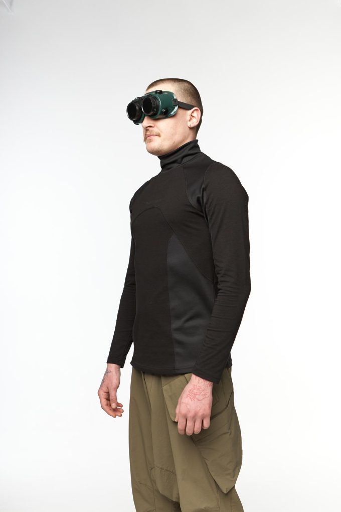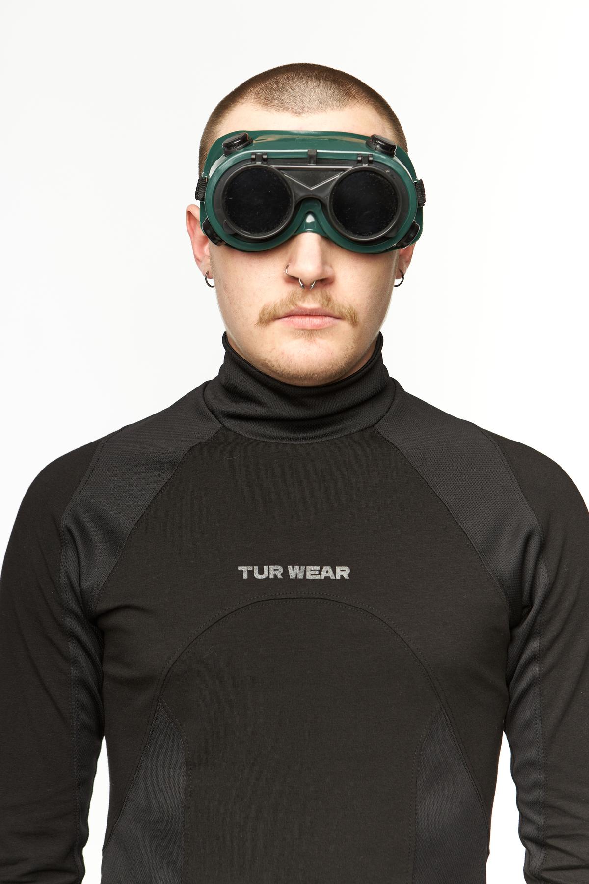 Лонгслів слім крою з високою горловиною. Виріб має складний анатомічний крій. На внутрішній стороні рукавів та по бокам виробу вставки з кулмаксу для кращого теплообміну. На грудях фірмовий принт чорного кольору Tur wear.
