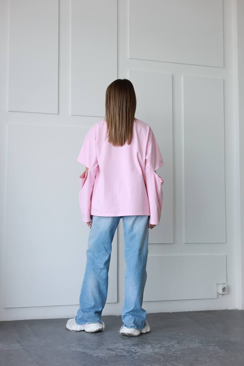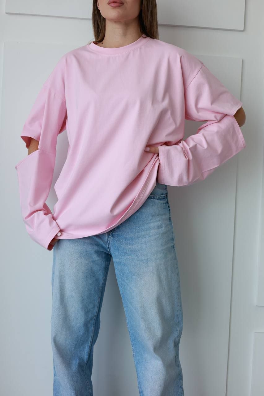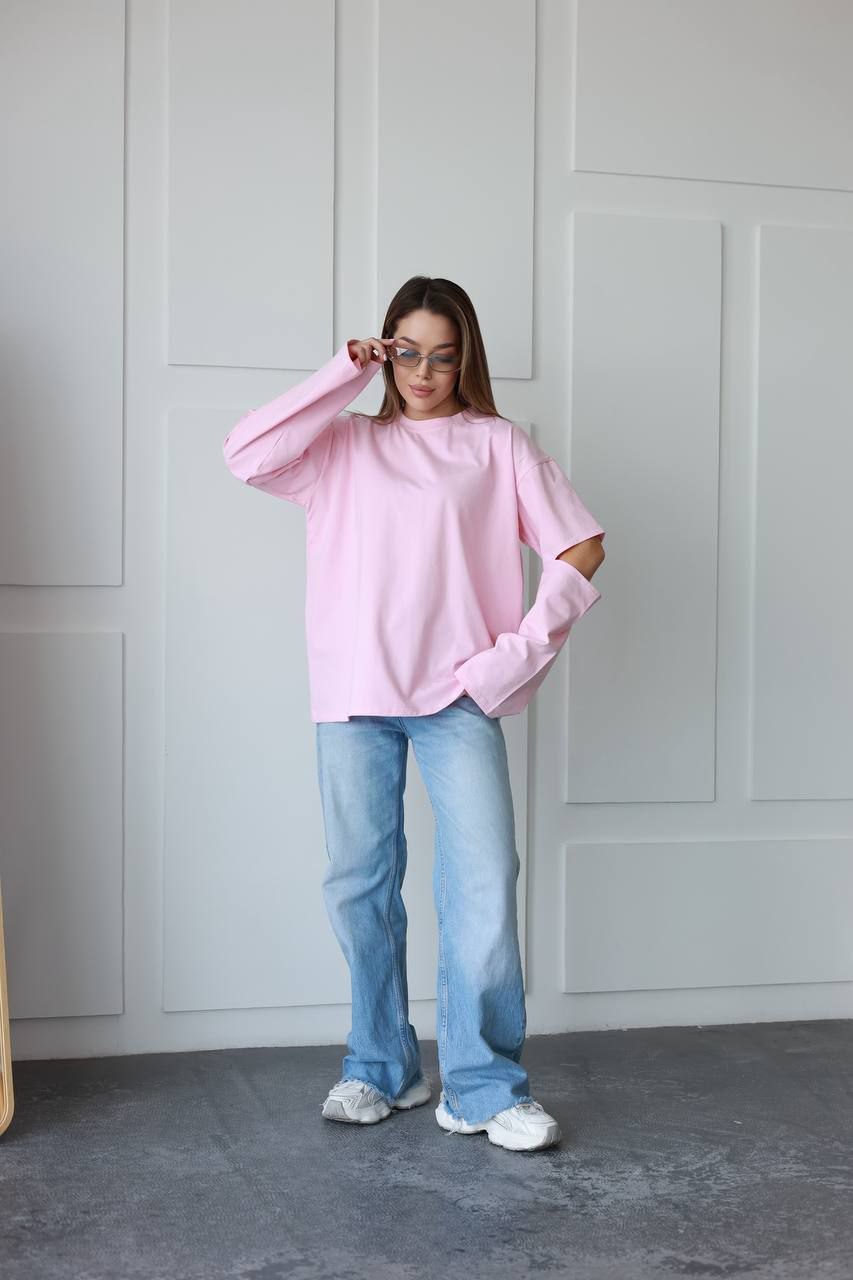 Модель має декоративні вирізи на рукавах, що додають сучасного вигляду та акцентують дизайн виробу. Лонгслів легко поєднується з джинсами, штанами або спідницями.