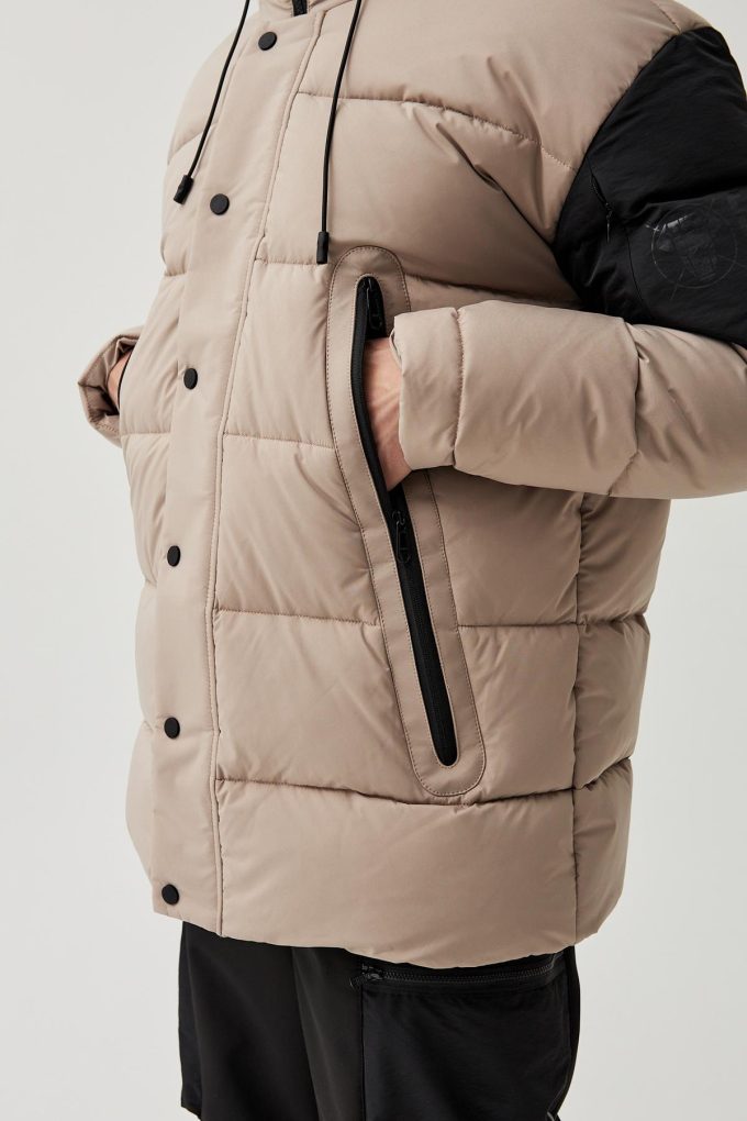 Пуховик середньої довжини , з високим коміром і капюшоном. Планка з прихованою блискавкою та кнопками спереду, прорізні кишені спереду,на лівому рукаві кишеня з фірмовим принтом чорного кольору. По низу виробу – шнур резинка з фіксаторами.