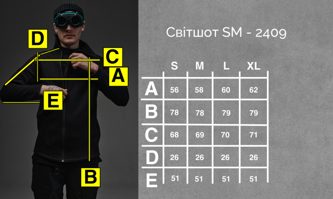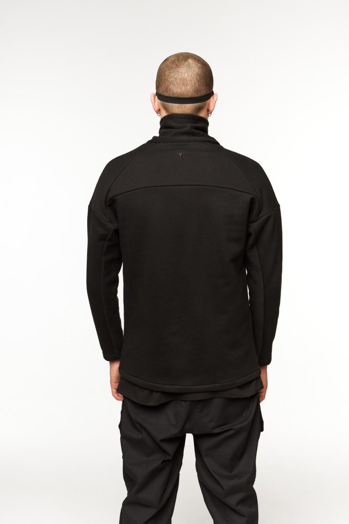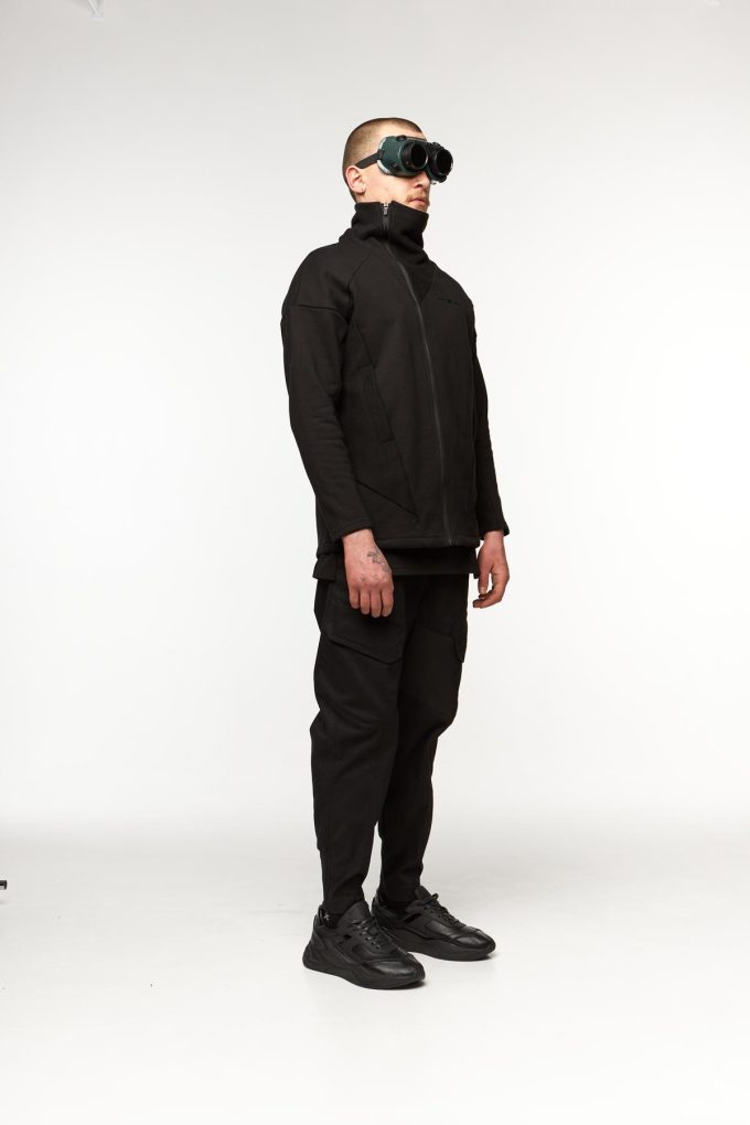 Світшот з щільної тринитки оверсайз крою на блискавці. По всьому виробу вставки з основної тканини, діагоналлю навиворіт. На плечах імітація реглану. Містить дві кишені з листочками. Фірмові принти чорного кольору в районі серця та на спинці.