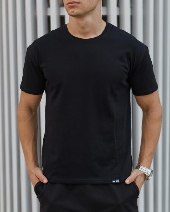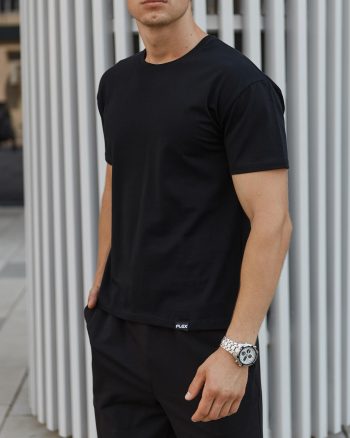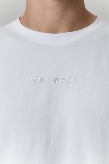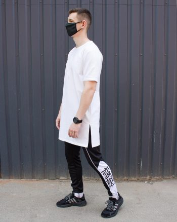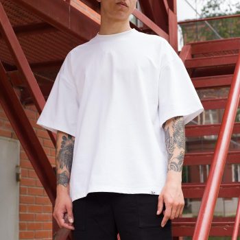 Футболка вільного крою з круглим коміром і подовженими рукавами.