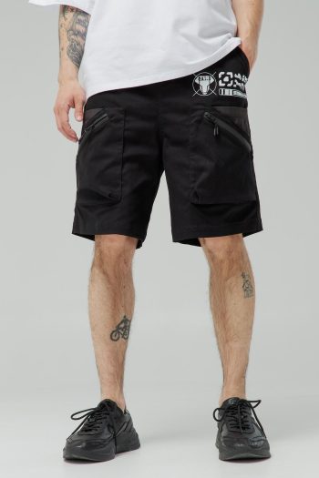 Бокові кишені обʼємні, вхід в кишеню на згибу, закривається блискавкою. На лівій кишені принт чорного кольору.