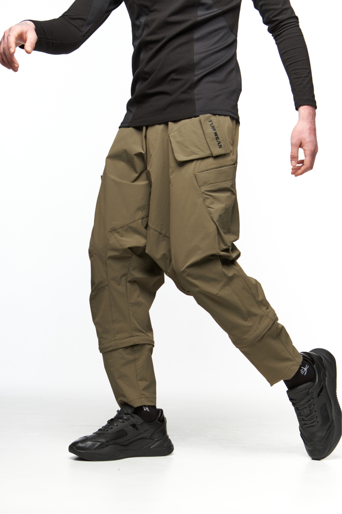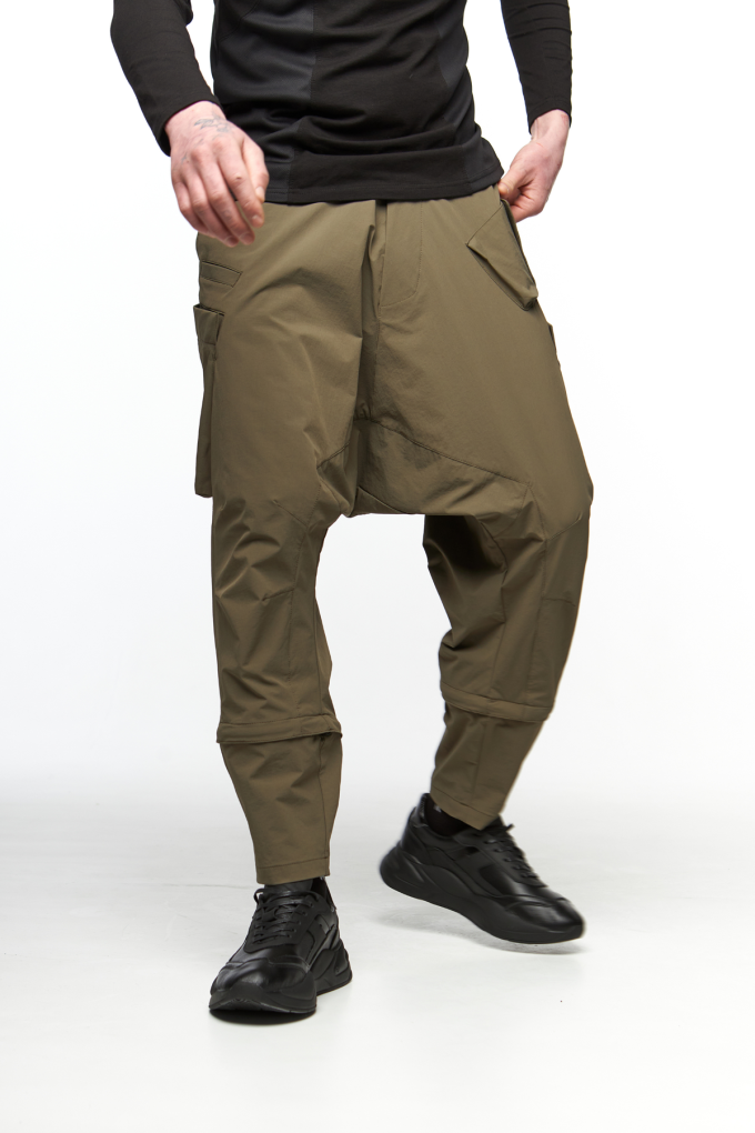Карго штани вільного крою з низькою посадкою та заниженим швом сидіння. Штани виконані з еластичної та легкої тканини.
