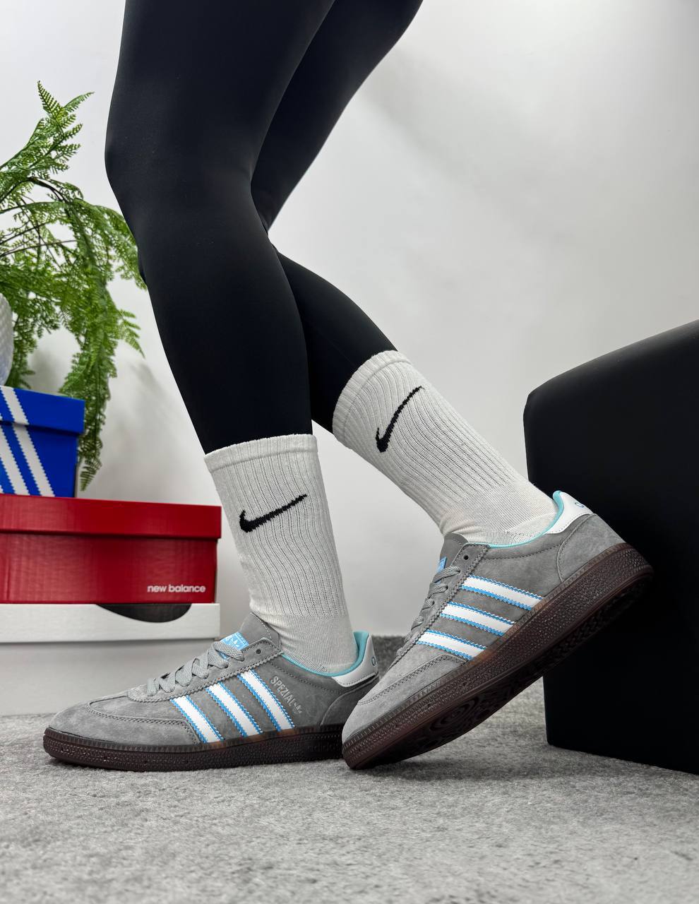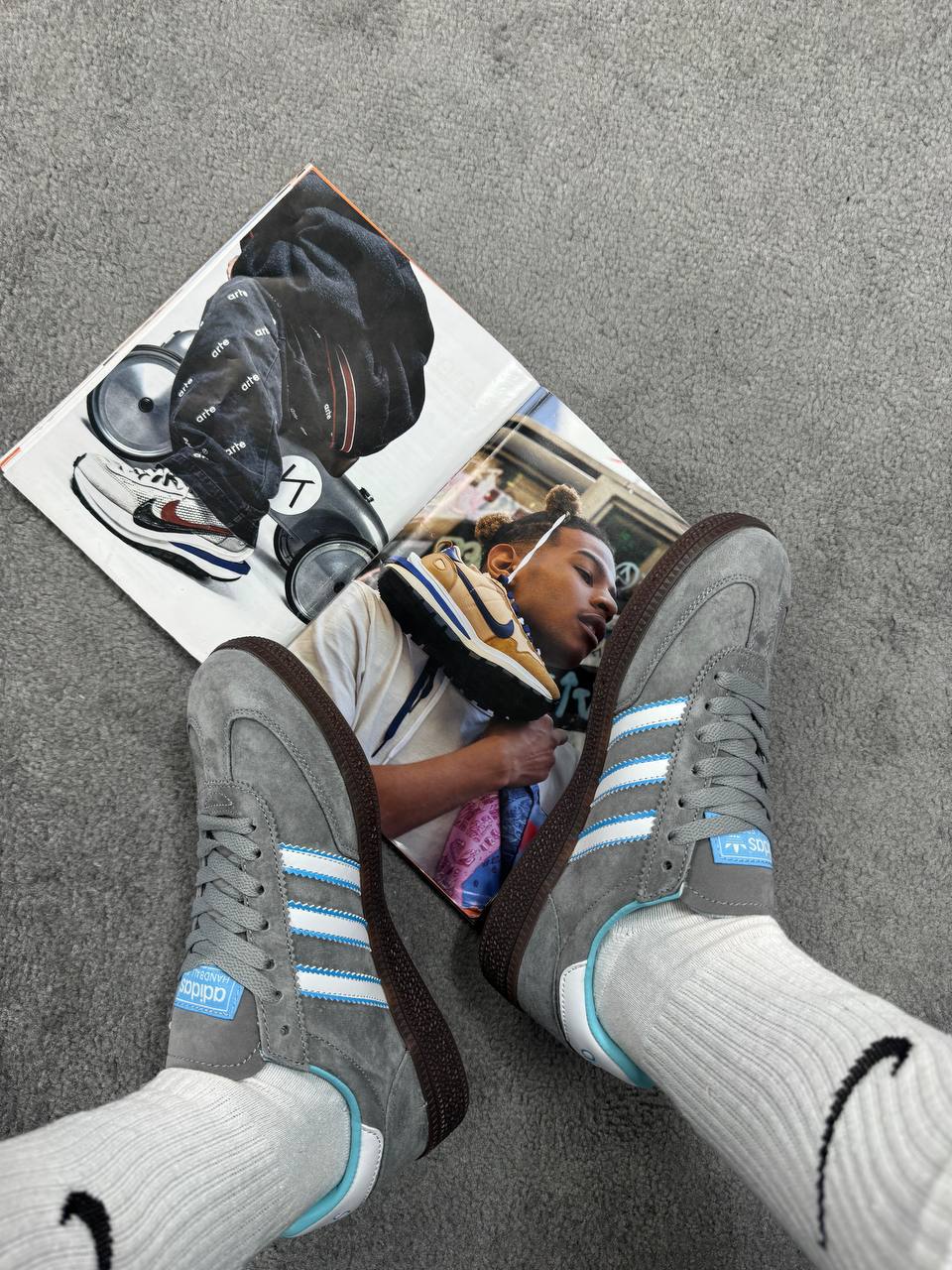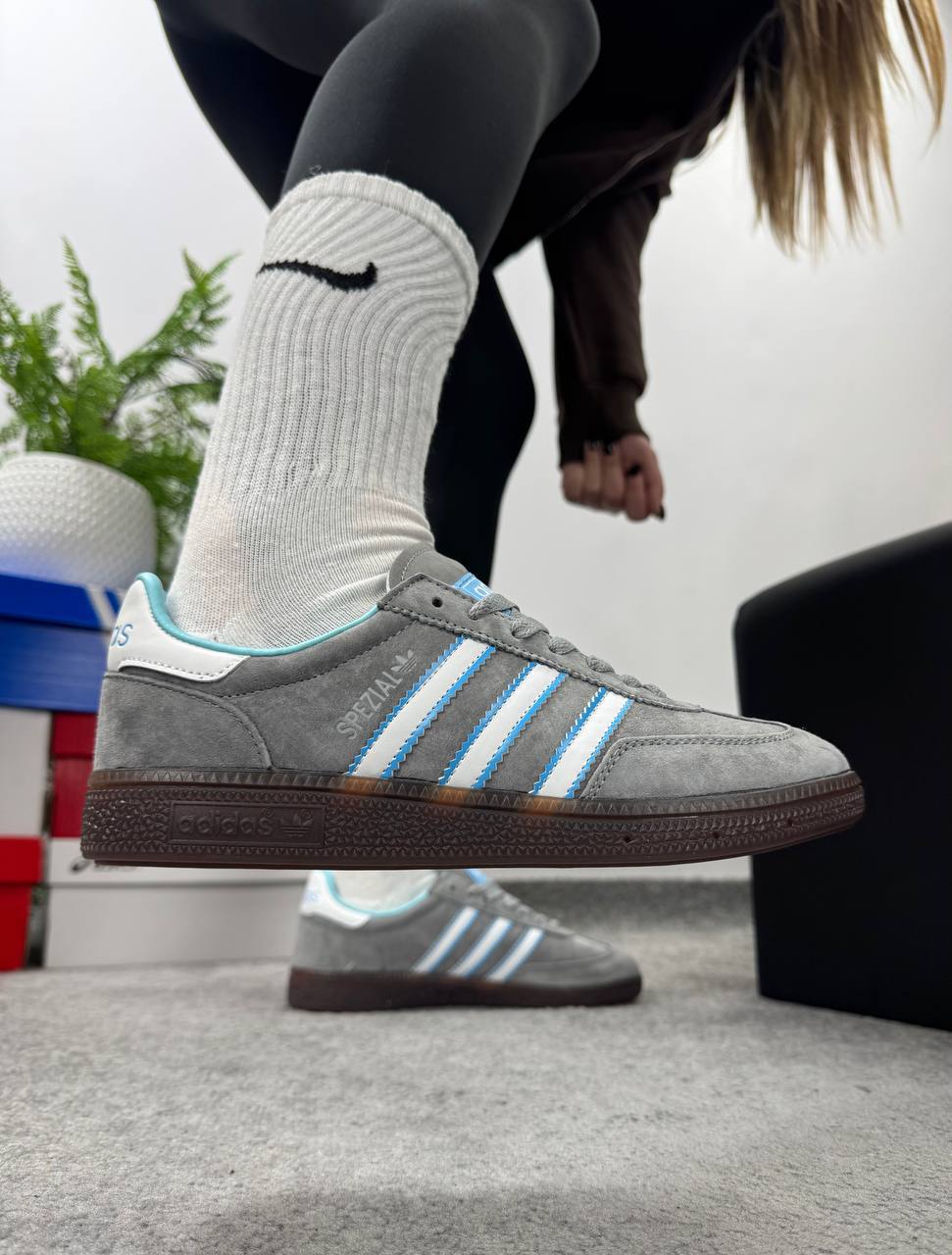 Adidas Handball Spezial Grey Blue — це ретро-кросівки з м’яким замшевим верхом у сіро-блакитних тонах і гумовою підошвою, що поєднують комфорт і класичний спортивний стиль.