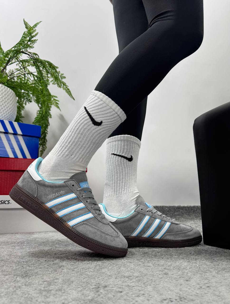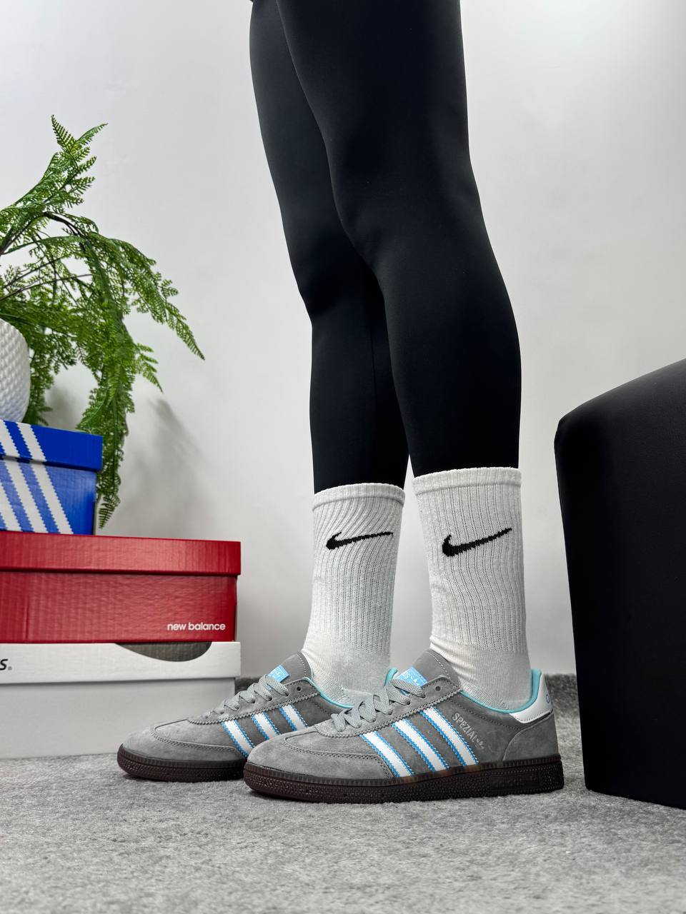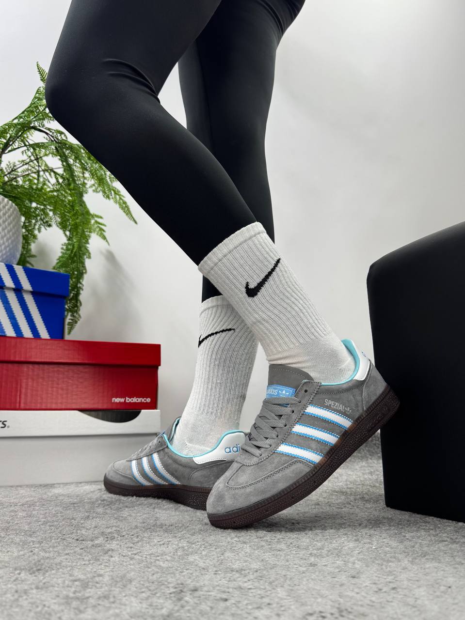 Adidas Handball Spezial Grey Blue — це ретро-кросівки з м’яким замшевим верхом у сіро-блакитних тонах і гумовою підошвою, що поєднують комфорт і класичний спортивний стиль.
