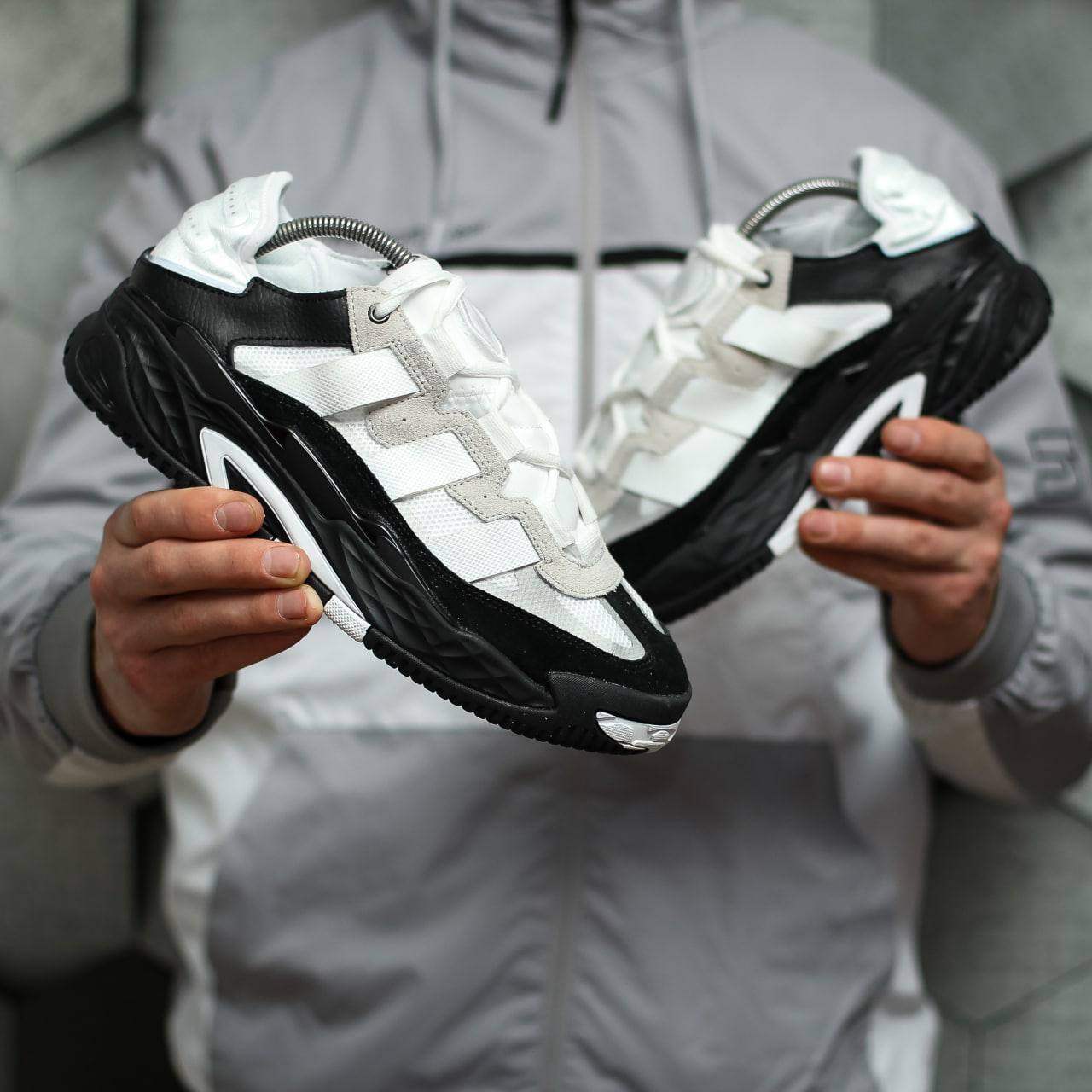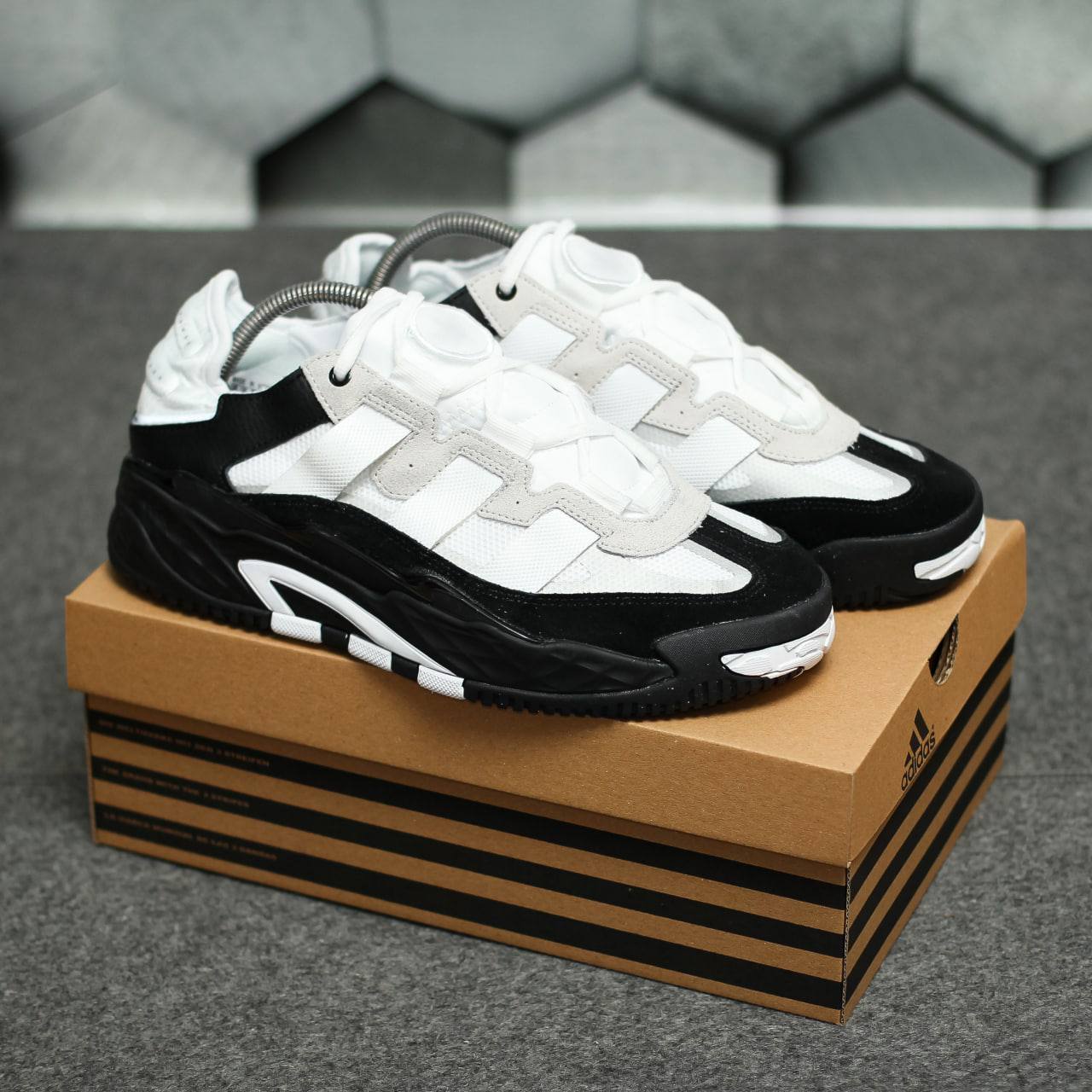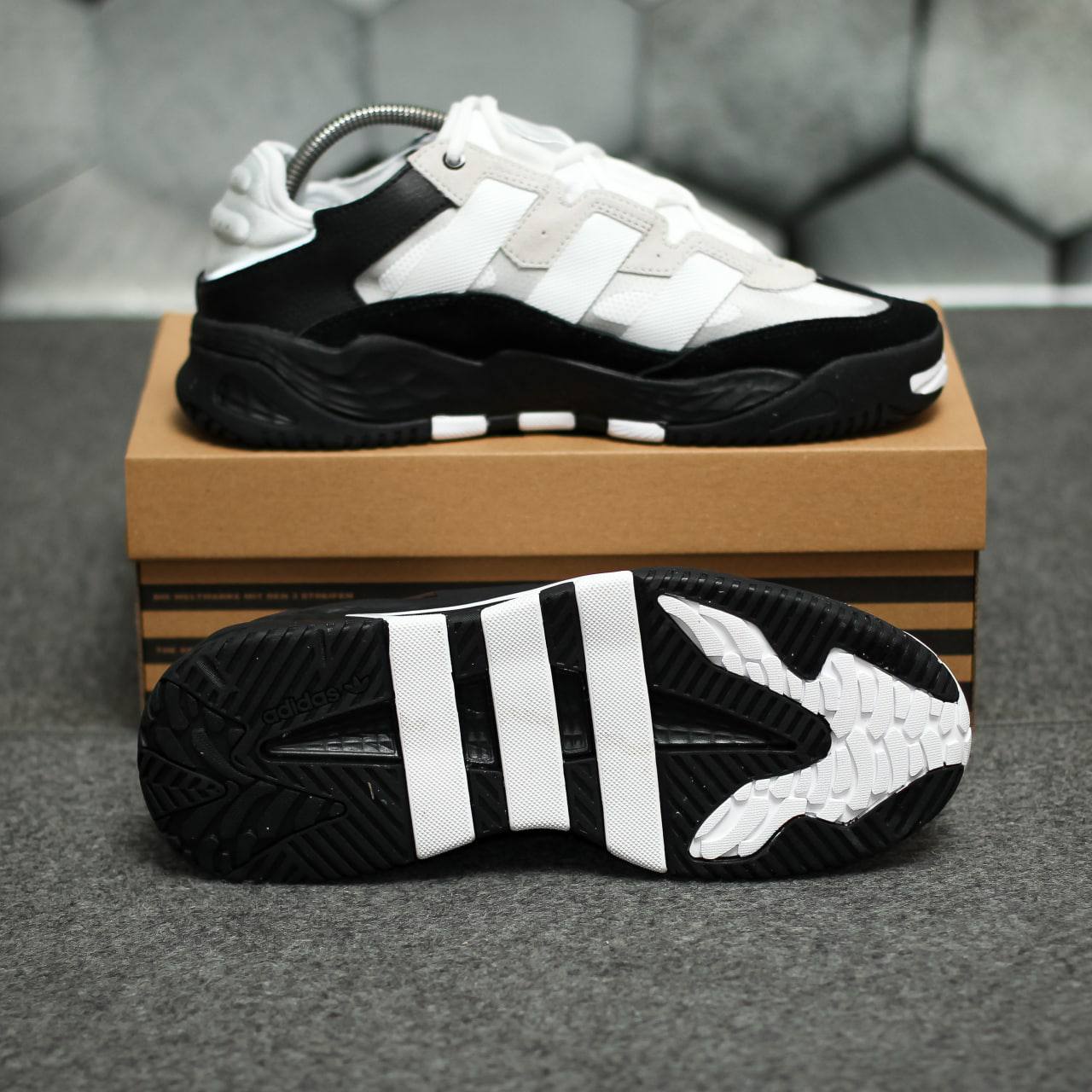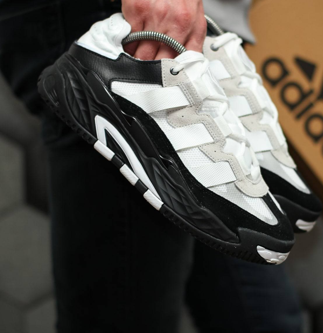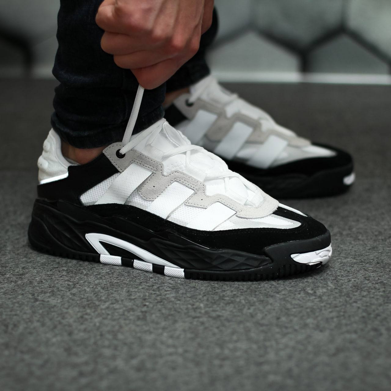 Adidas Niteball  — це виразні кросівки в біло-чорному кольорі з масивним силуетом і світловідбивними деталями, натхненні баскетбольним стилем 90-х.