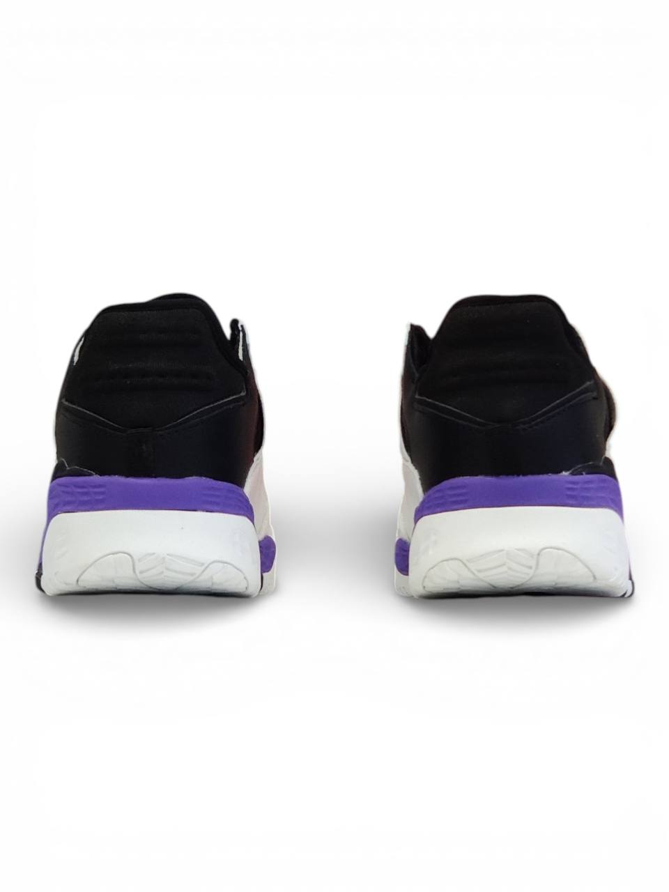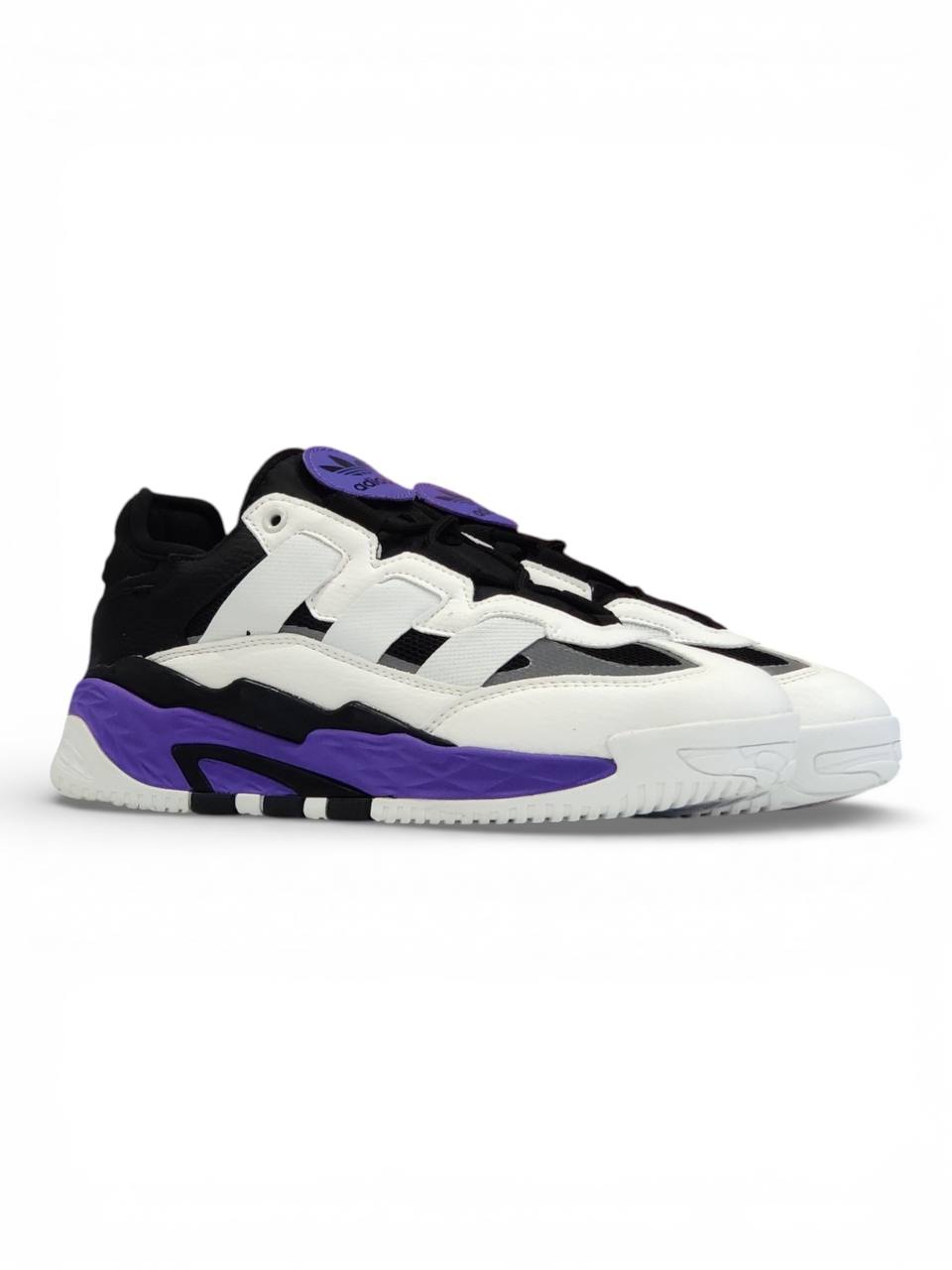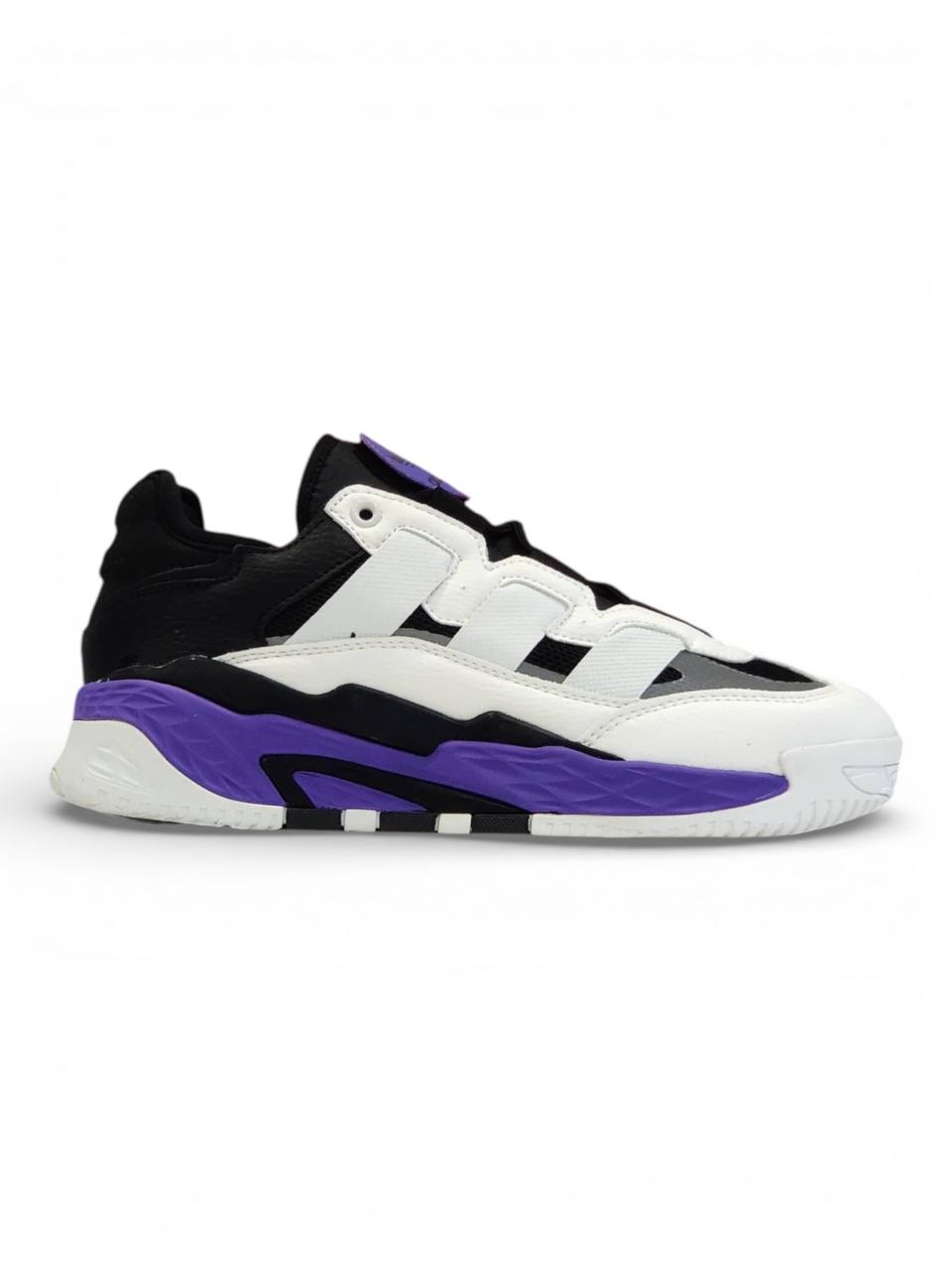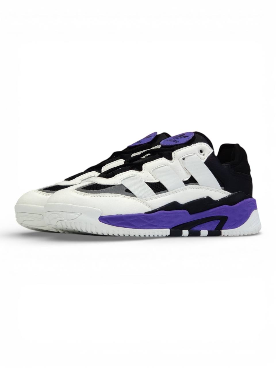 Adidas Niteball White Black Violet — це сучасні кросівки у білому, чорному та фіолетовому поєднанні з масивною підошвою, що поєднують баскетбольний стиль, міцні матеріали та комфорт для щоденного носіння.