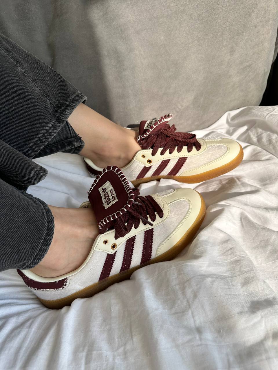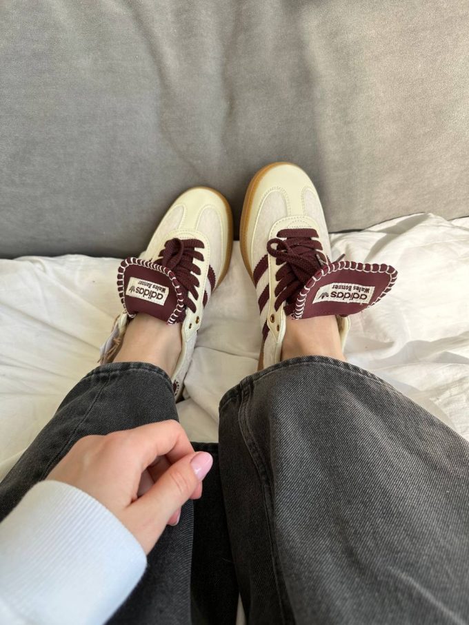 Adidas Samba Wales Bonner Cream Bordo — це стильні кросівки, що поєднують класичний дизайн Adidas Samba з вишуканими деталями від британського дизайнера Wales Bonner, виконані в кремових та бордових тонах для створення елегантного, сучасного вигляду.