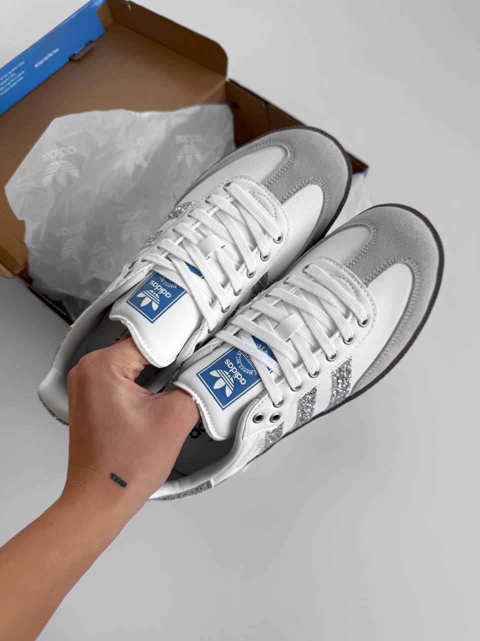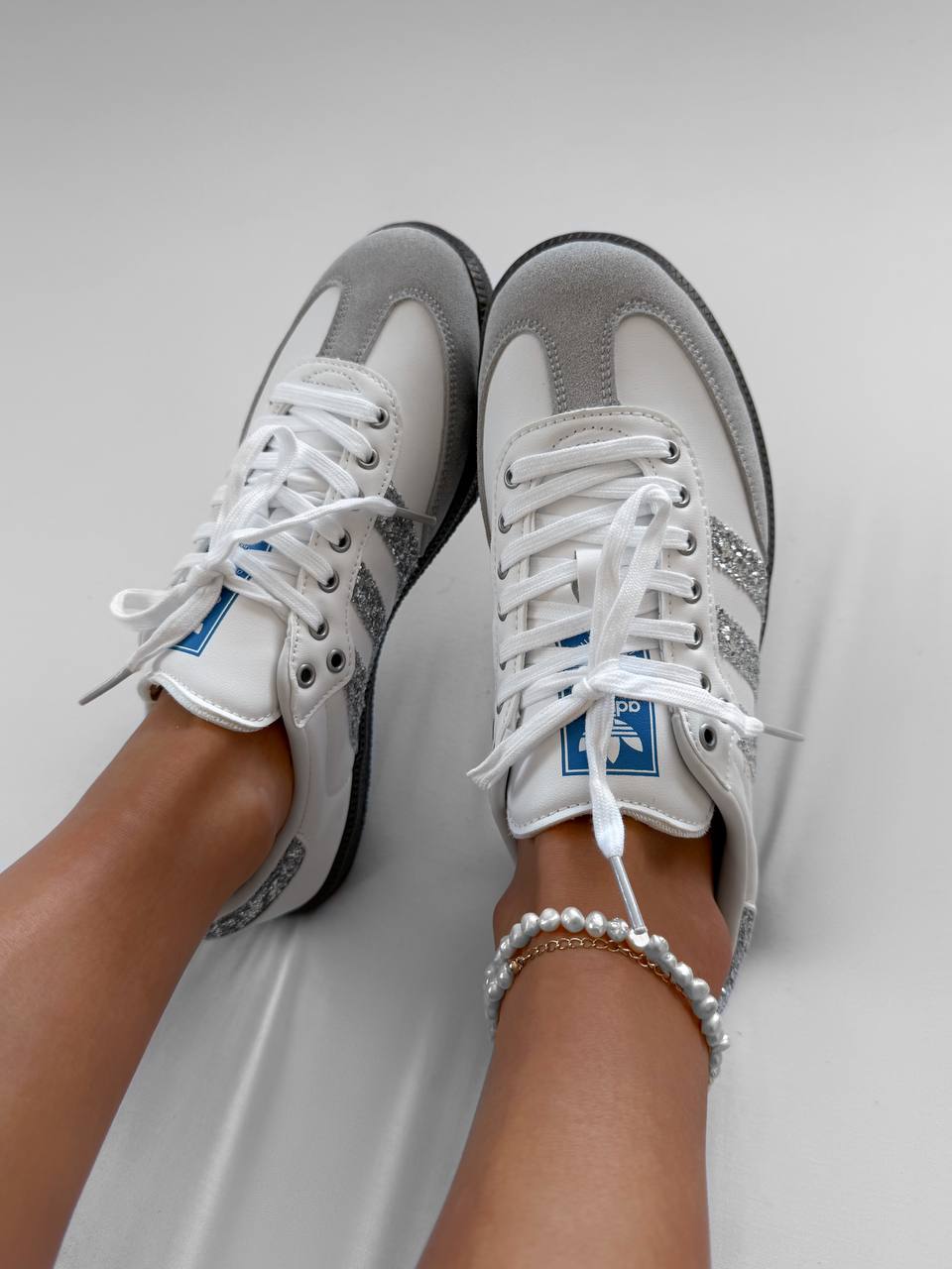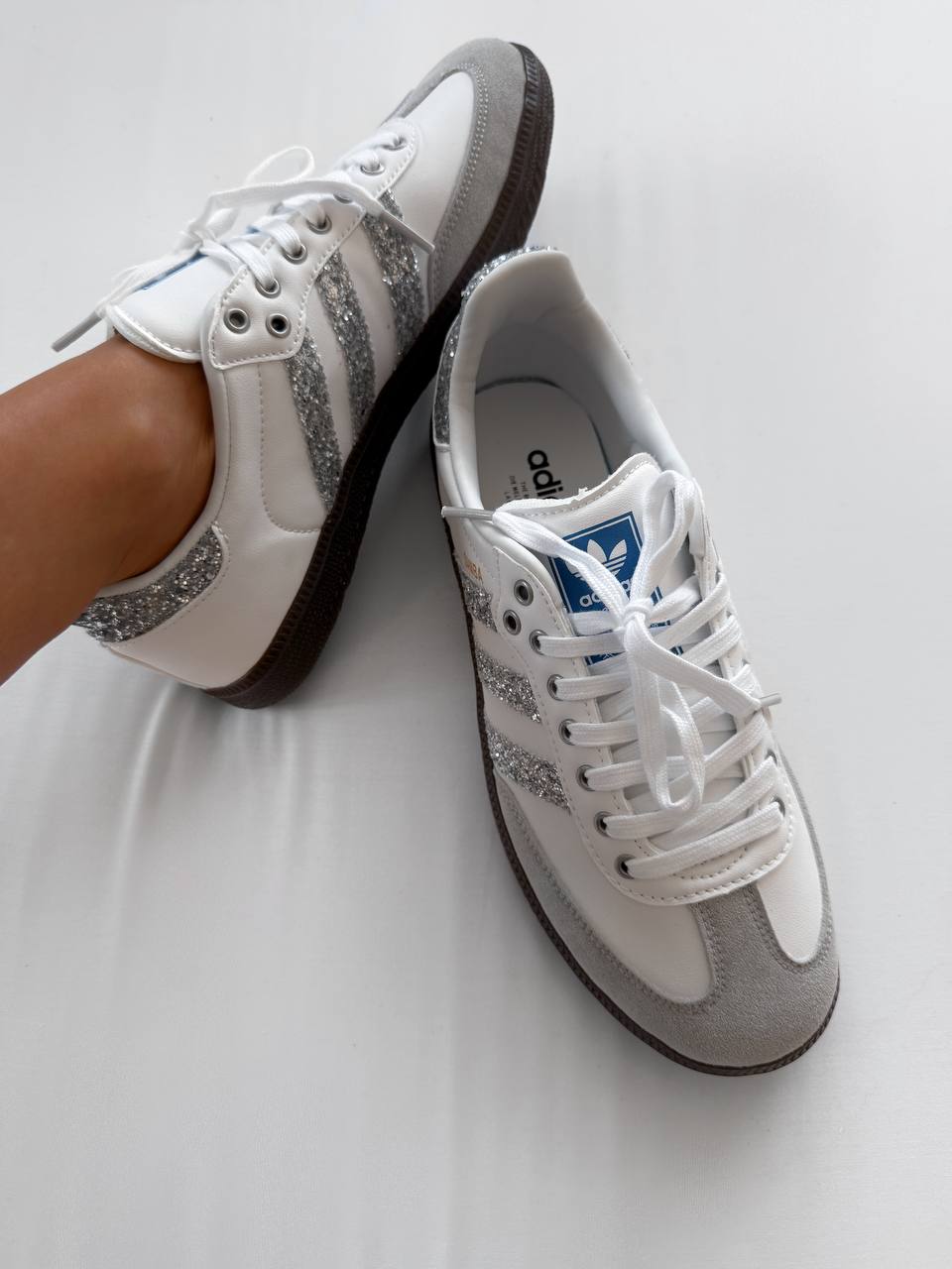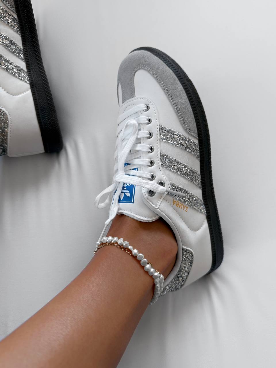 Adidas Samba White Glitter Shine — це стильні кросівки класичного силуету Samba з білою основою та блискучими глітерними акцентами, що додають яскравого й сучасного вигляду.
