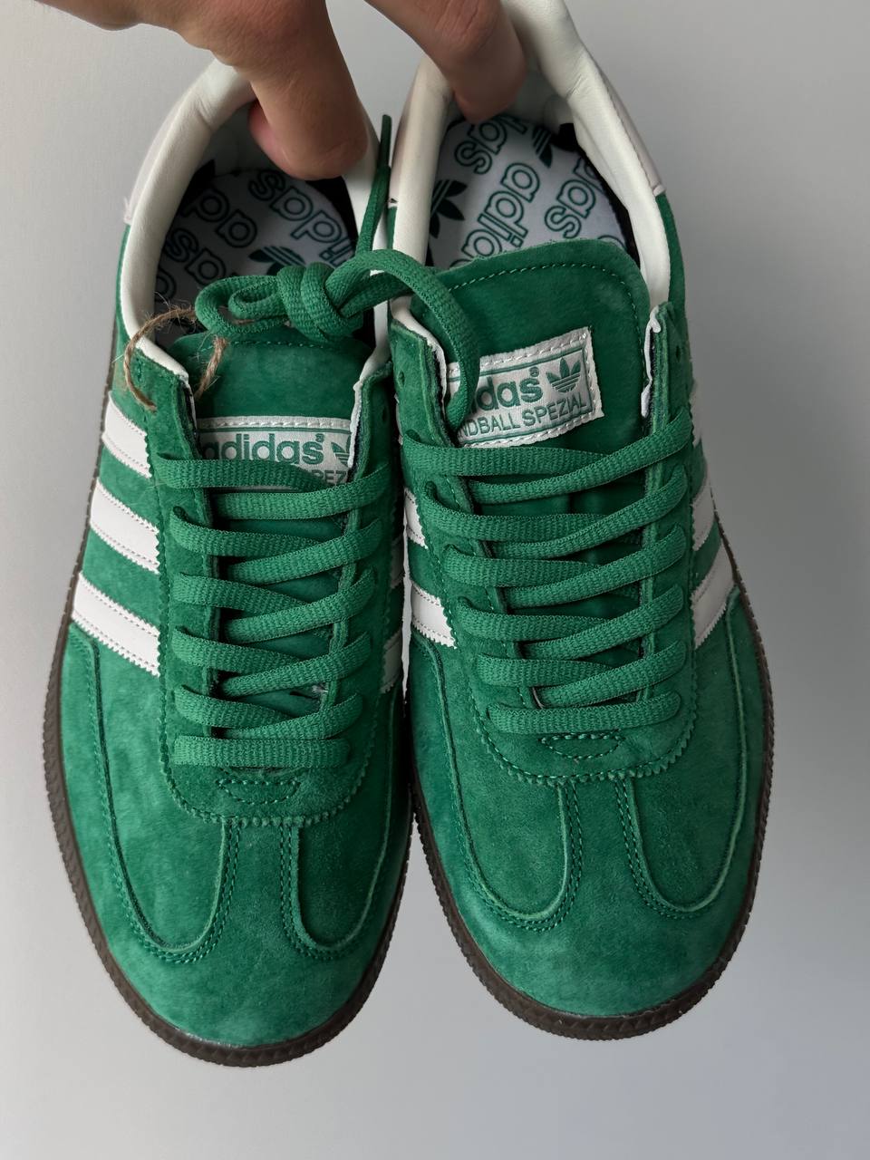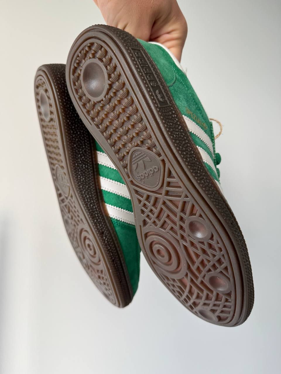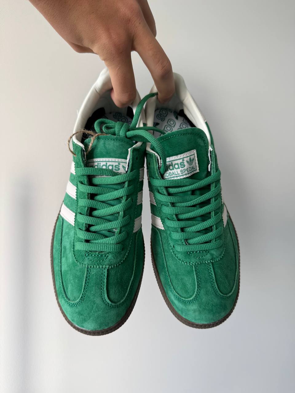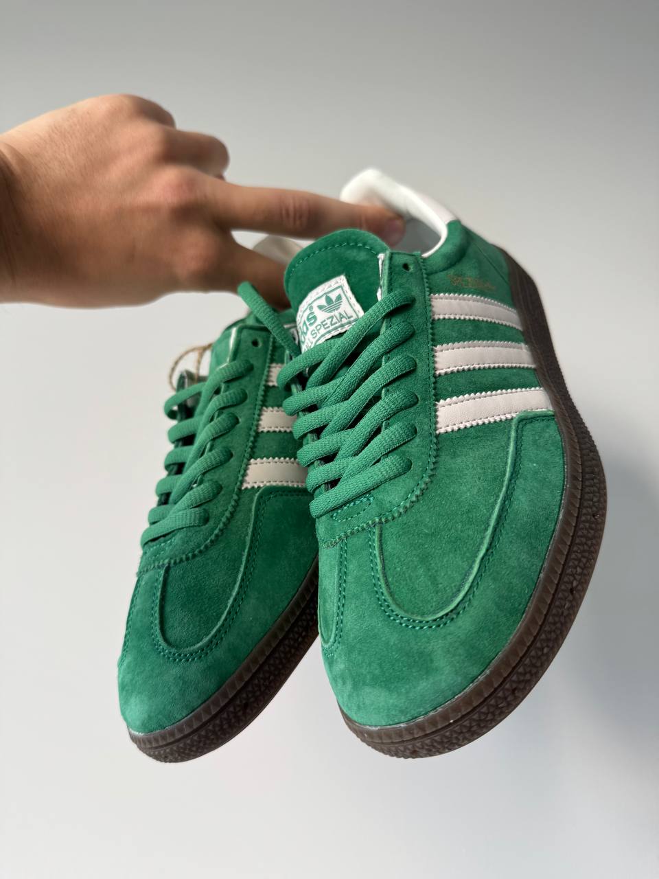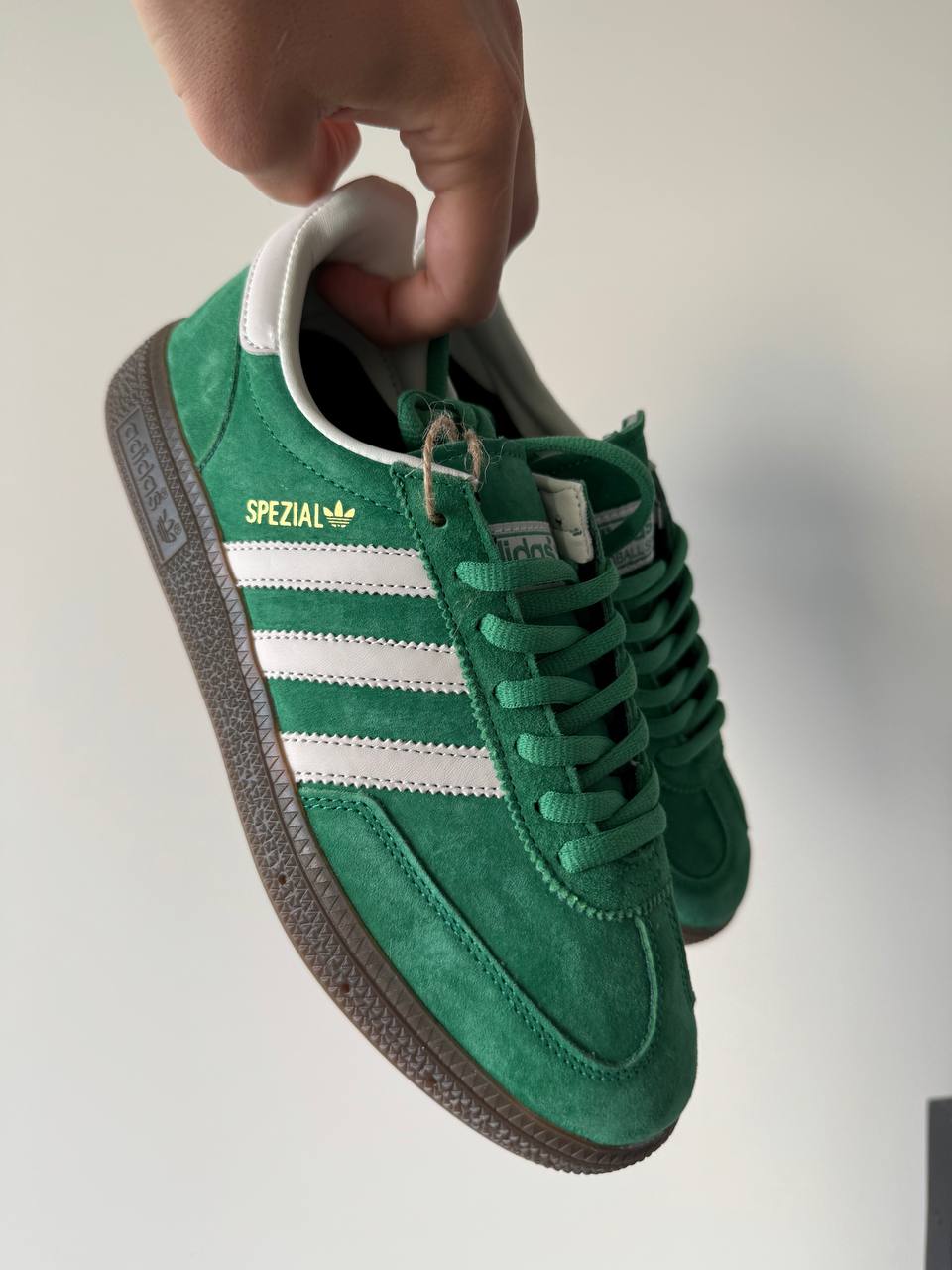 Adidas Spezial Green White — це поєднання класичного ретро-силуету, насиченої зелено-білої палітри та щоденного комфорту. Глибокий зелений відтінок у поєднанні з білими акцентами створює свіжий, збалансований образ, який виглядає стильно та підкреслює вінтажну футбольну естетику лінійки Spezial, а фірмовий дизайн додає впізнаваності та характеру.