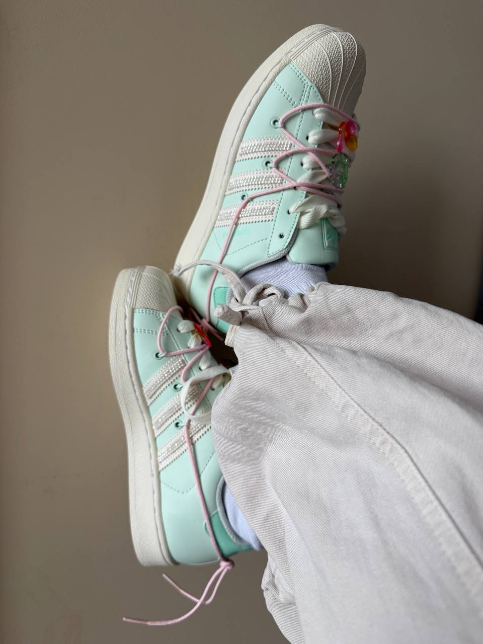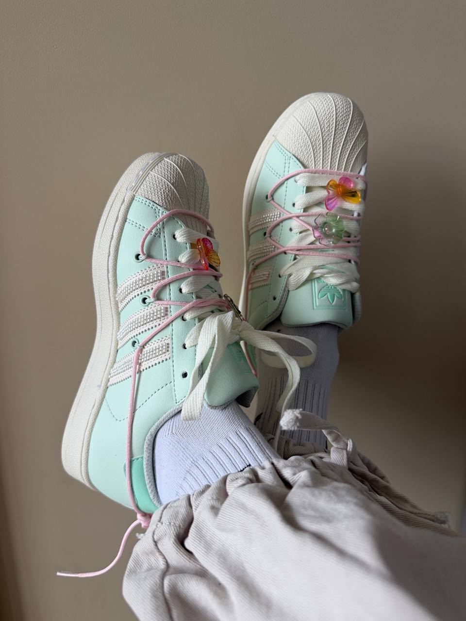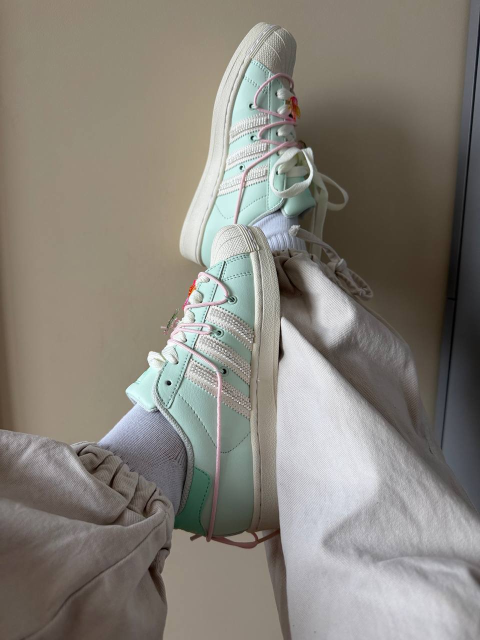 Adidas Superstar Lite Aqua White Double Lace-Up Shoe — це легкі жіночі кросівки в білому та аквамариновому виконанні з подвійною шнурівкою і тонким профілем, що поєднують сучасний стиль і впізнаваний дизайн класичної моделі для повсякденного носіння.