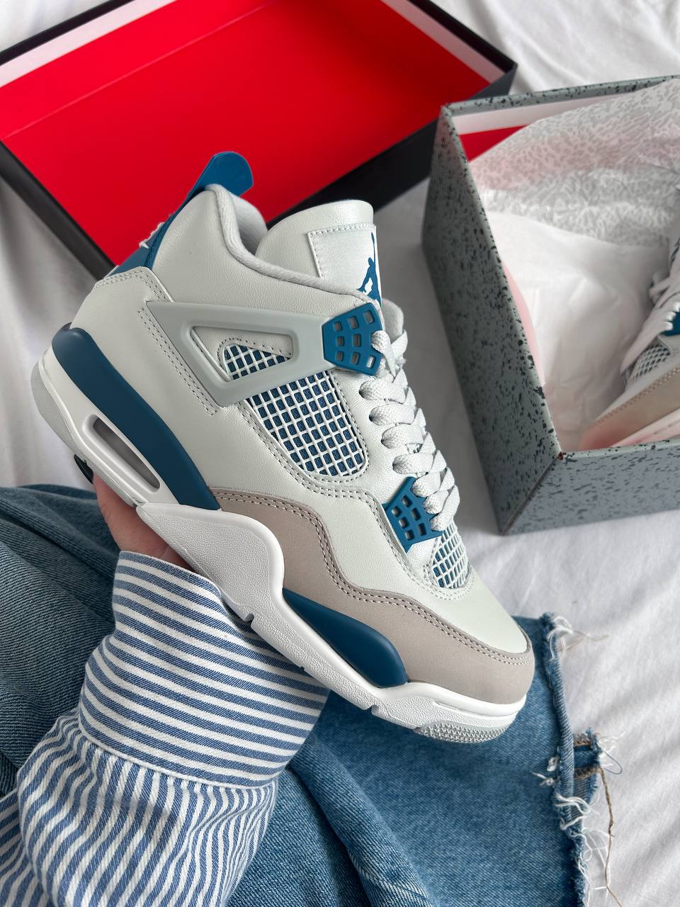 Air Jordan 4 Retro Military Blue — це легендарна модель кросівок з класичним дизайном, яка поєднує білі, сині та сірі кольори, натхненні військовим стилем для створення універсального і стильного вигляду.
