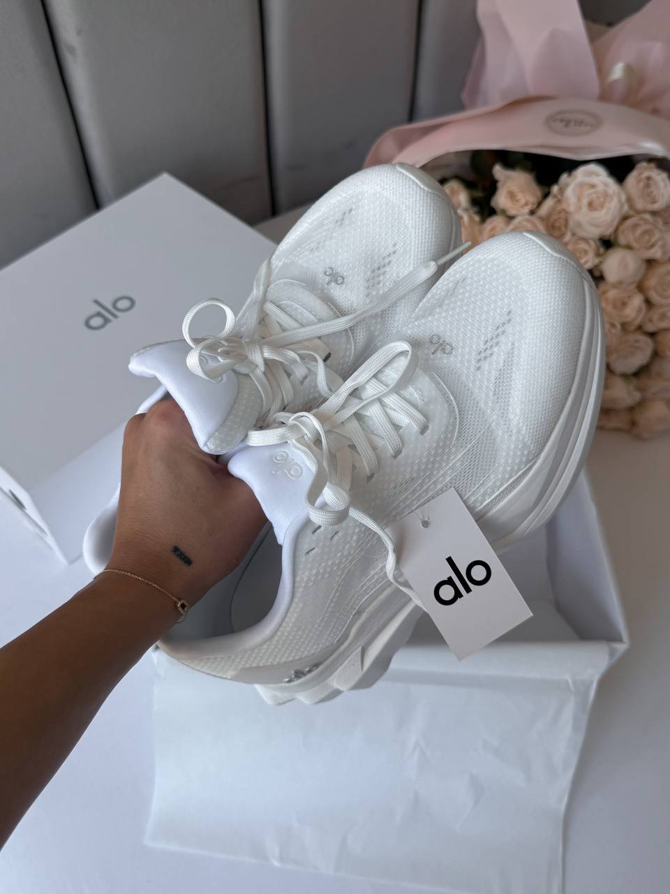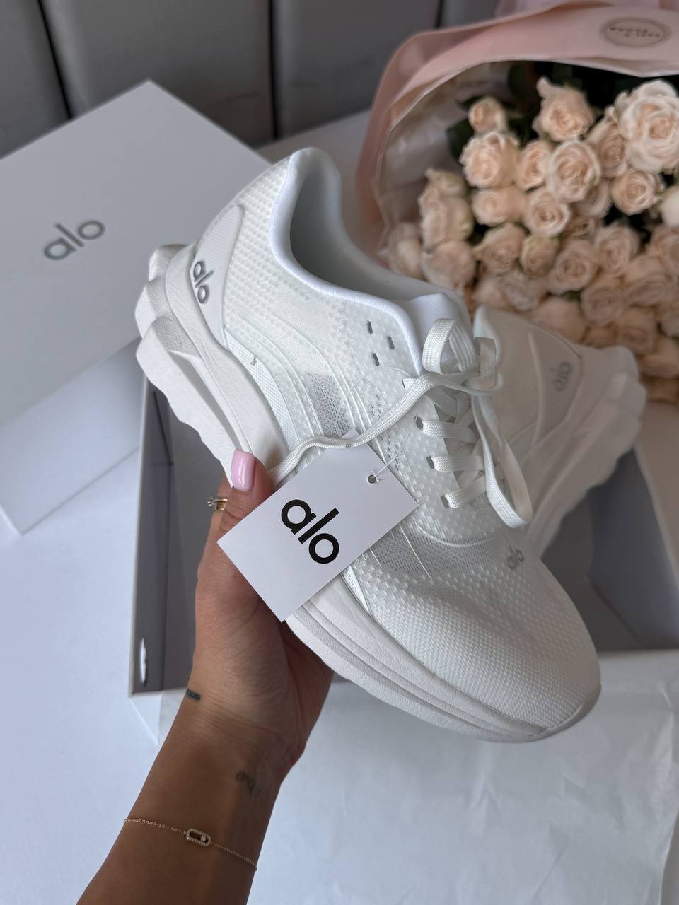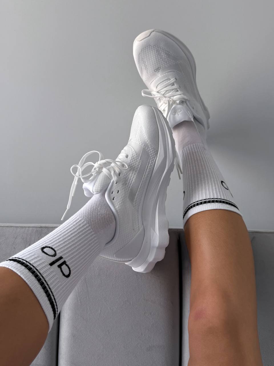 ALO Yoga Runner White — стильні універсальні кросівки з дихаючим подвійним сітчастим верхом, стабілізуючою п’ятковою кліпсою і двошаровою підошвою для комфорту, підтримки та адаптації до різних поверхонь, при цьому виготовлені на 70 % з перероблених матеріалів.