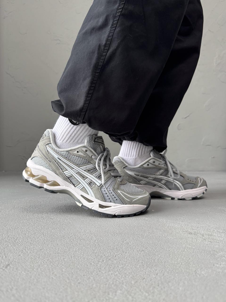 Asics Gel-Kayano 14 Beige/Grey — це стильні кросівки з поєднанням бежевого та сірого кольорів, оснащені технологією Gel для високої амортизації та стабільності, що робить їх ідеальним вибором для тривалих тренувань і повсякденного використання.