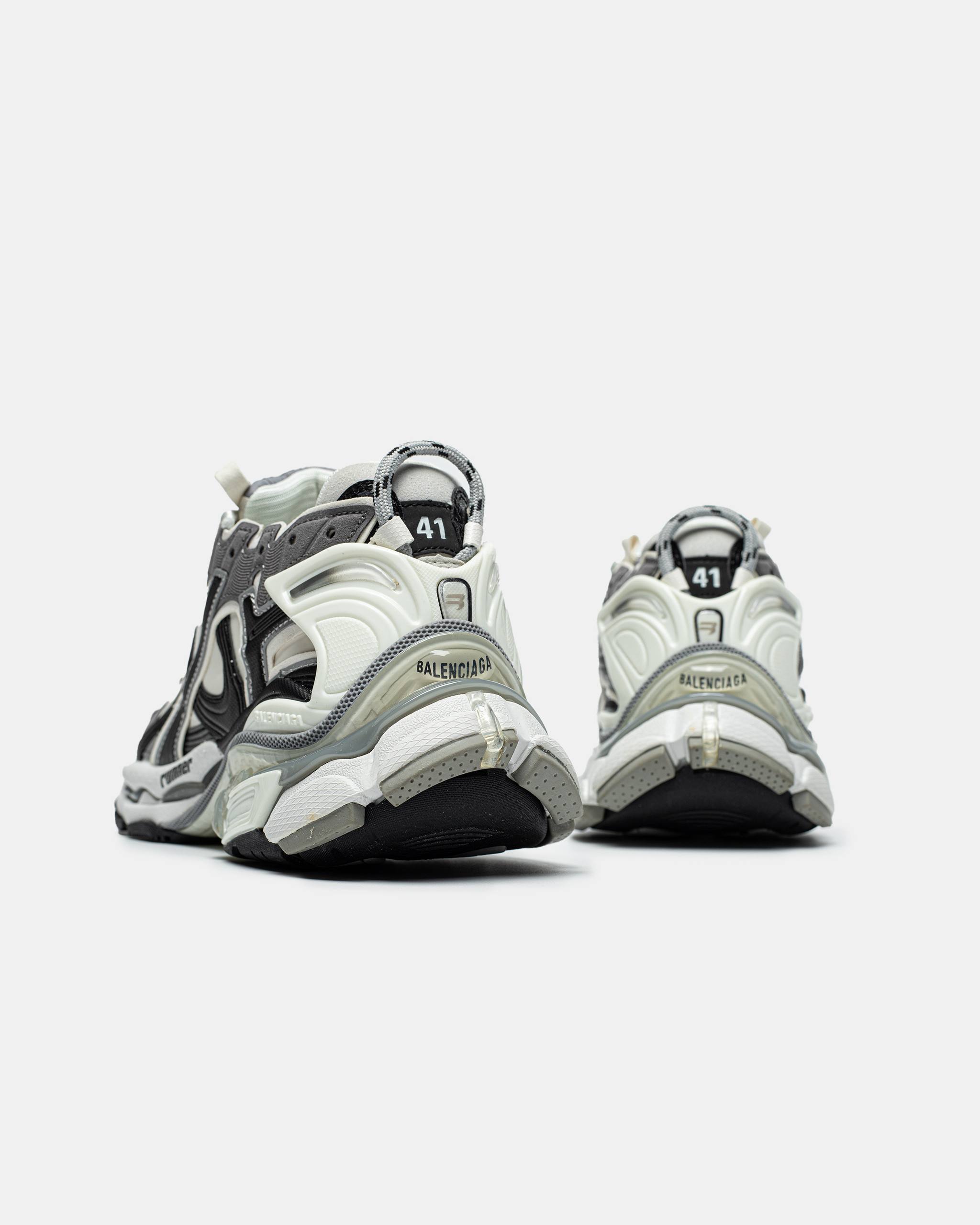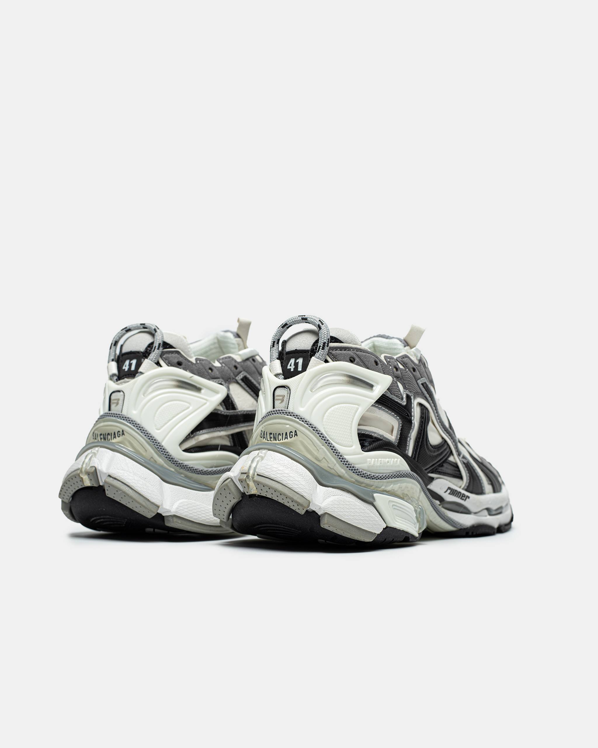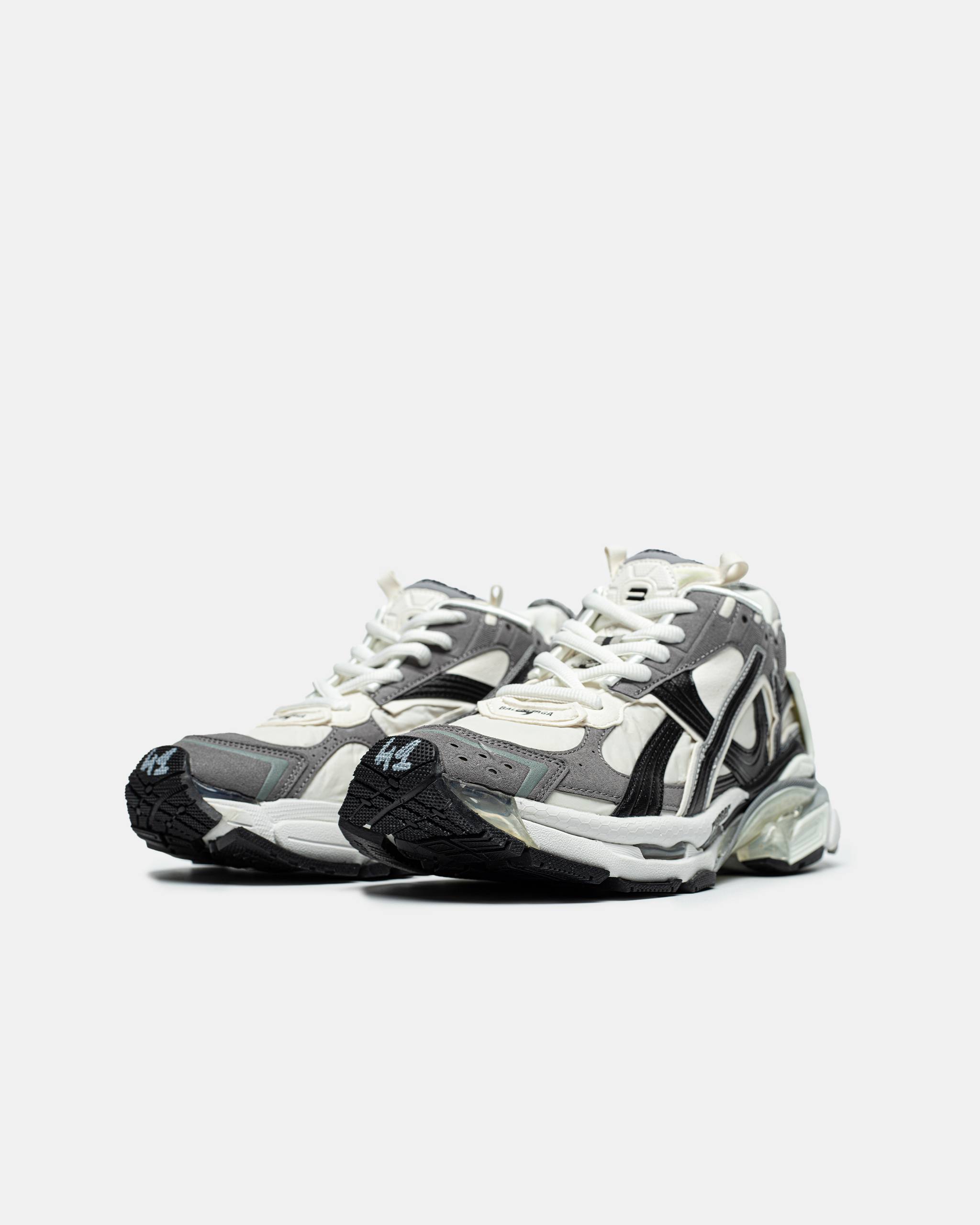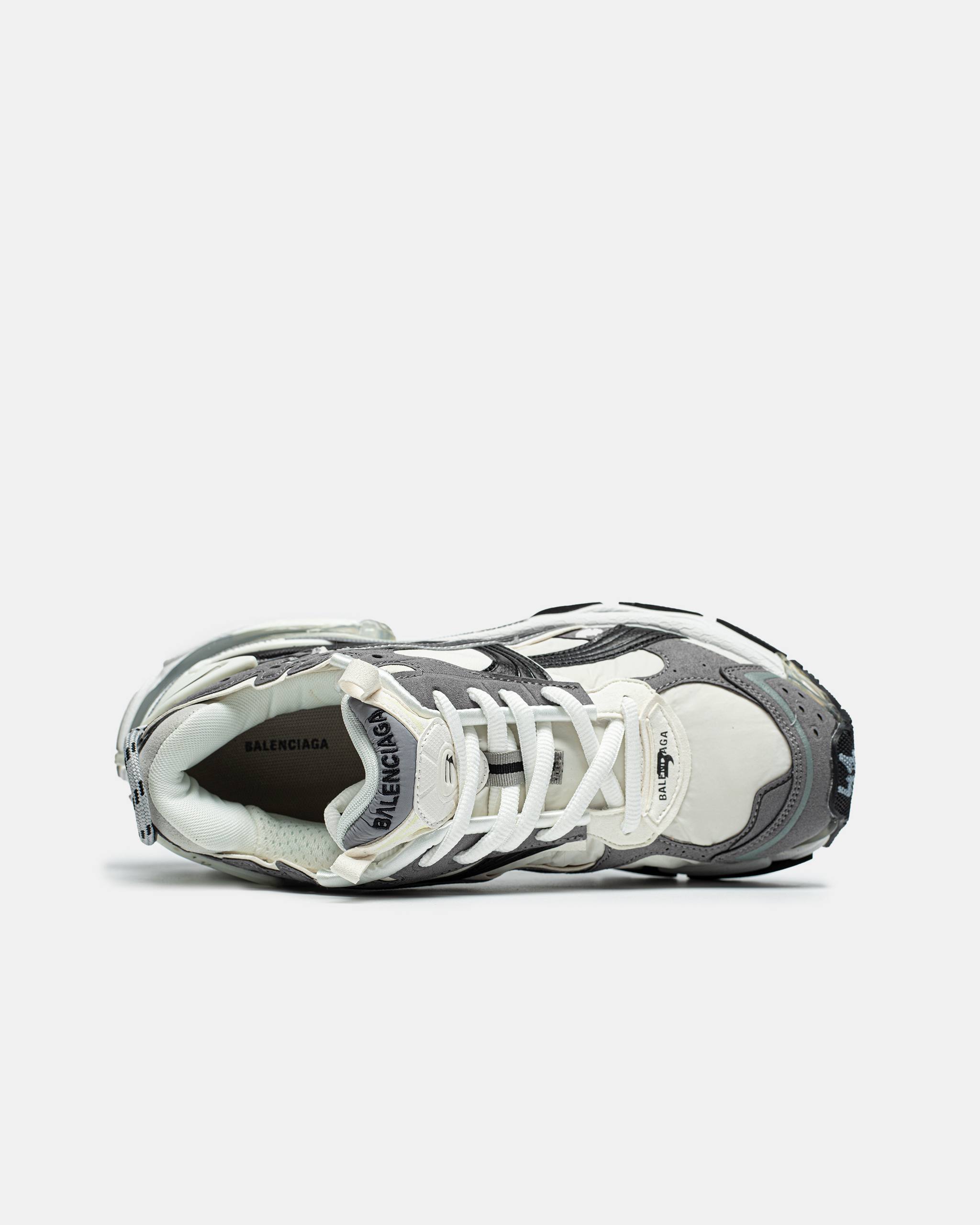 Balenciaga Runner Sneakers — масивні кросівки від Balenciaga у сіро-біло-чорній гамі з багатошаровим дизайном із нейлону та синтетичних матеріалів і характерним зістареним ефектом, що поєднує естетику ретро-бігового взуття з люксовим стрітстайлом.