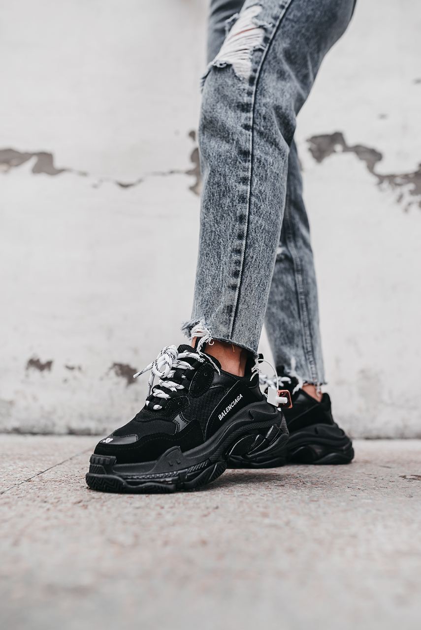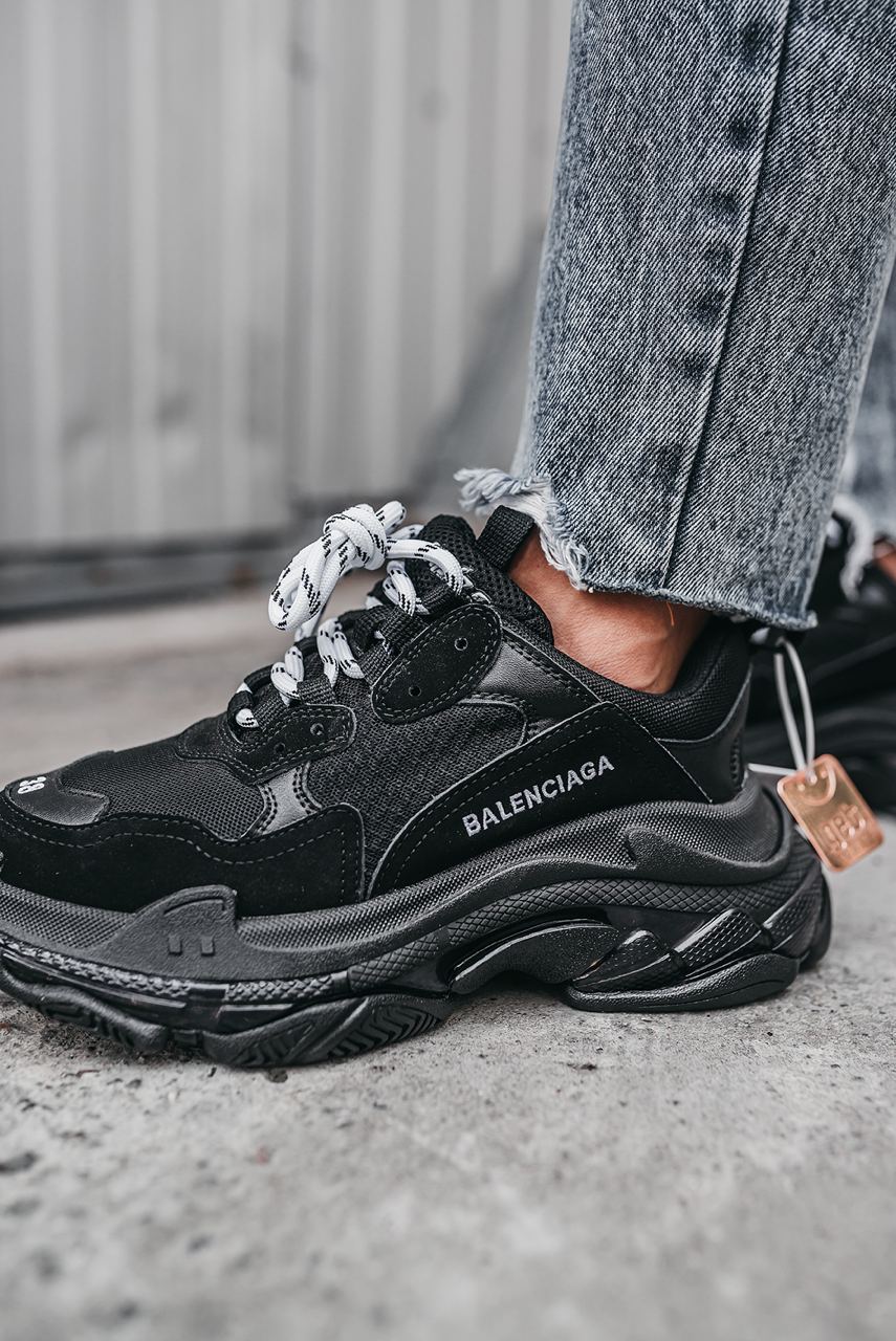 Balenciaga Triple S Black — це масивні чорні кросівки з багатошаровою підошвою та сміливим дизайнерським силуетом, що поєднують люксову естетику зі стрітстайл-характером.