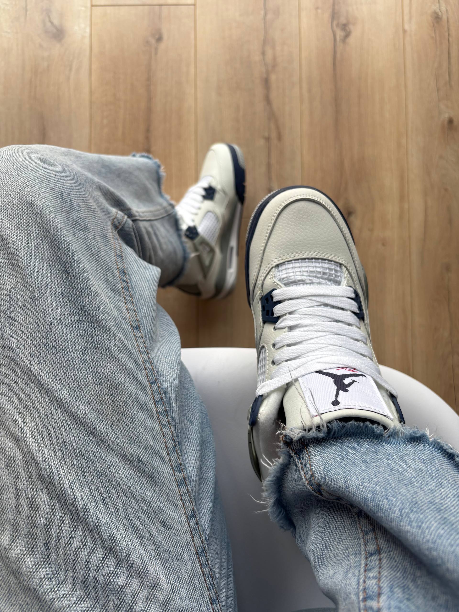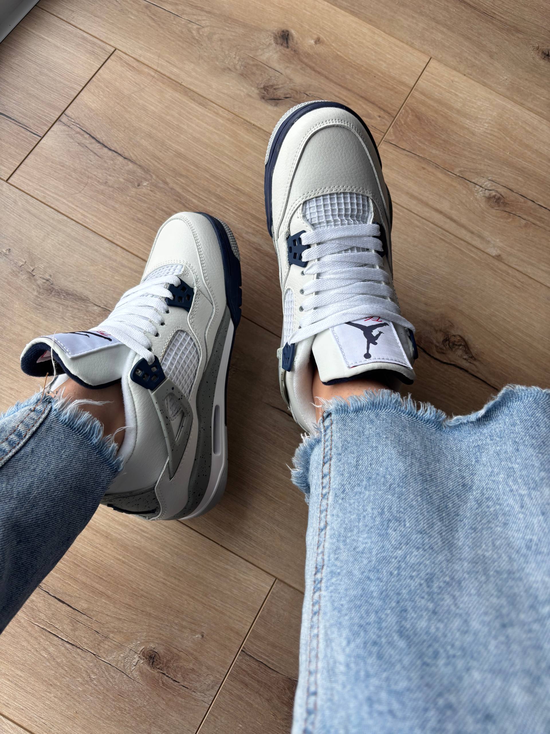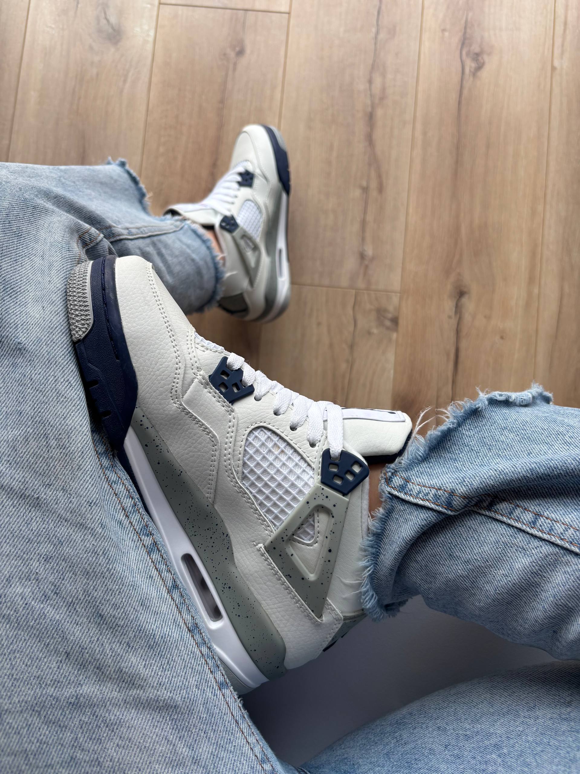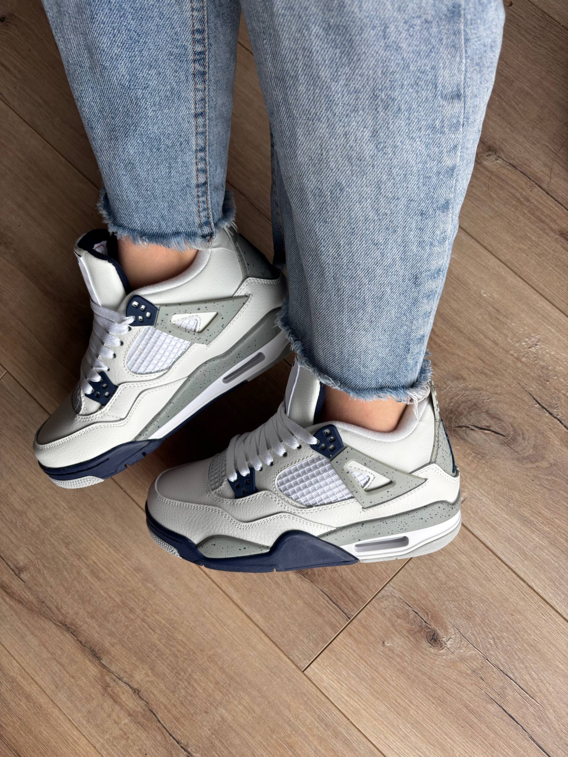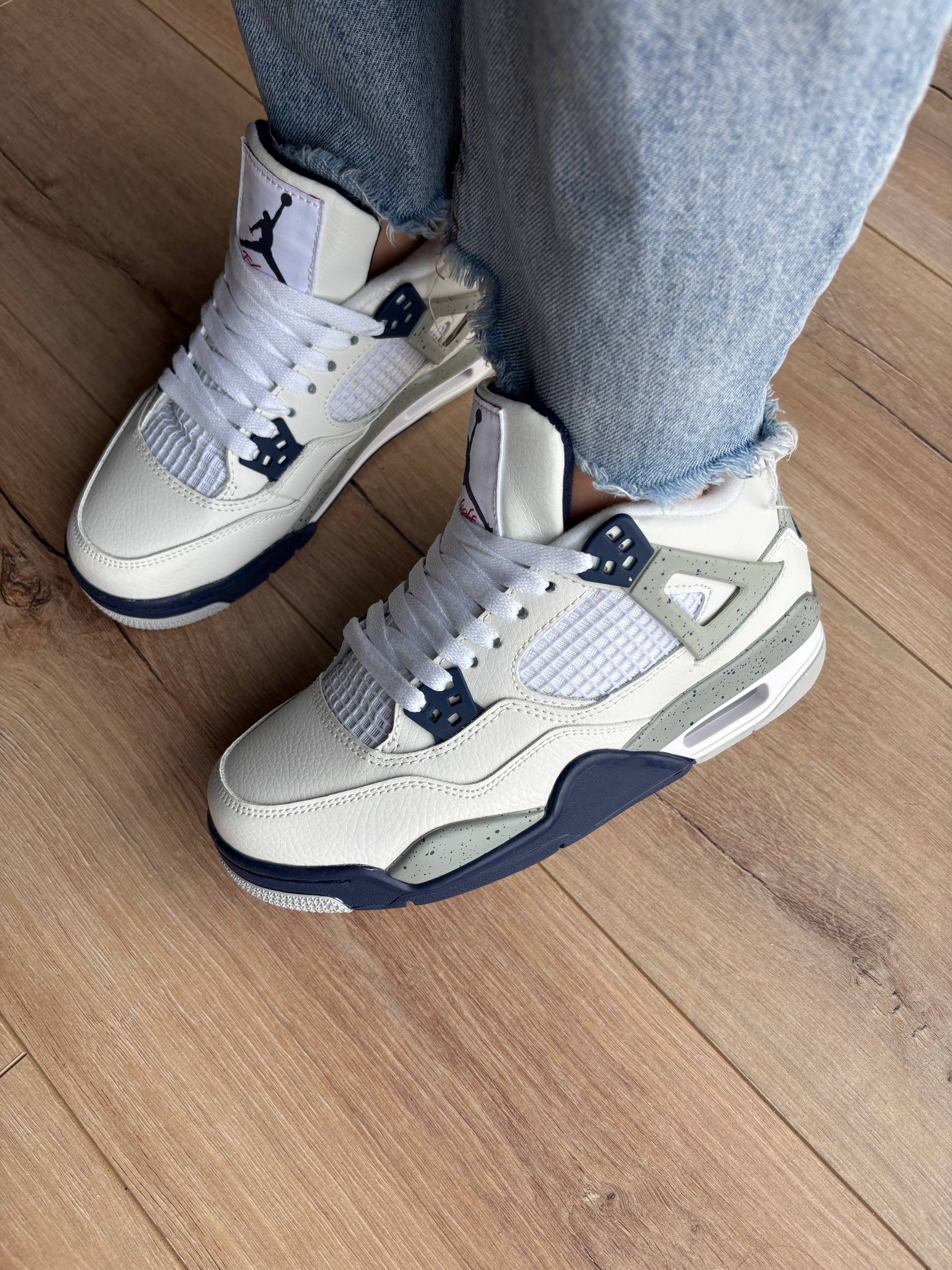 Air Jordan 4 Retro Midnight Navy — класичні кросівки Nike Air Jordan 4 у стильній комбінації білого, темно-синього та сірого кольорів з преміальної шкіри, видимою повітряною амортизацією Air та культовим дизайном, що поєднує ретро-баскетбольну спадщину з сучасною міською модою.