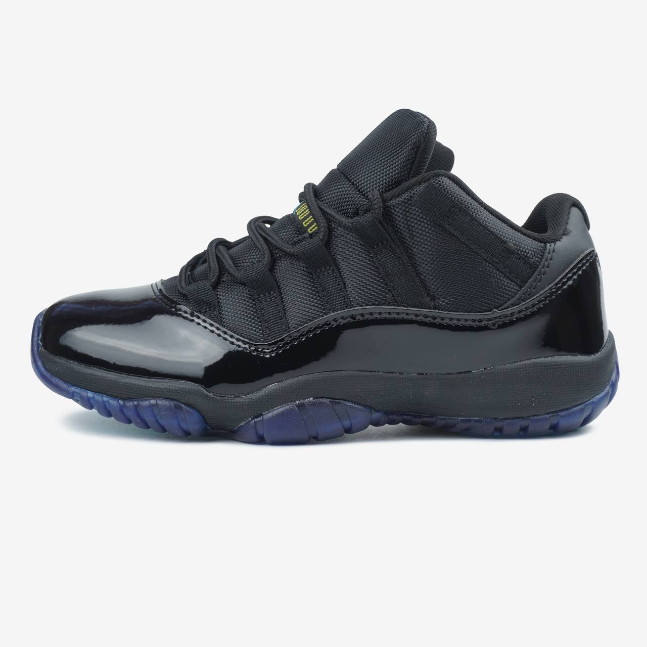 Jordan Retro 11 Low Gamma Blue — це елегантні кросівки з низьким профілем, чорним лакованим верхом і контрастними акцентами в блакитному та жовтому кольорах, що поєднують розкішний стиль і спортивну спадщину.
