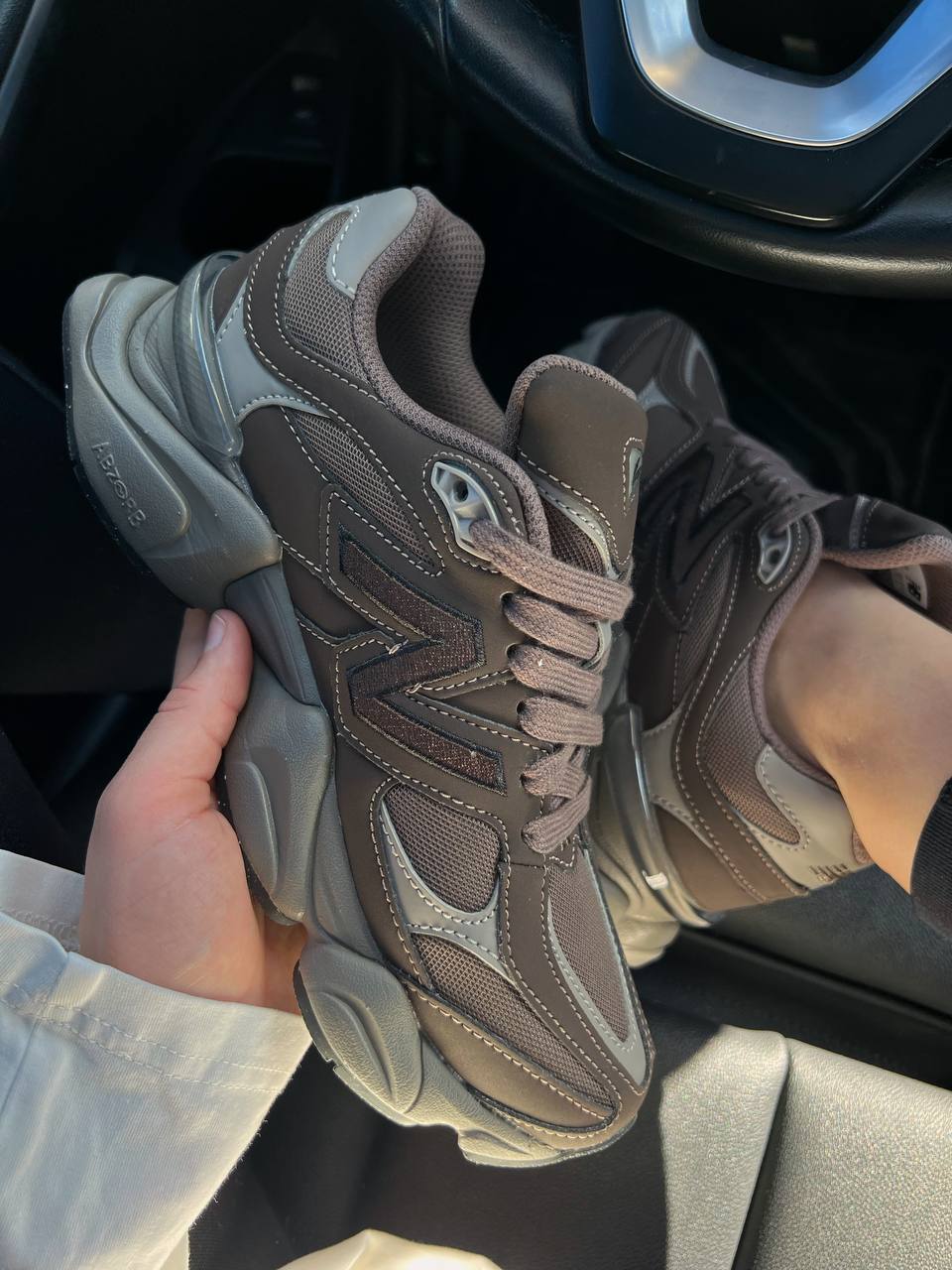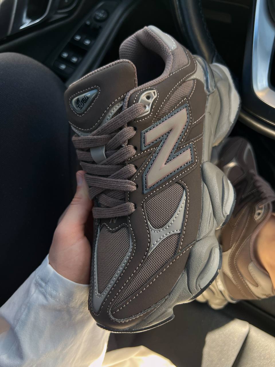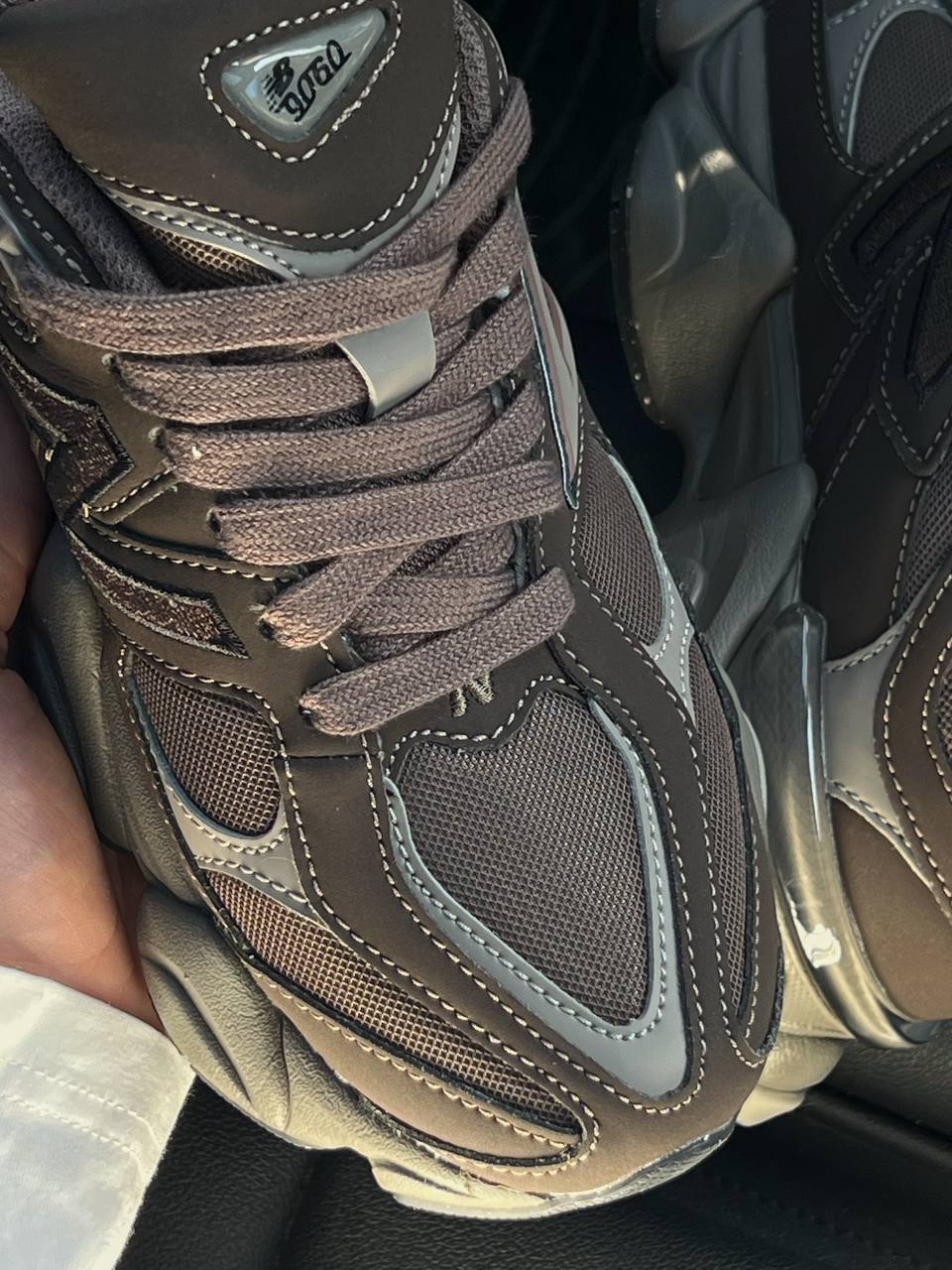 New Balance 9060 — це універсальні кросівки у темно-коричневій гамі з поєднанням замші, шкіри й текстилю, що забезпечують комфорт, стриманий стиль і масивний сучасний силует для щоденного носіння.