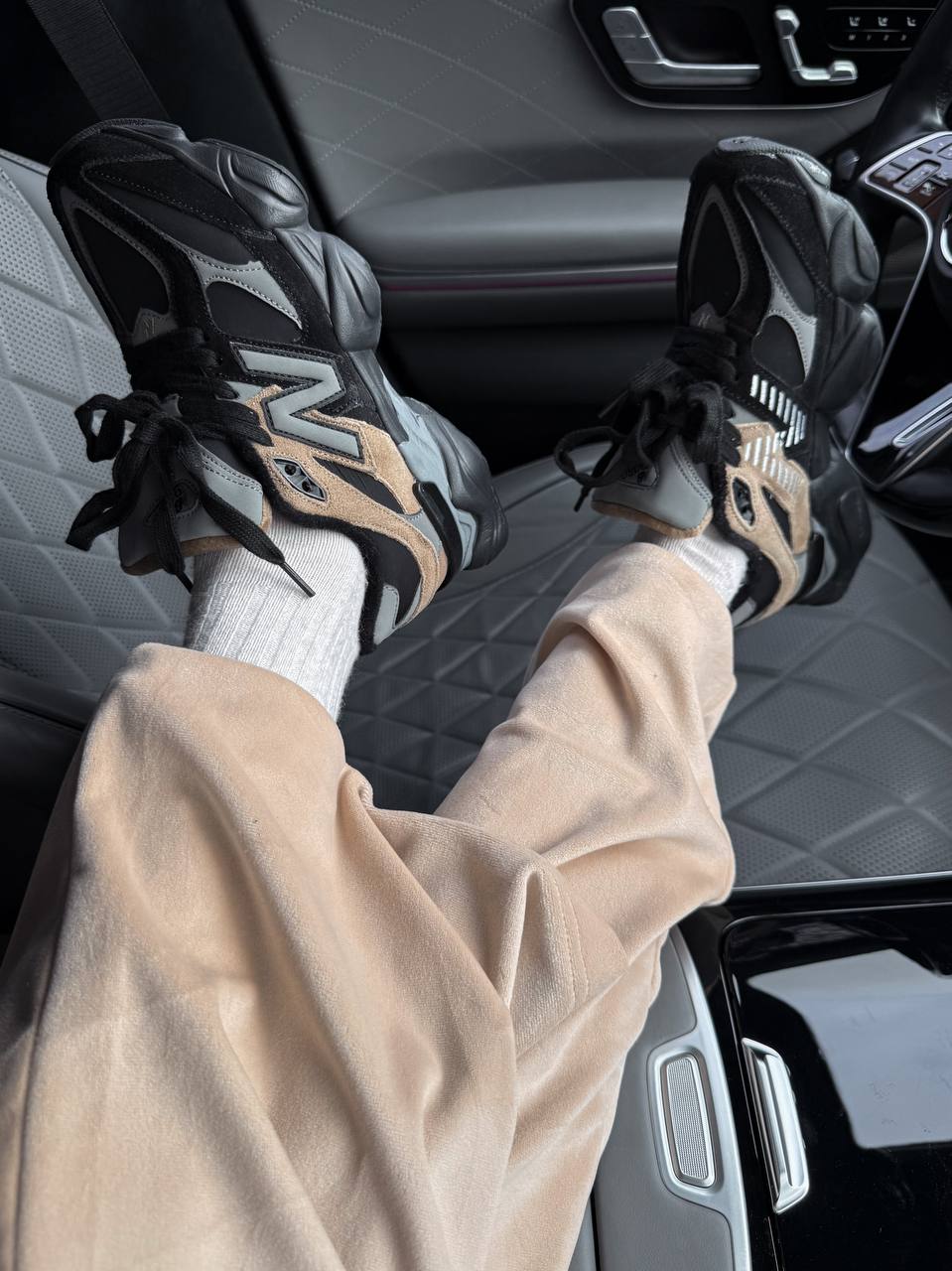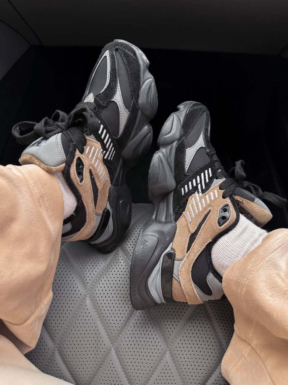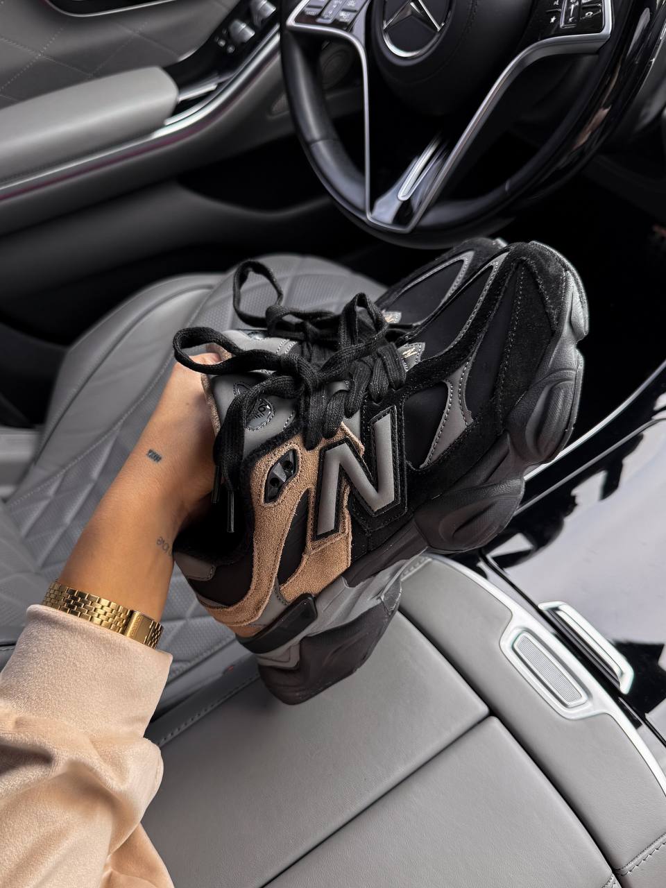 New Balance 9060 Black Brown — стильні кросівки з футуристичним силуетом, темно‑коричневими й чорними панелями та утепленою підкладкою з хутра.