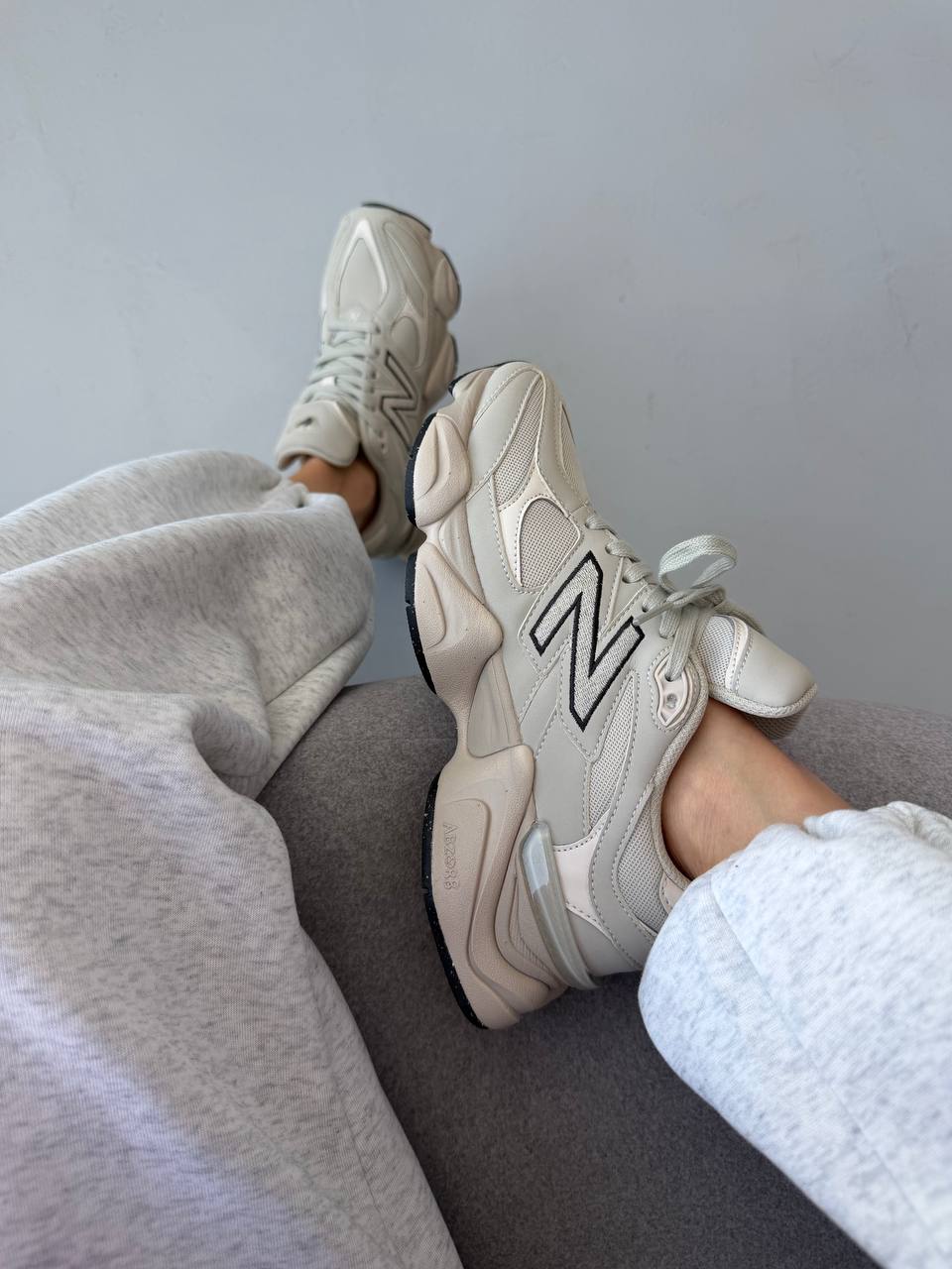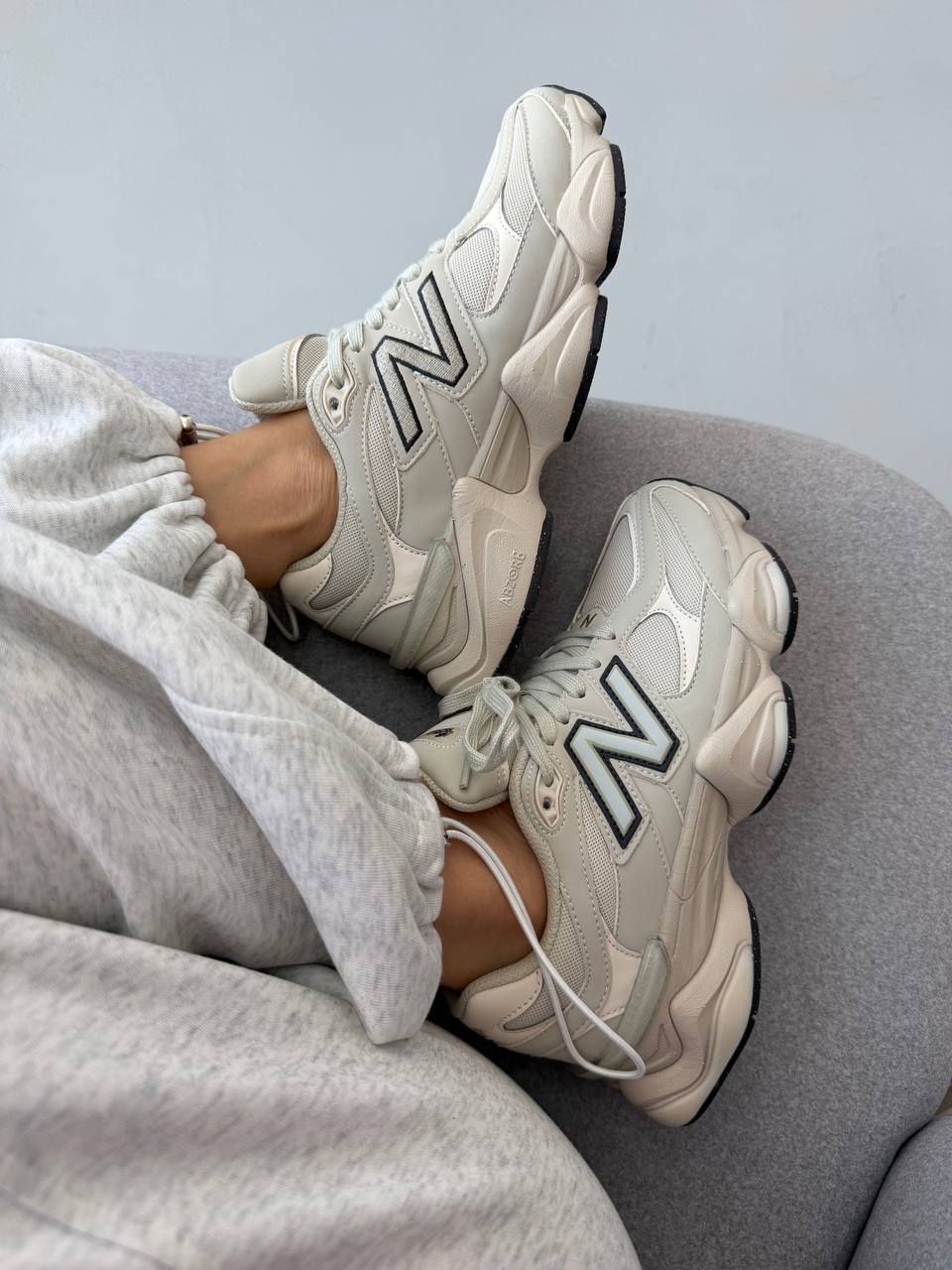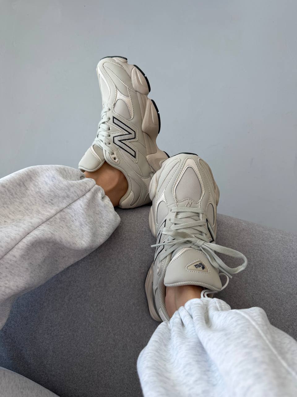 New Balance 9060 Light Cream Leather — це сучасні кросівки з об’ємним силуетом у світлому кремовому шкіряному виконанні, що поєднують елегантний мінімалізм і комфорт для повсякденного стилю.
