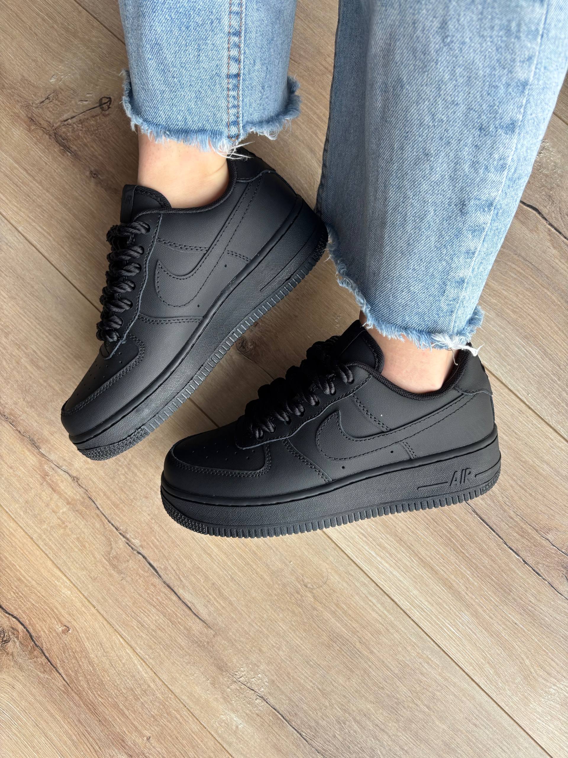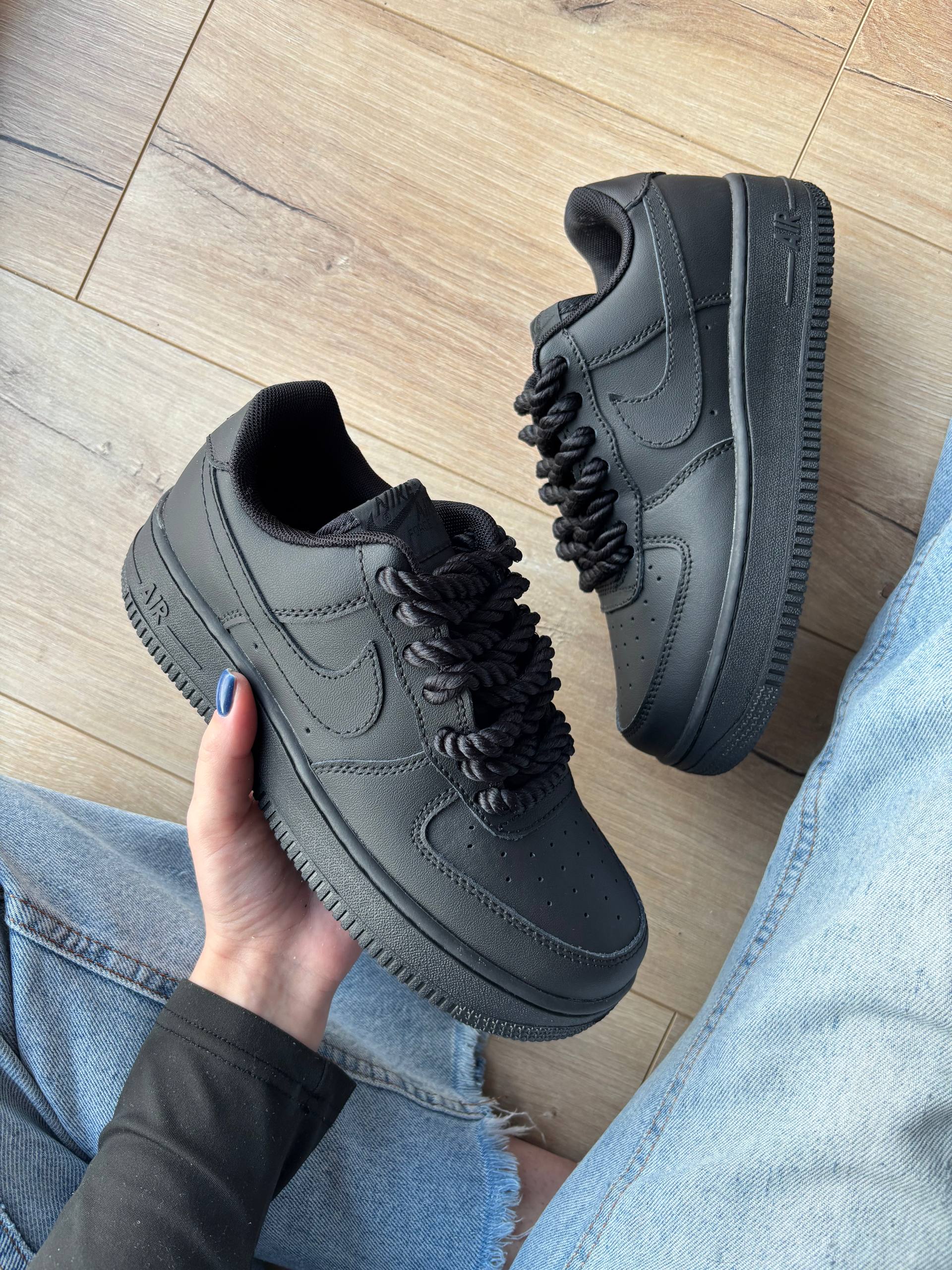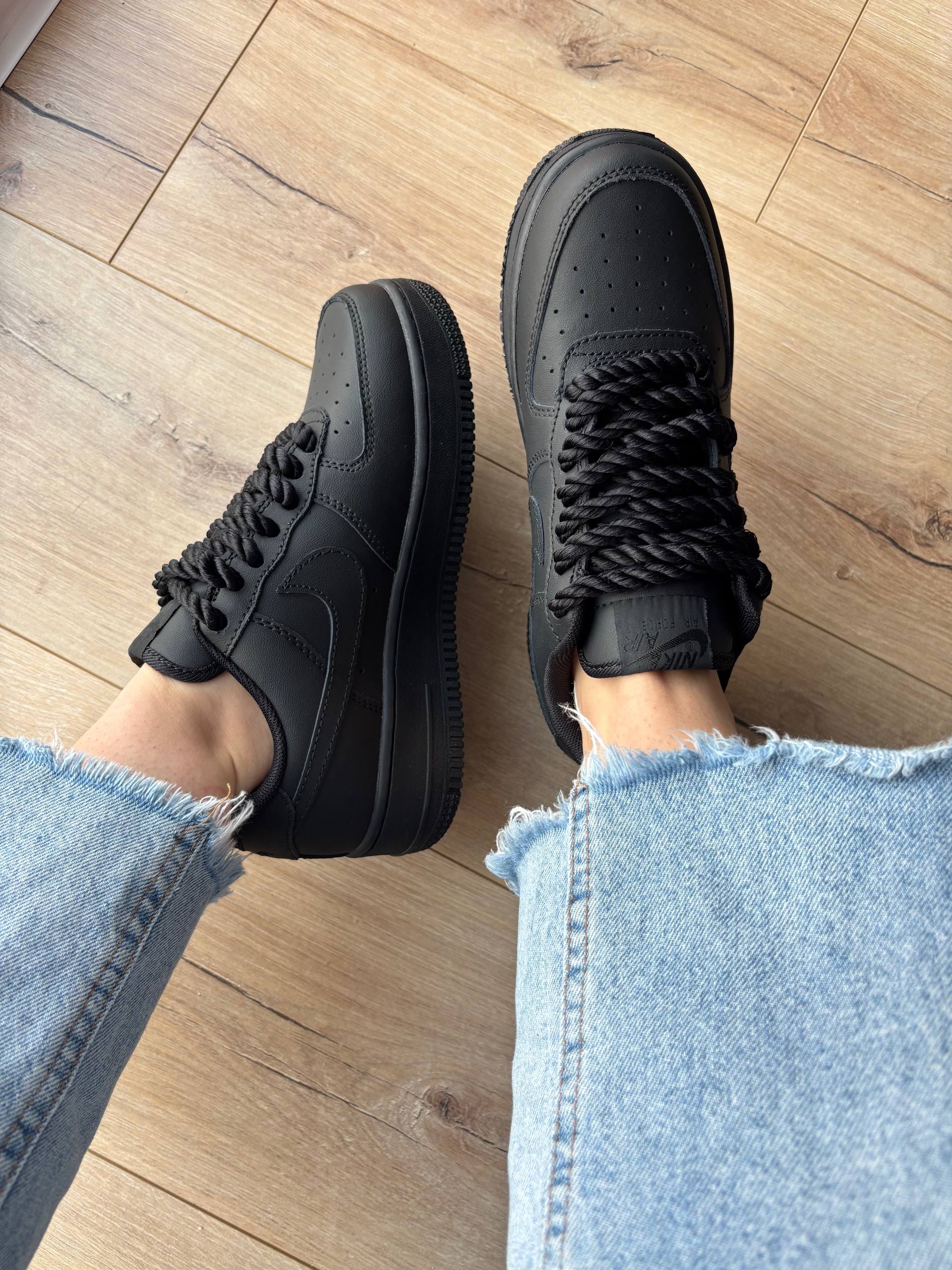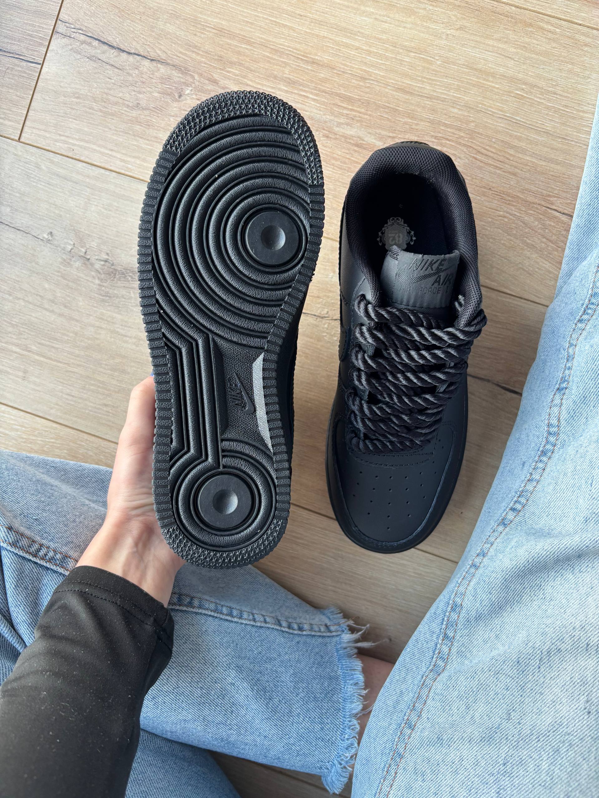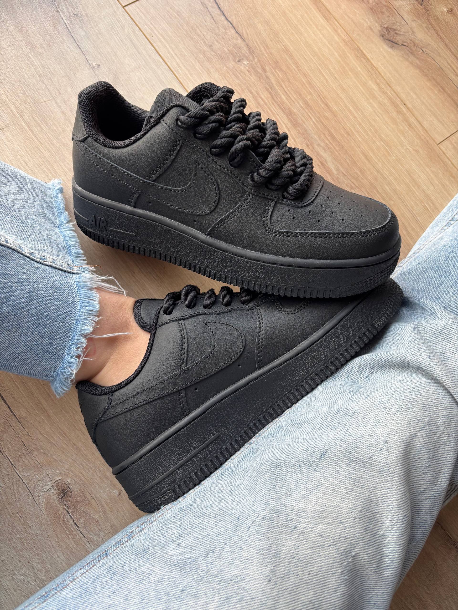 Nike Air Force 1 Low Black Rope Laces — класичні низькі кросівки Nike Air Force 1 у повністю чорному шкірянім дизайні з масивними «rope» шнурівками й зручним амортизованим підошвою, що поєднують культовий силует з міським streetwear-вибором для щоденного носіння.