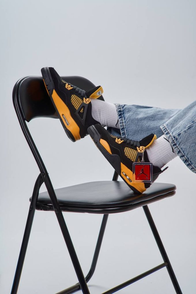 Nike Air Jordan 4 Retro Thunder — це класичні баскетбольні кросівки з яскравим чорним та жовтим дизайном, які поєднують культовий стиль і комфорт для щоденного носіння та спортивних активностей.
