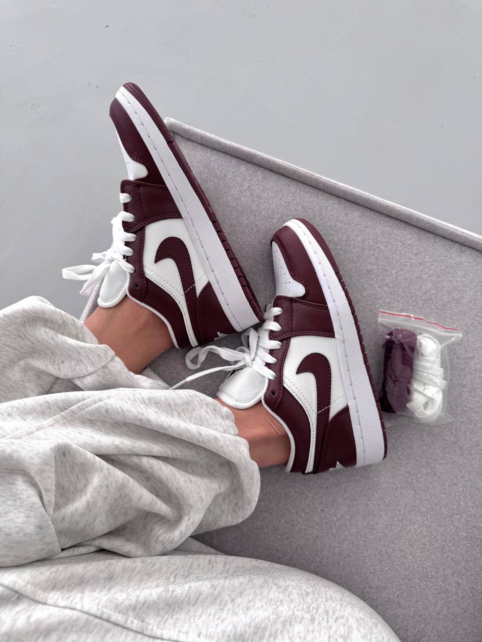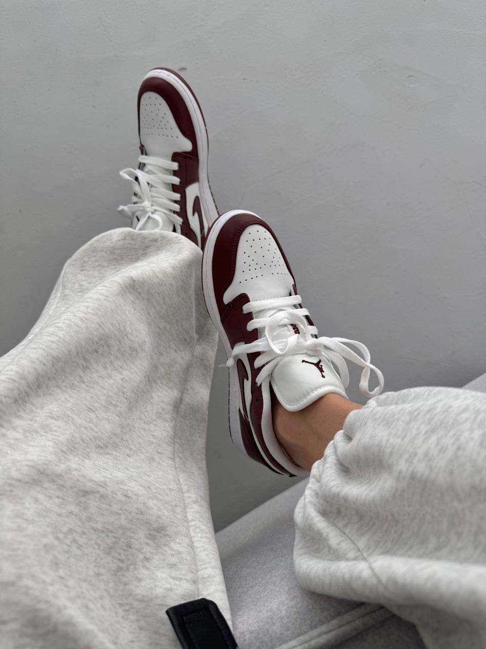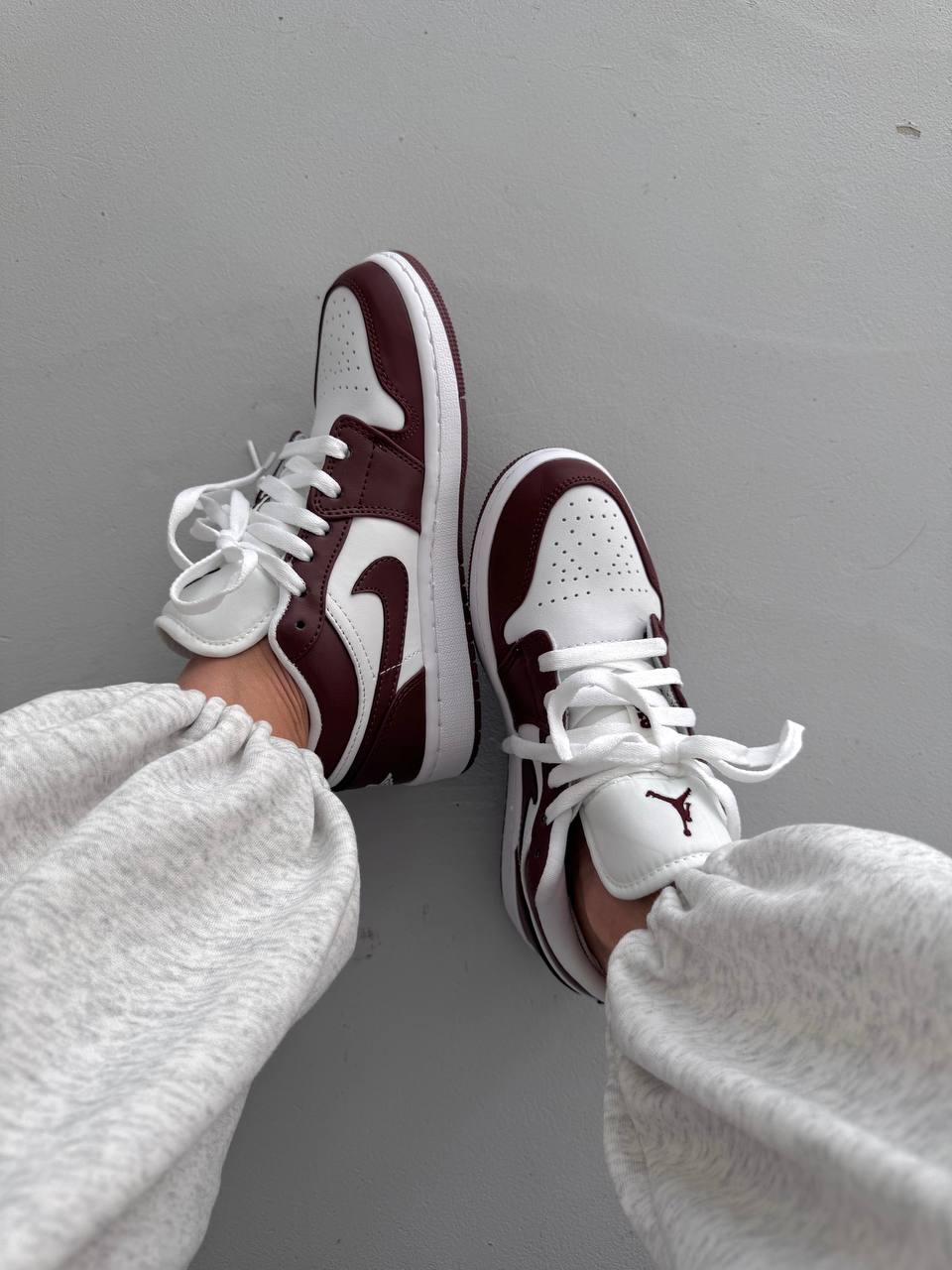 Nike Air Jordan Retro 1 Low Burgundy White — це стильна низько‑вершинна версія класичного AJ1 з поєднанням білого та бордового шкіряного верху, який виділяється елегантністю і контрастністю.