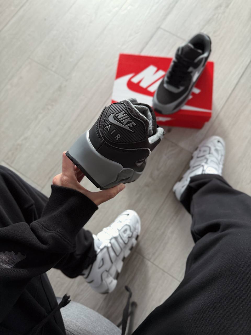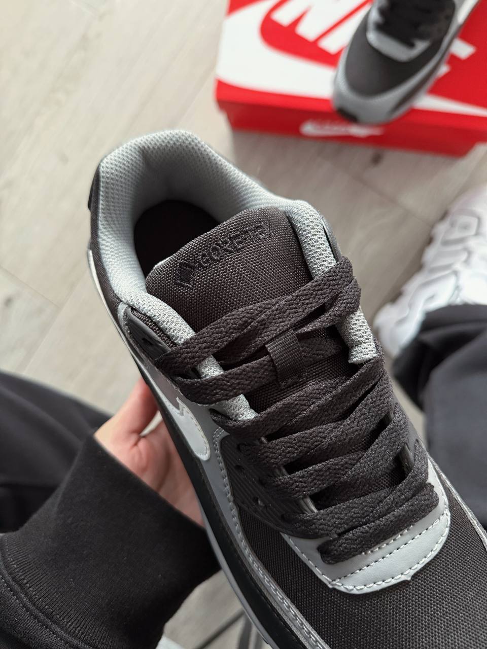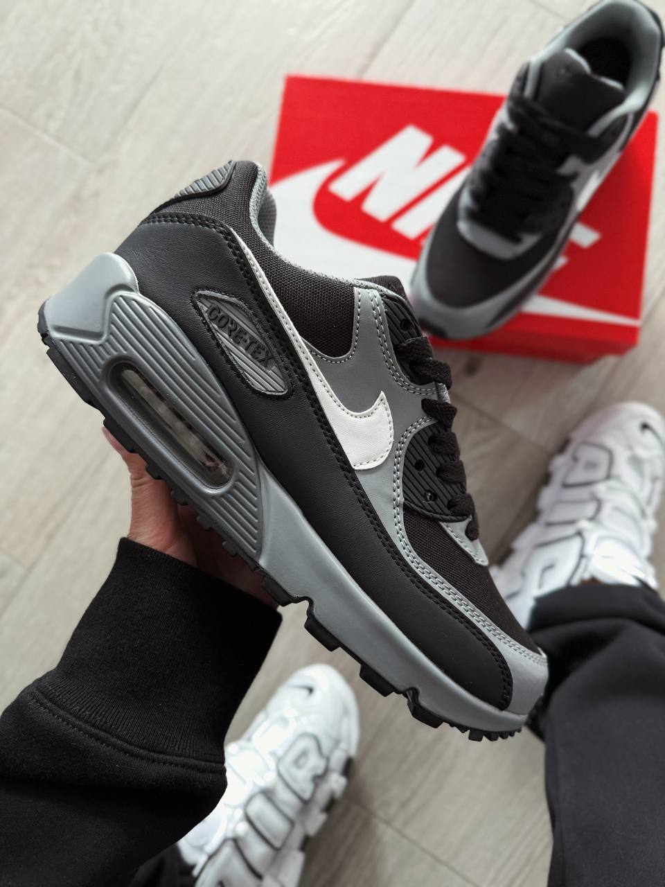 Nike Air Max 90 Gore-Tex Grey/Black — це класичні кросівки з водонепроникною мембраною Gore-Tex, поєднуючи темно-сірий та чорний кольори з білим логотипом Swoosh, що забезпечують комфорт і захист у будь-яку погоду.