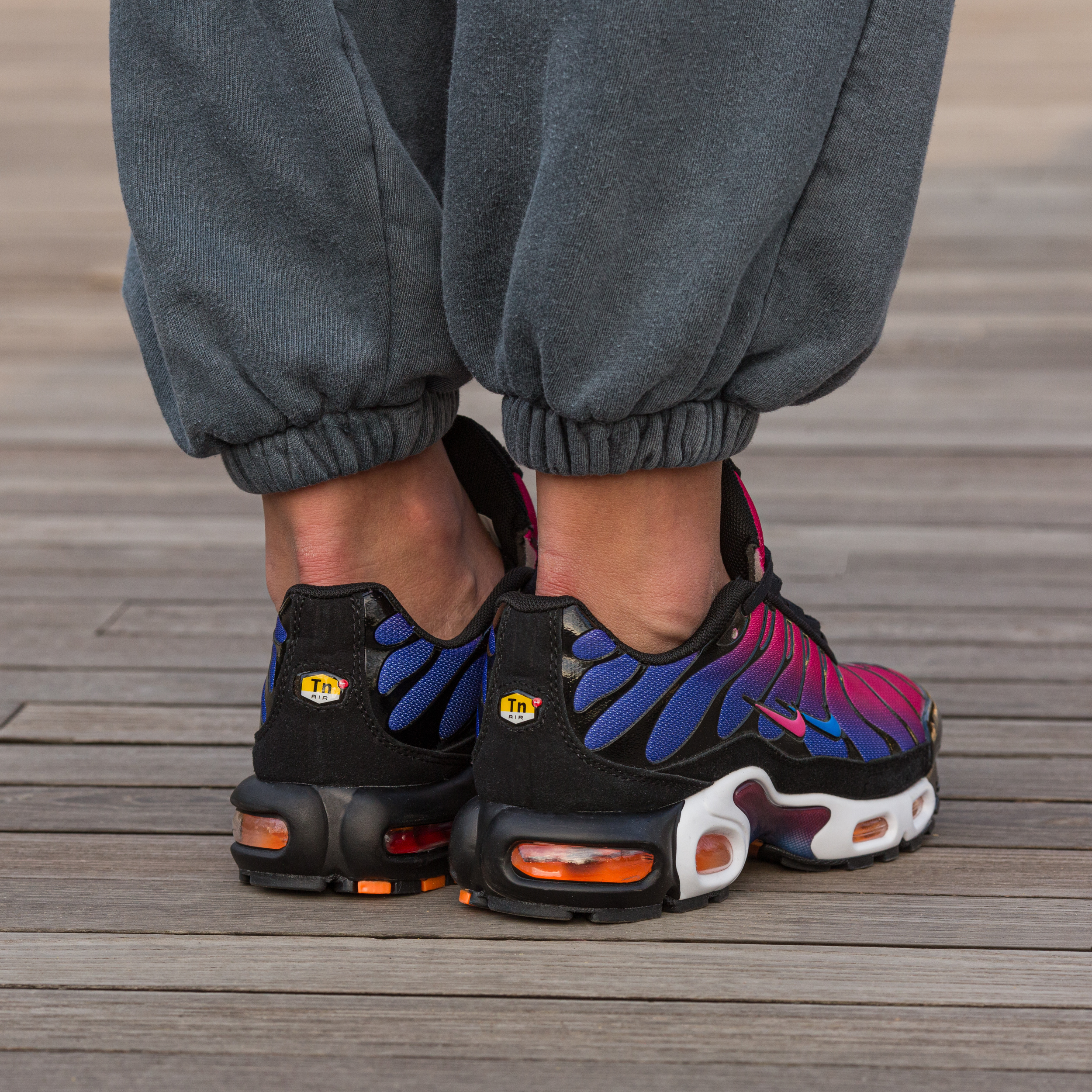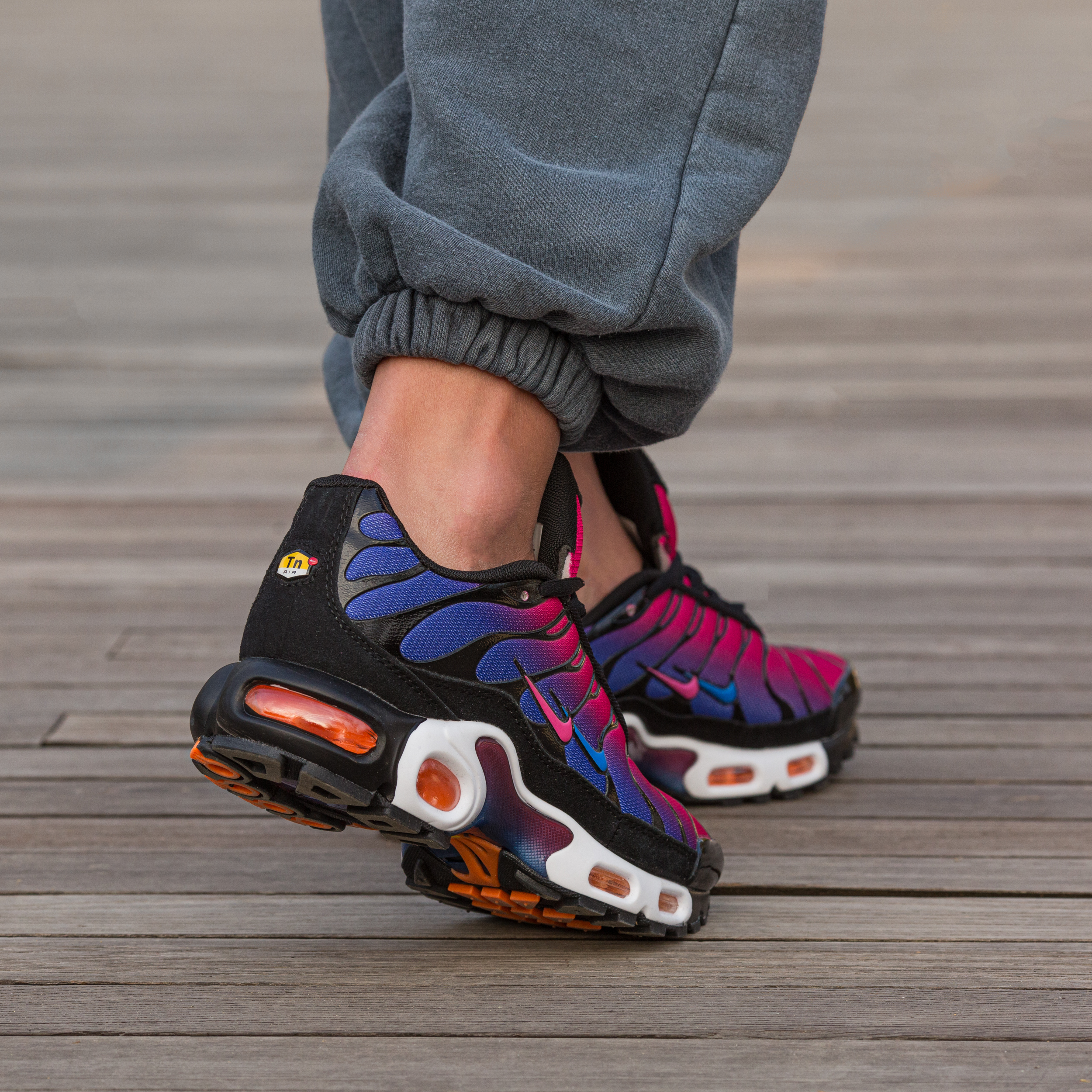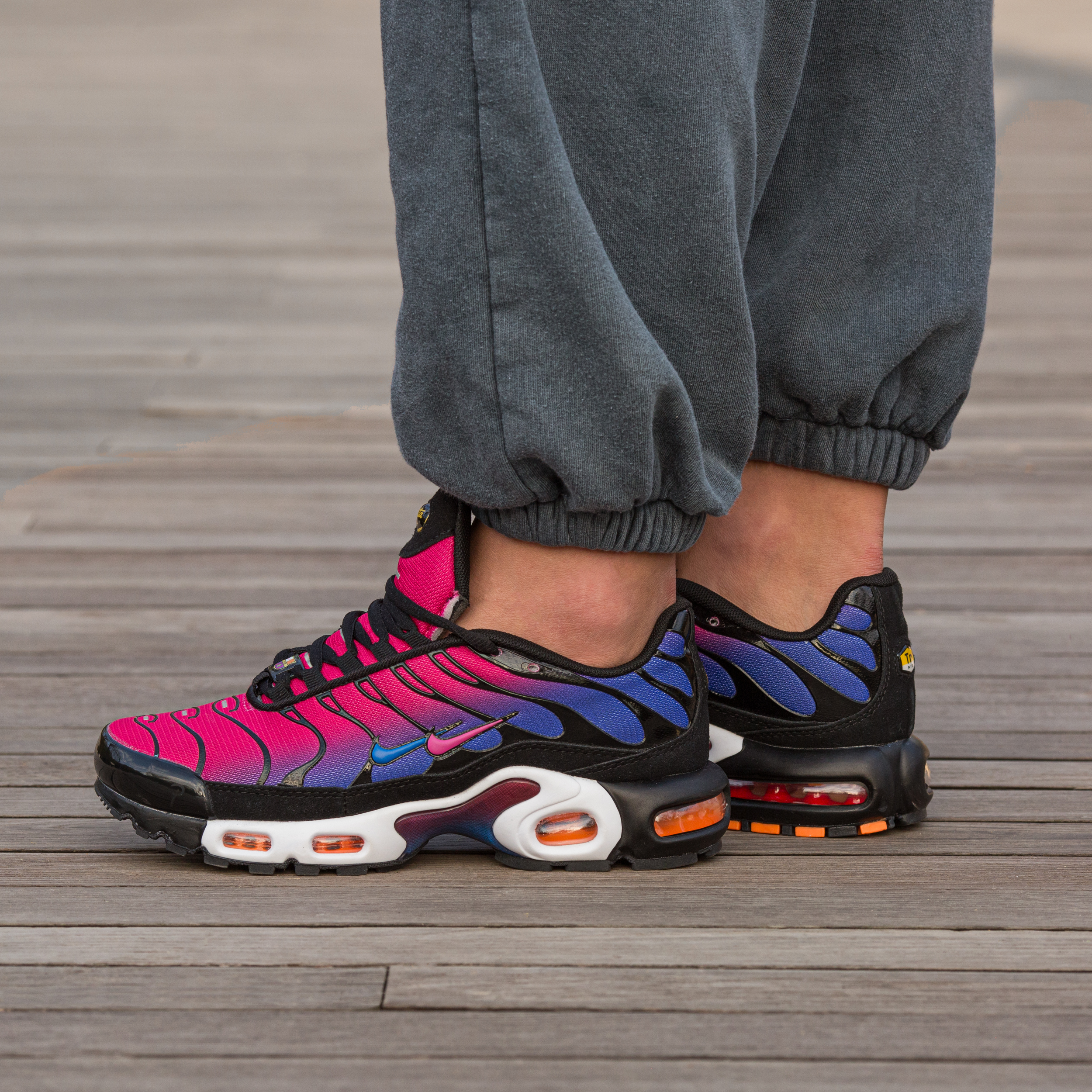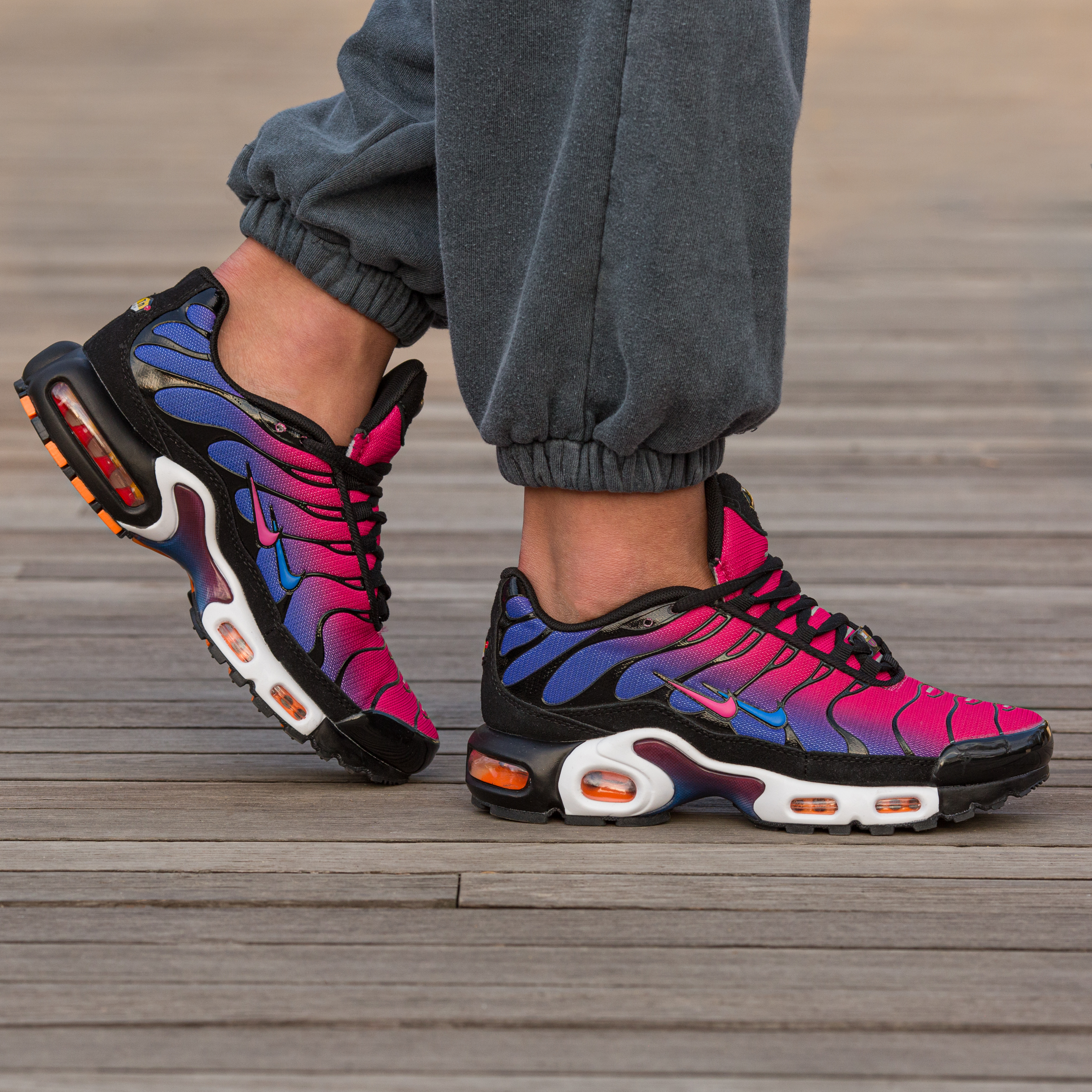 Nike Air Max TN Plus Black Pink Purple — це поєднання агресивного футуристичного силуету, яскравої контрастної палітри та щоденного комфорту. Глибока чорна основа з акцентами рожевого та фіолетового створює сміливий, енергійний образ, який привертає увагу та підкреслює характер, а фірмова система Tuned Air додає амортизації та стабільності під час руху.
