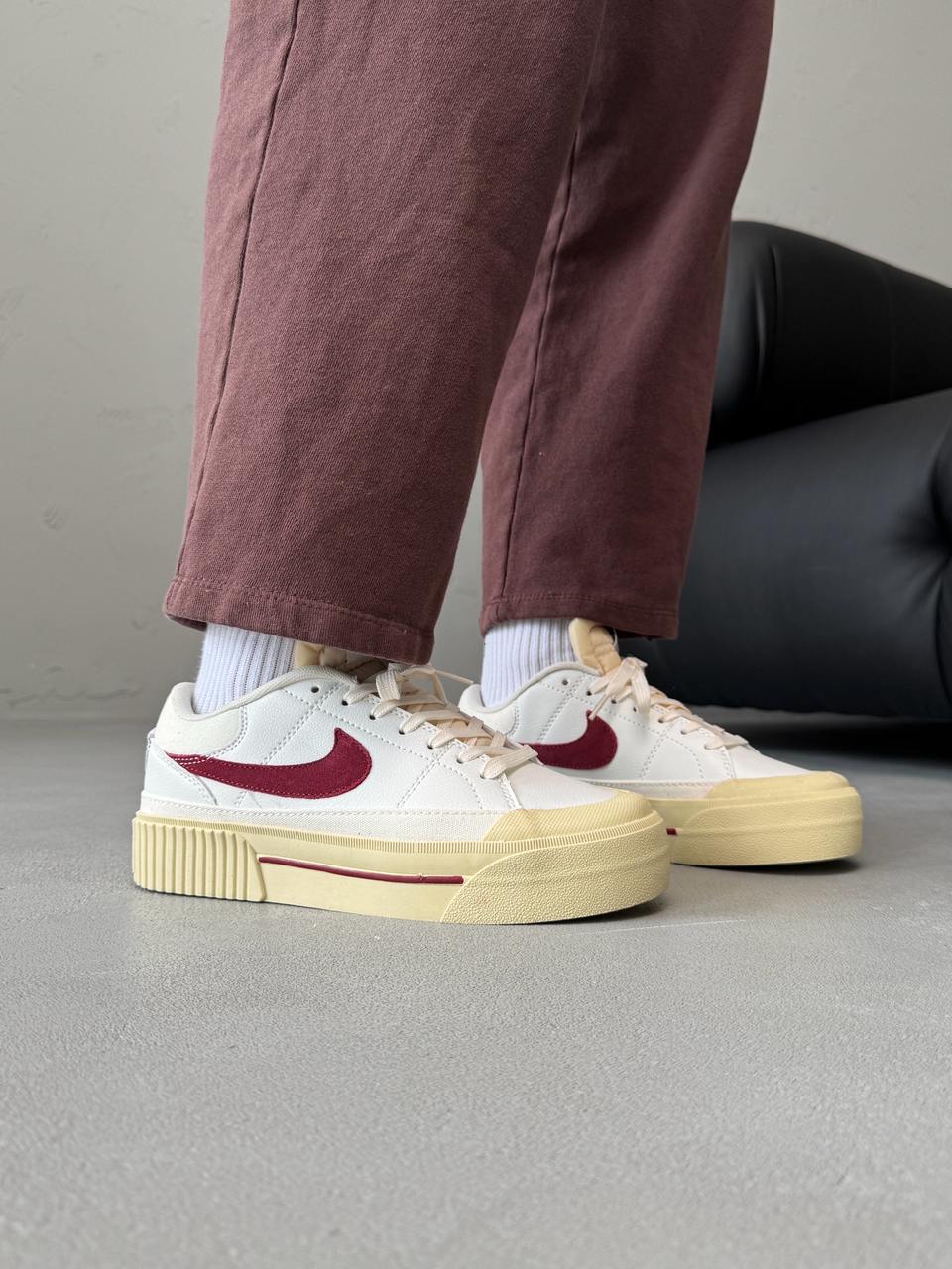 Nike Court Legacy Lift Beige/Bordo — стильні кеди з піднятою підошвою, замшевим верхом бежевого кольору та бордовими акцентами. Ідеальні для повсякденного носіння.