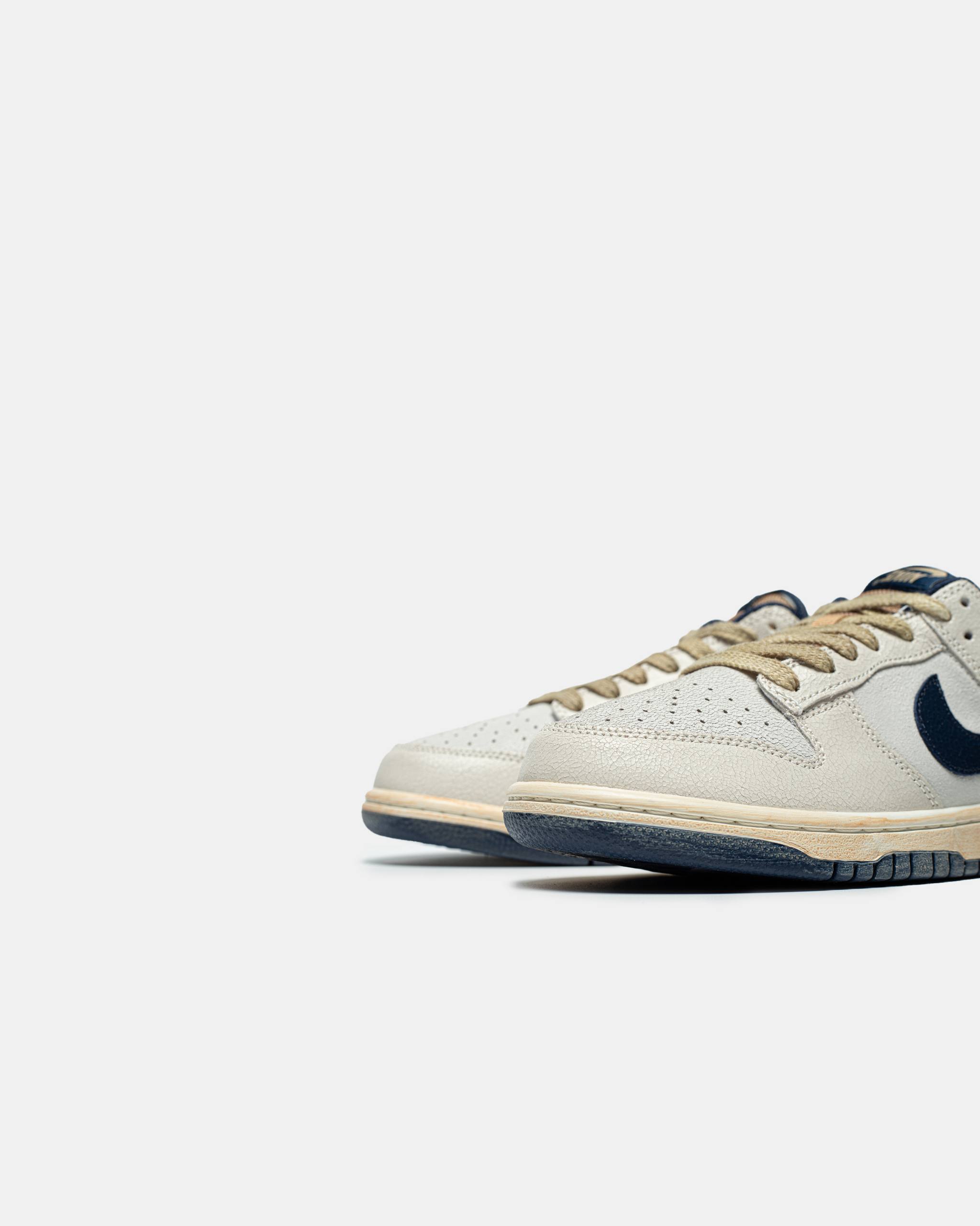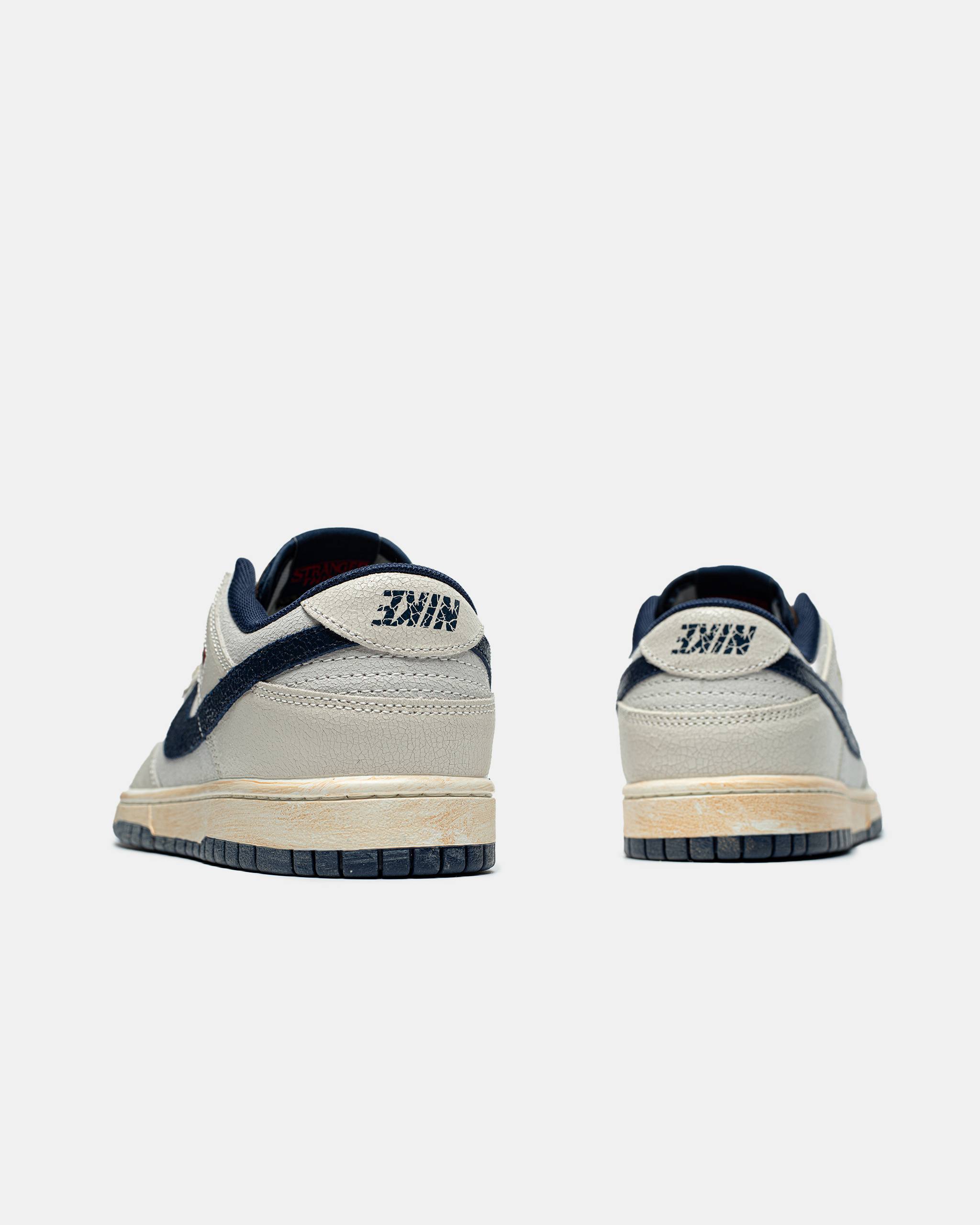Nike Dunk Low Stranger Things Phantom — це видання культових кедів Nike Dunk Low з ретро-естетикою, виконане у «Phantom/Midnight Navy» кольоровій гамі з штрихами, що відсилають до серіалу Stranger Things, з трішки старою, потертою зовнішністю, перевернутими логотипами й особливими деталями, натхненними «Upside Down», для стильного поєднання поп-культури та вуличного стилю.
