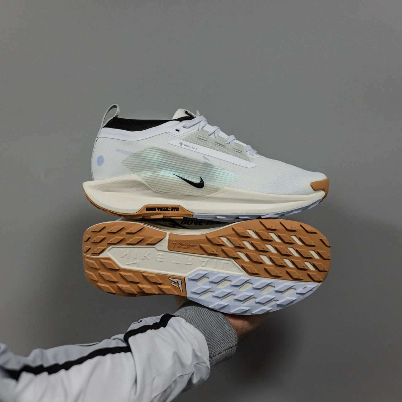 Nike Pegasus Trail 5 Gore-Tex — це водонепроникні трейлові кросівки у світлому кольорі з мембраною Gore-Tex, що забезпечують комфорт, захист і надійне зчеплення для бігу в складних погодних умовах.
