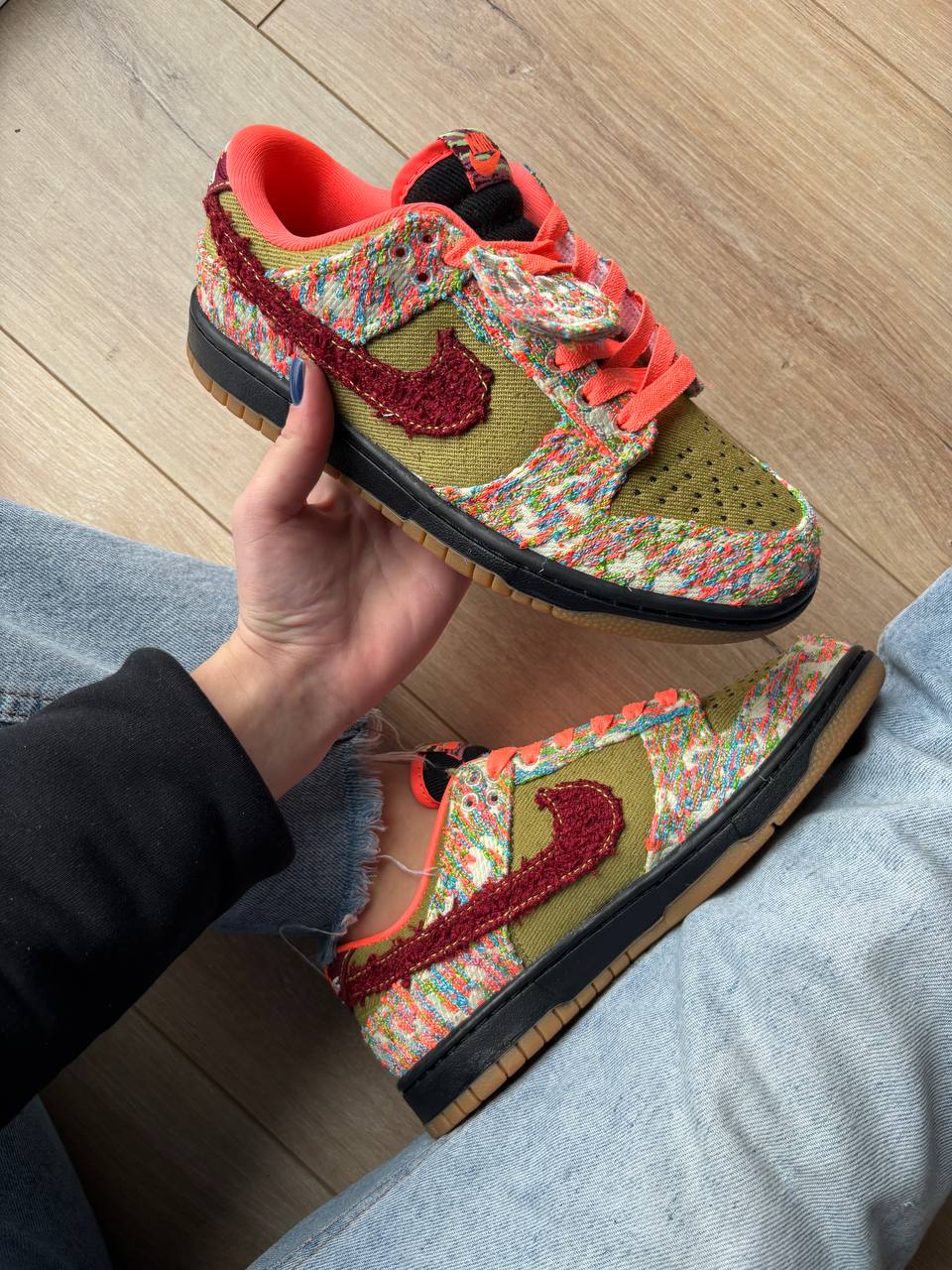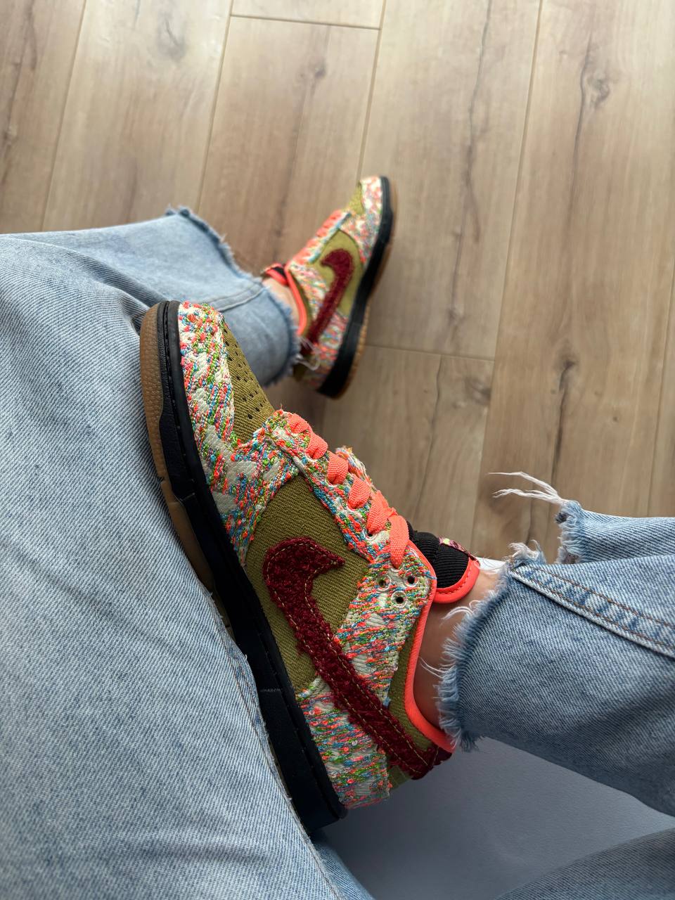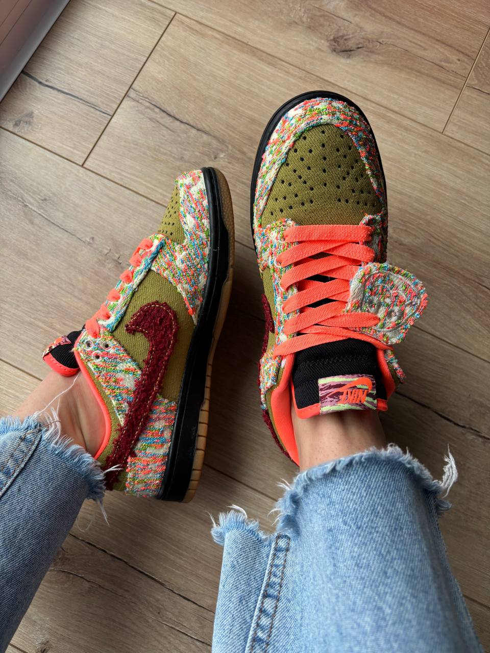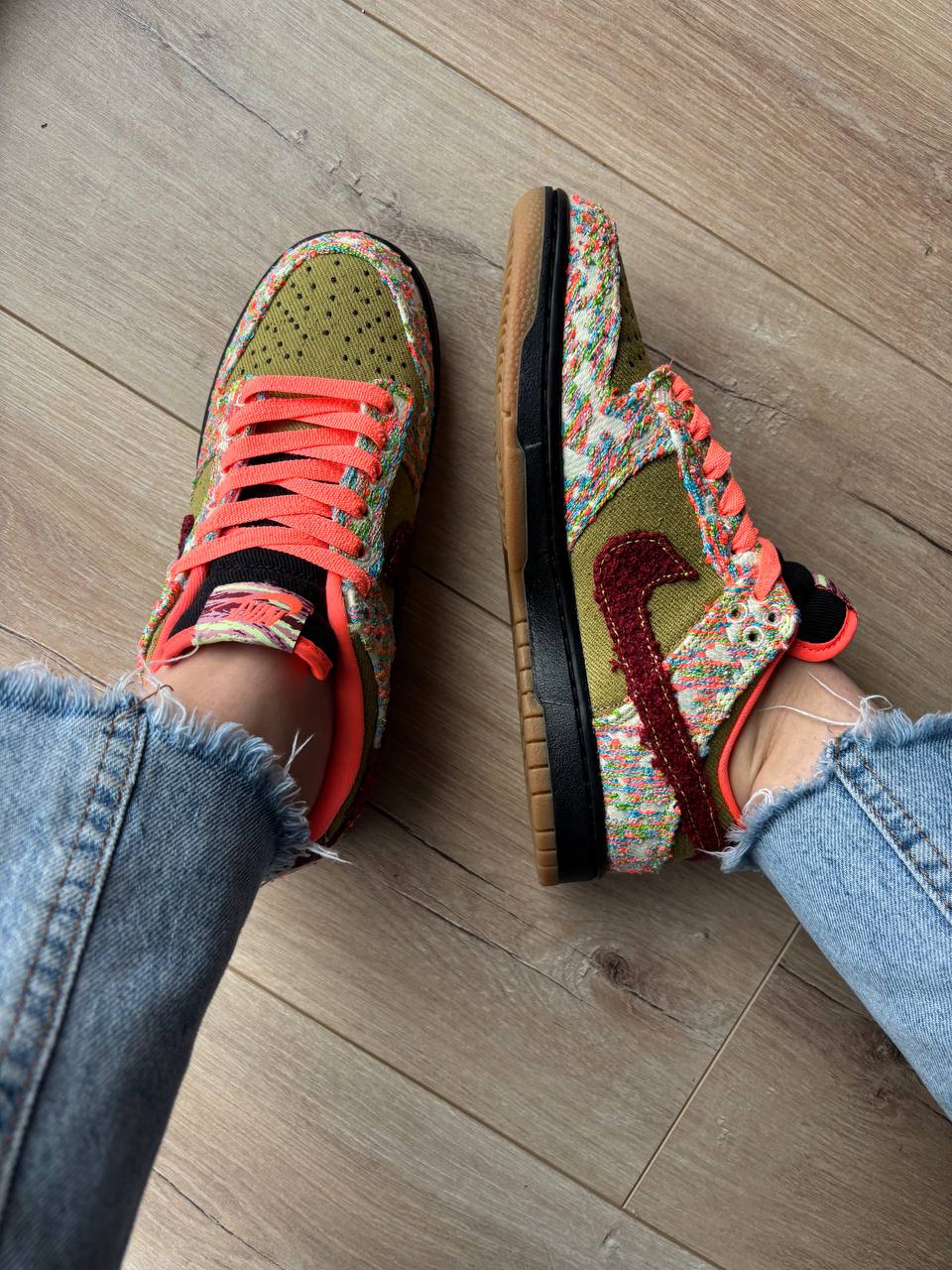 Nike SB Dunk Low Panda Monium Green Curry — це креативні низькі кросівки в рамках «Panda-Monium» з яскравою палітрою зеленого, яскраво-мангового й червоного, текстурованими багатобарвними елементами та декоративним акцентом у вигляді панди, що поєднують вуличний стиль і винятковий дизайн.