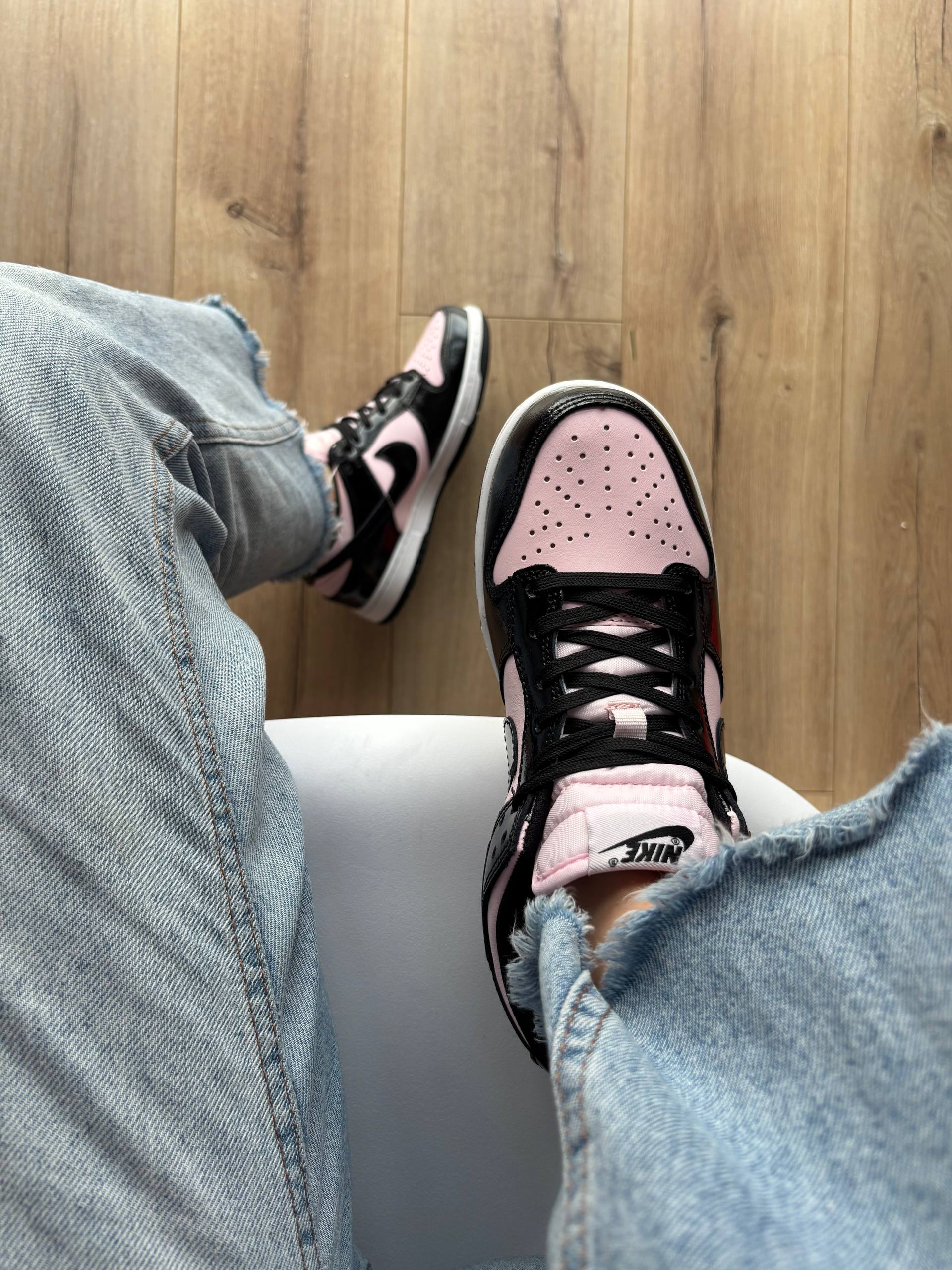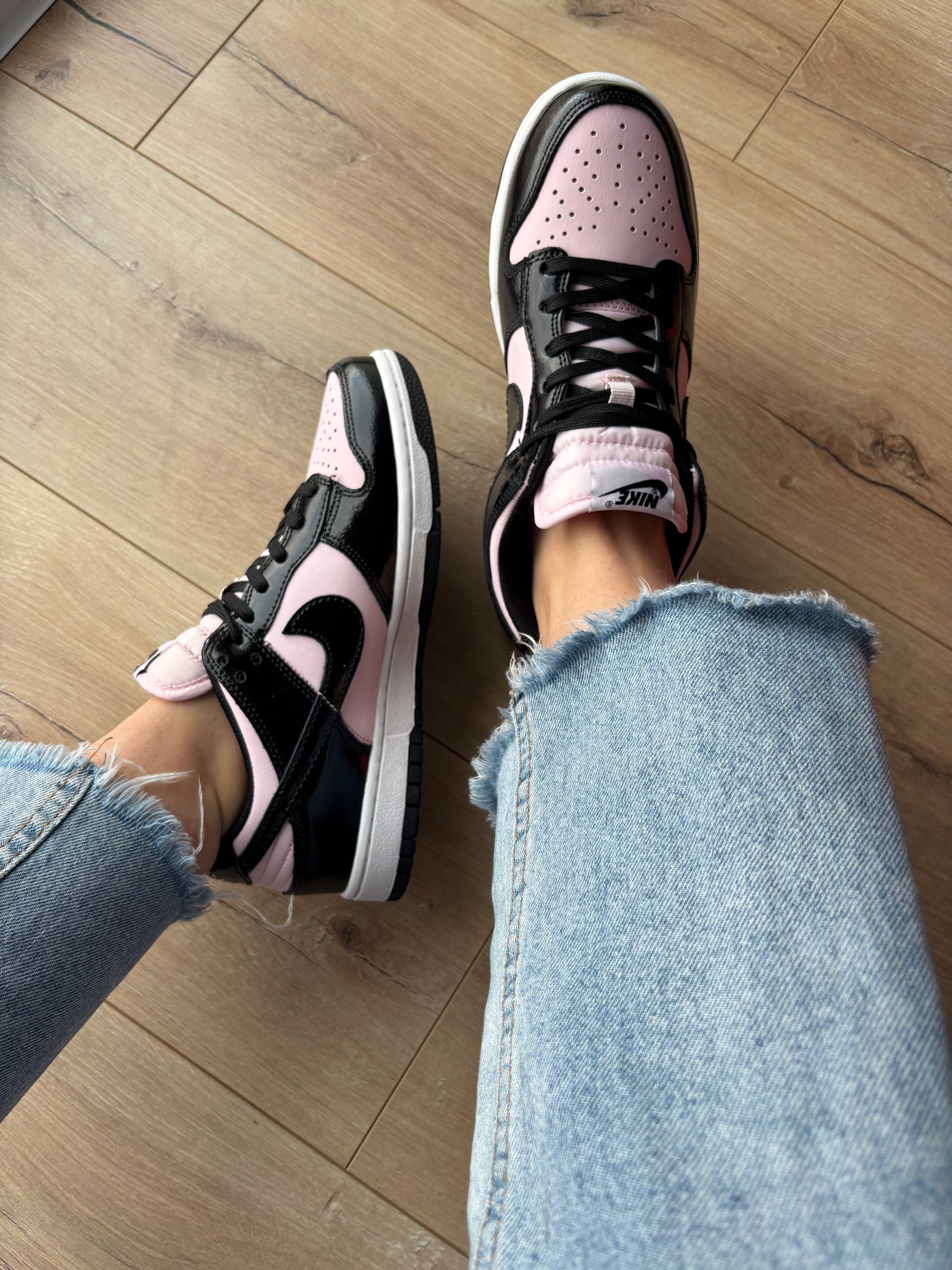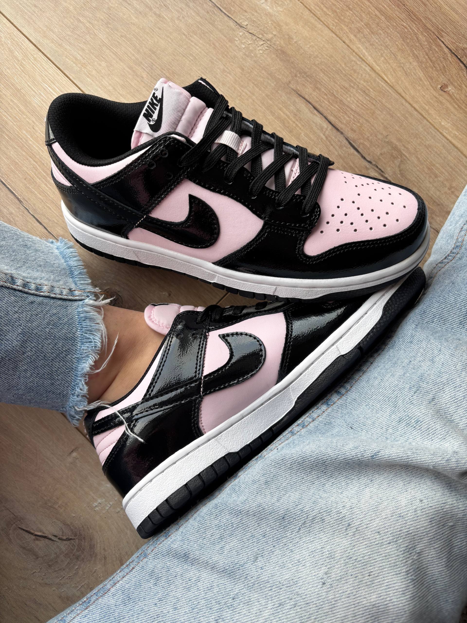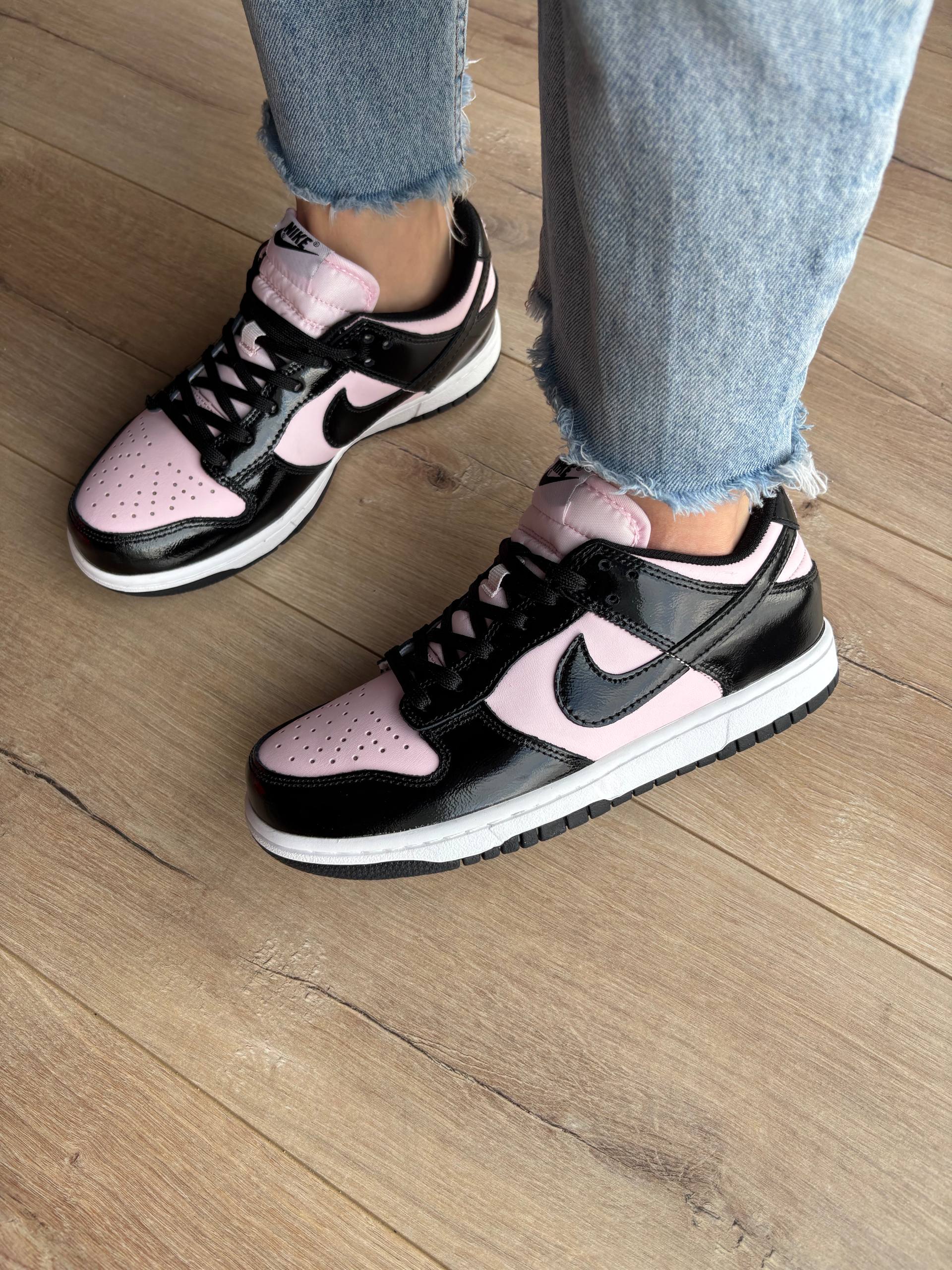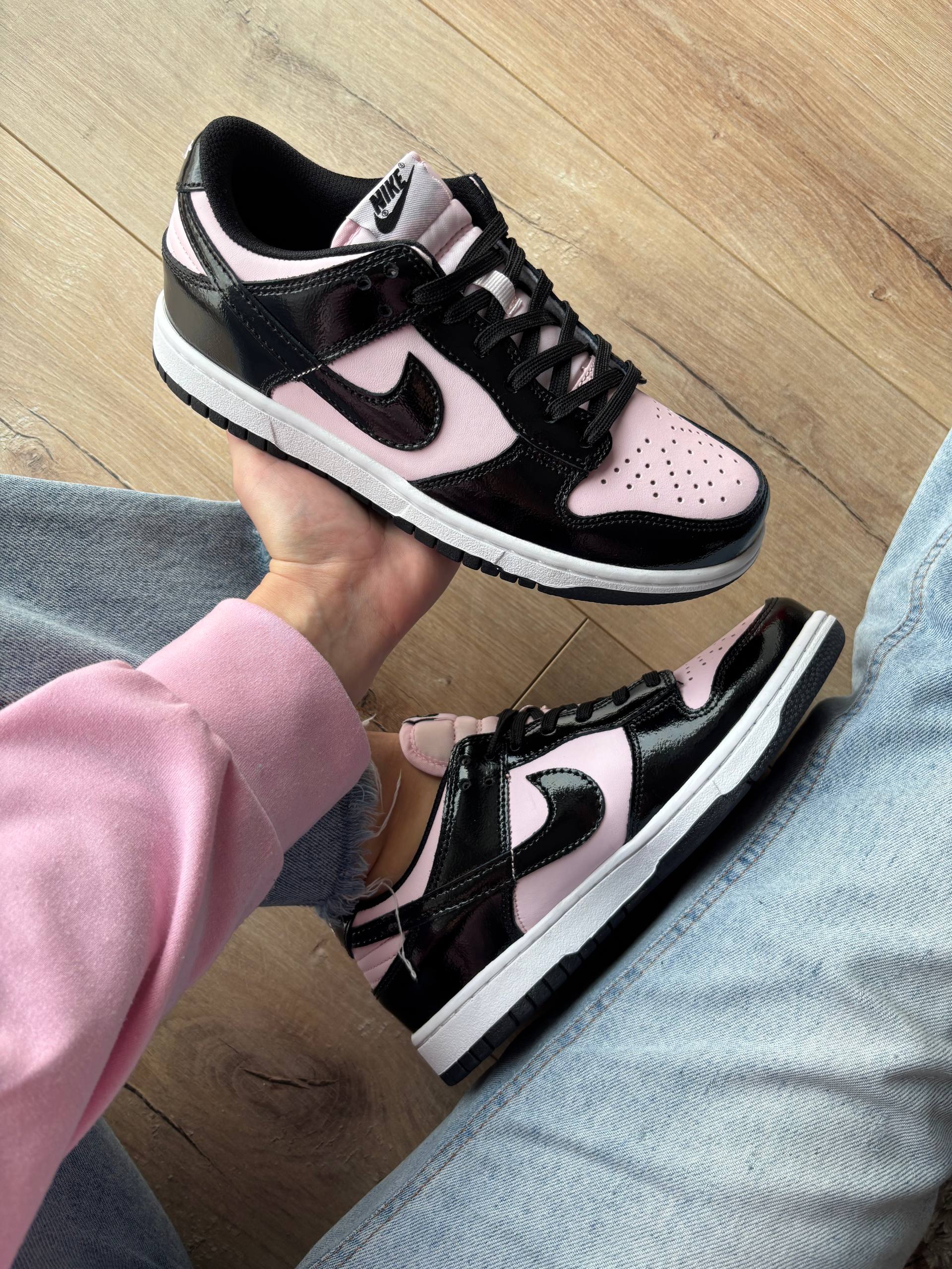 Nike SB Dunk Low Pink Black Patent Foam — стильні низькі кросівки Nike SB Dunk Low з поєднанням м’якого рожевого та глянцевого чорного патент-верхнього шару на класичному силуеті Dunk, контрастною білою підошвою й комфортною амортизацією для повсякденного streetwear-вигляду.
