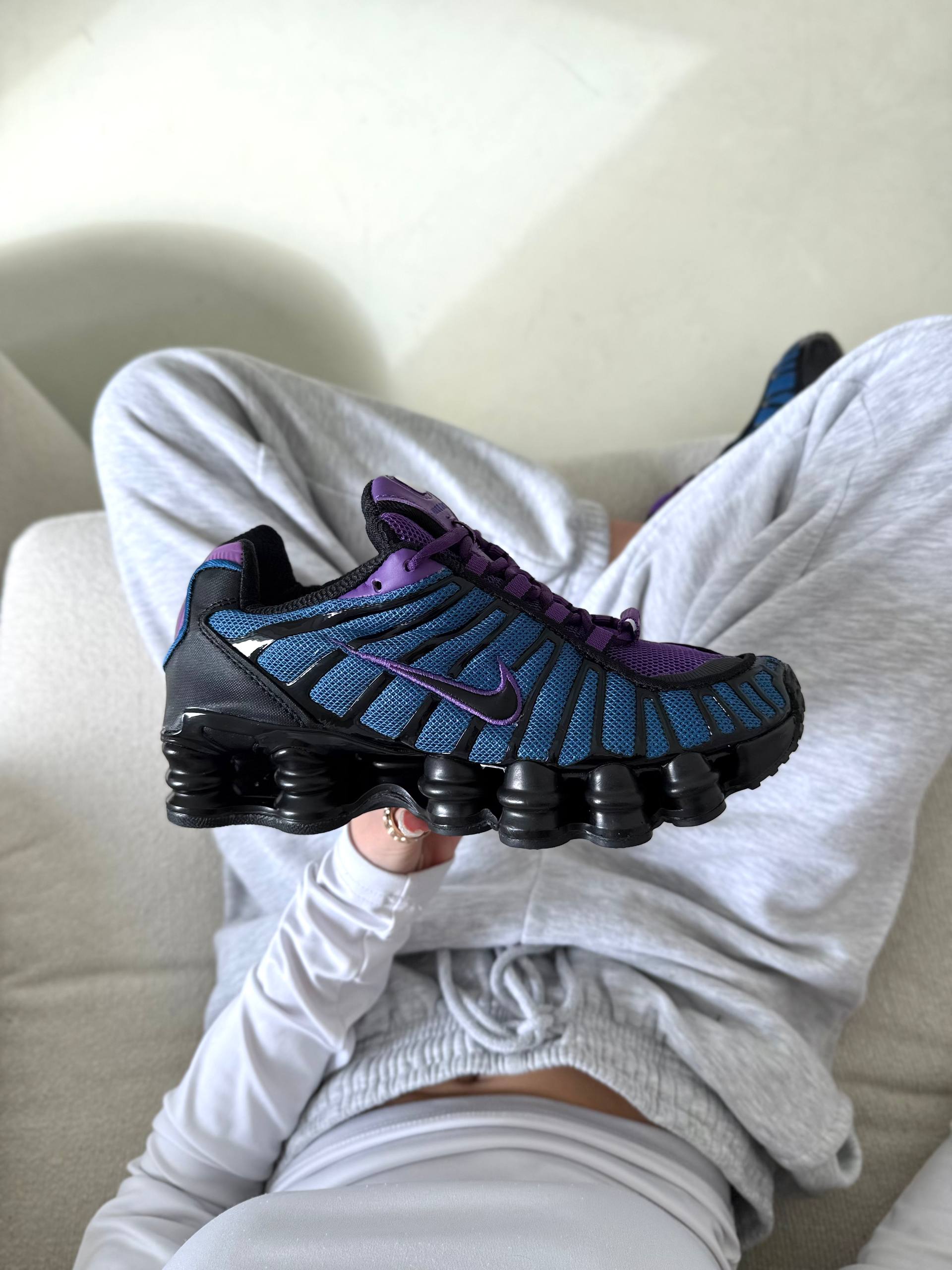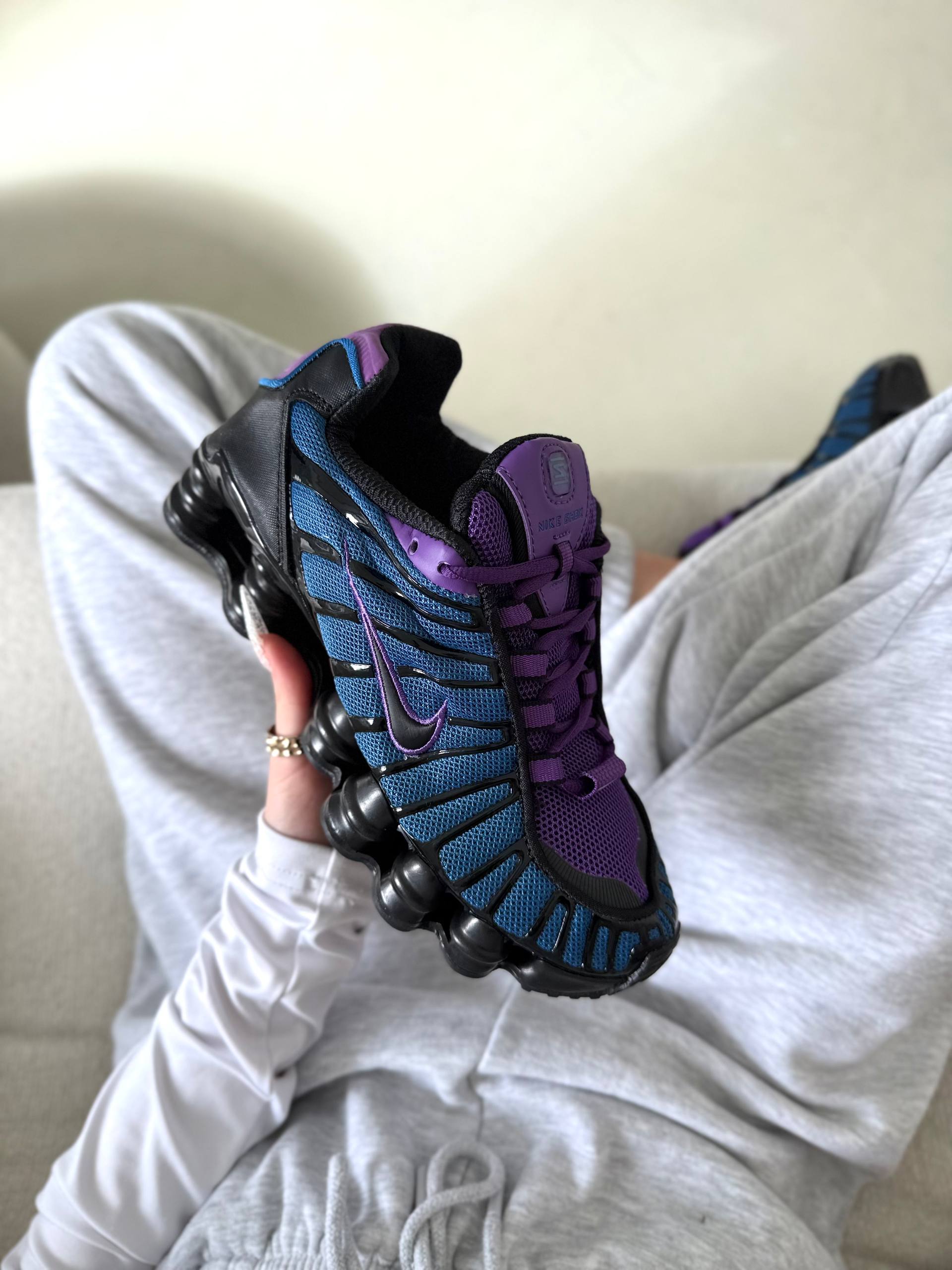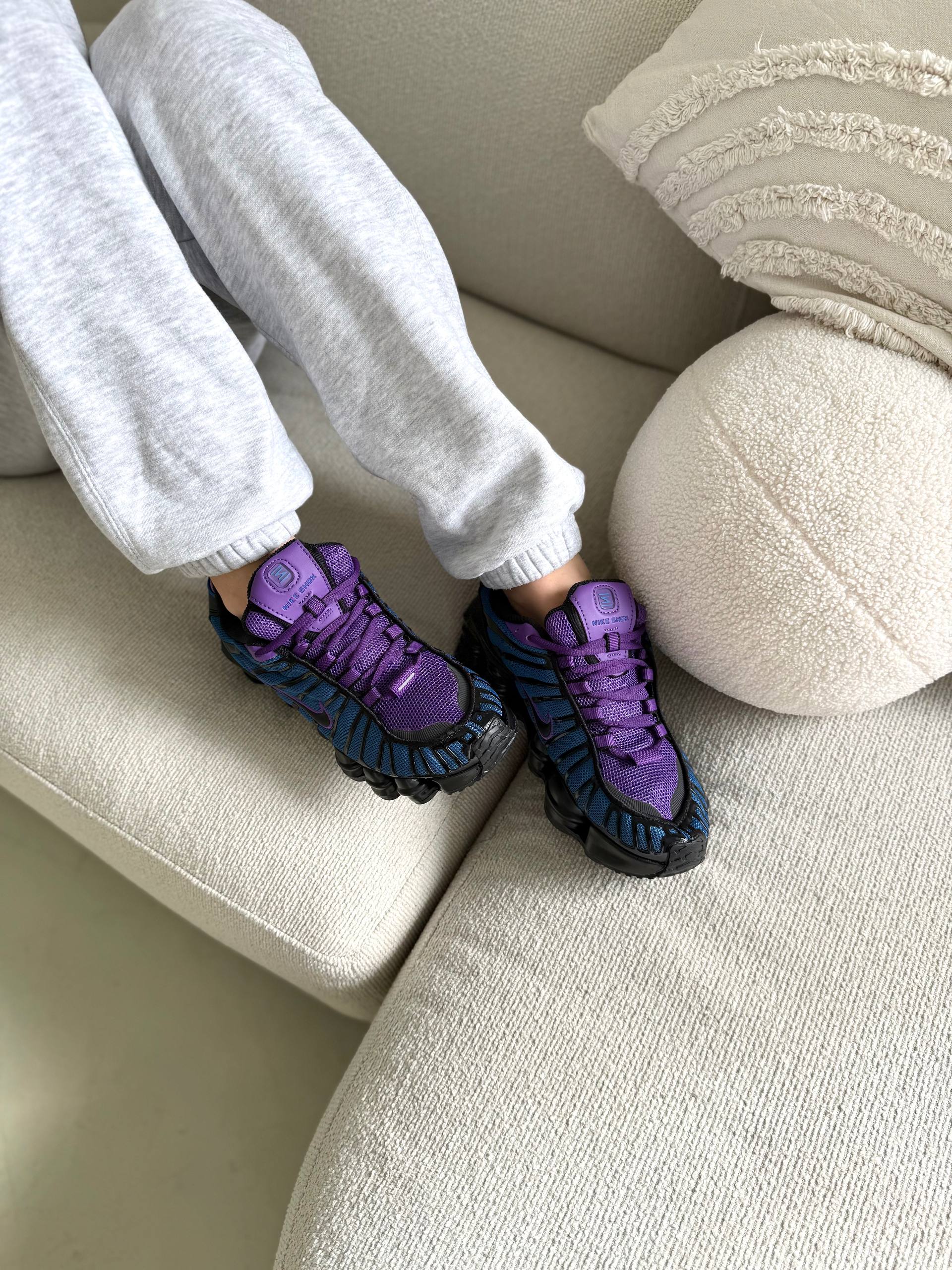Nike Shox TL Blue Violet Black — це футуристичні кросівки з поєднанням синього, фіолетового та чорного кольорів і повнорозмірною амортизацією Shox, що забезпечують пружність і комфорт у щоденному носінні.