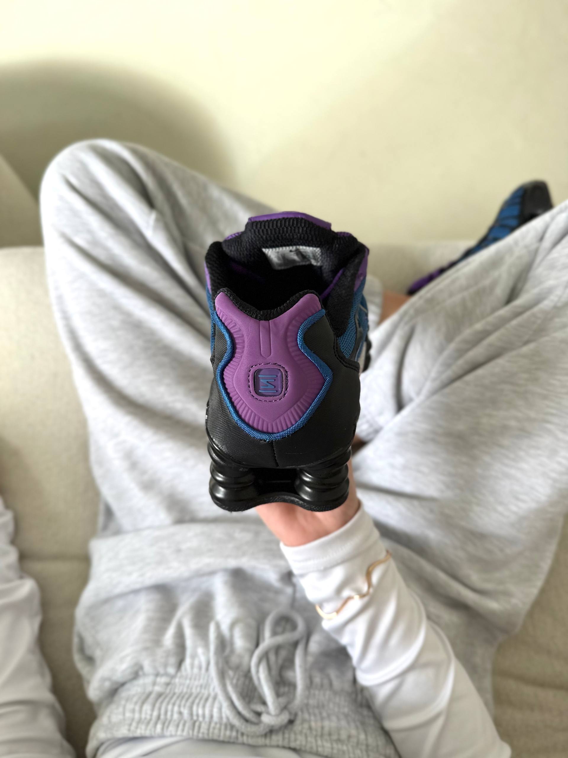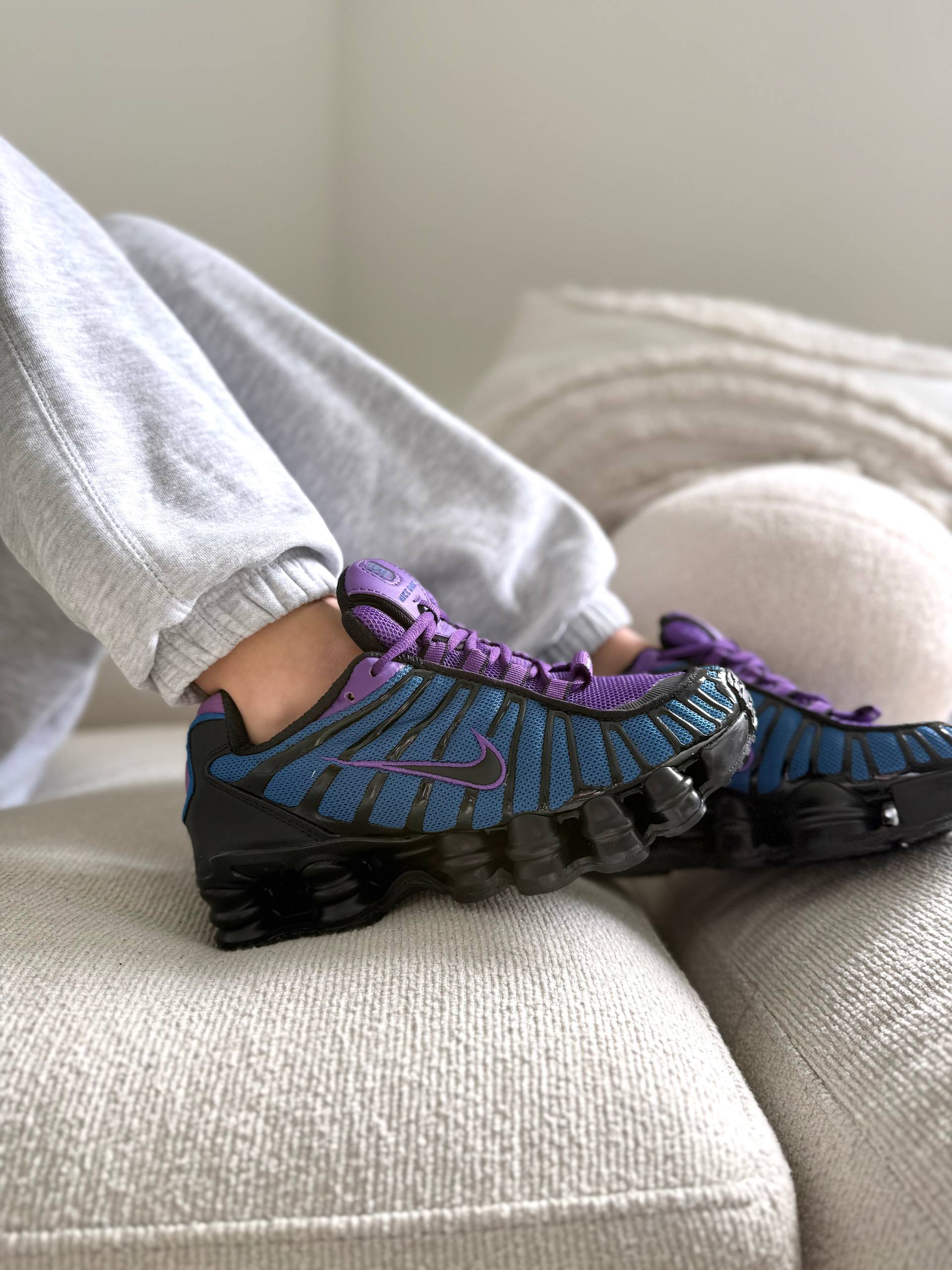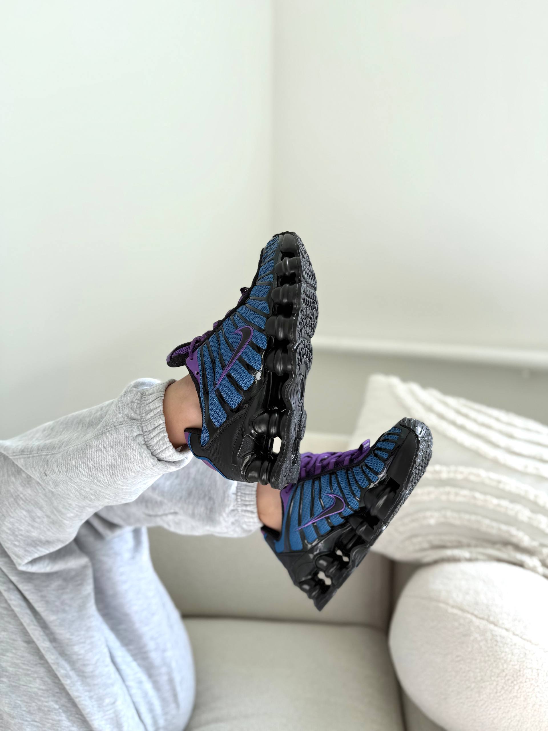 Nike Shox TL Blue Violet Black — це футуристичні кросівки з поєднанням синього, фіолетового та чорного кольорів і повнорозмірною амортизацією Shox, що забезпечують пружність і комфорт у щоденному носінні.