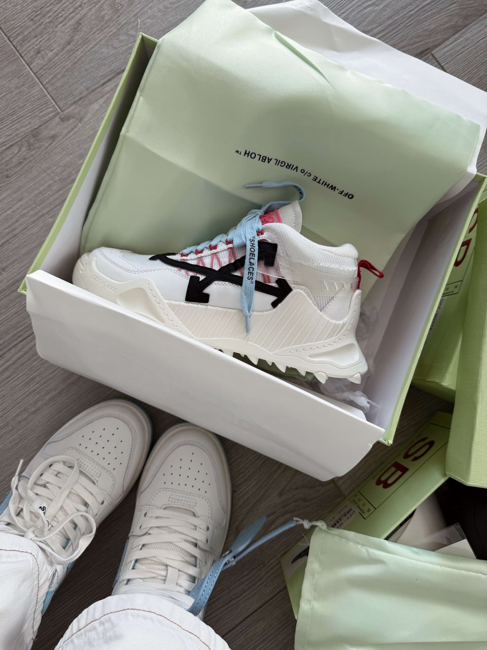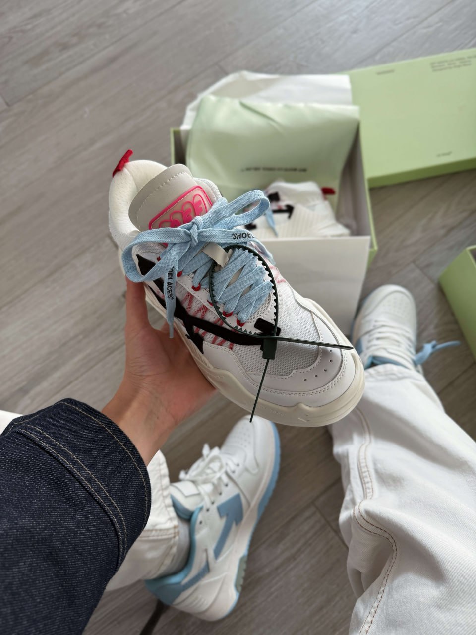 Off‑White Odsy‑1000 White Pink Black – потужні трекінгові кросівки з білої сітки й текстилю, з чорними та рожевими акцентами, масивною рифленою підошвою та фірмовою биркою-блискавкою від Off‑White