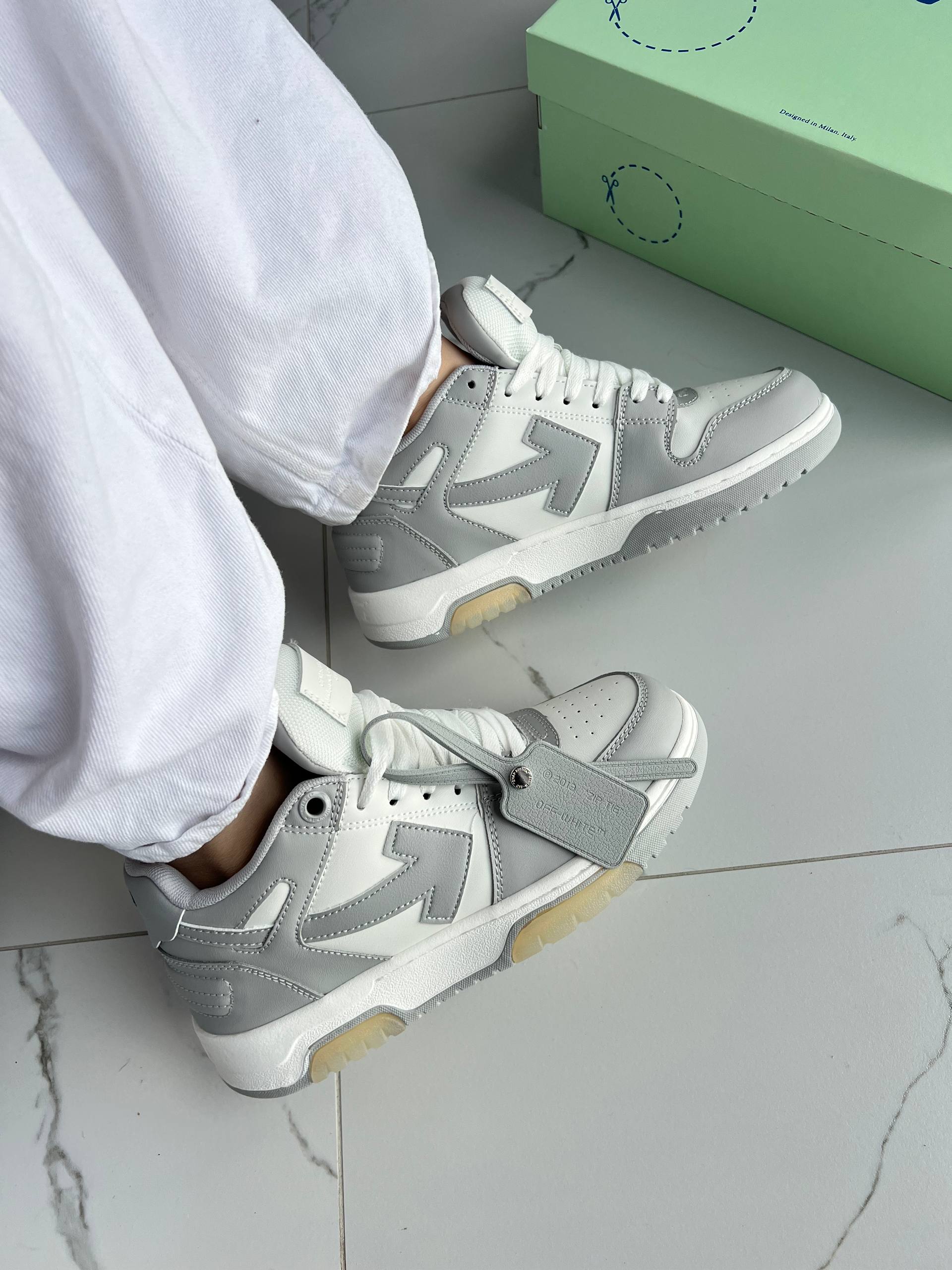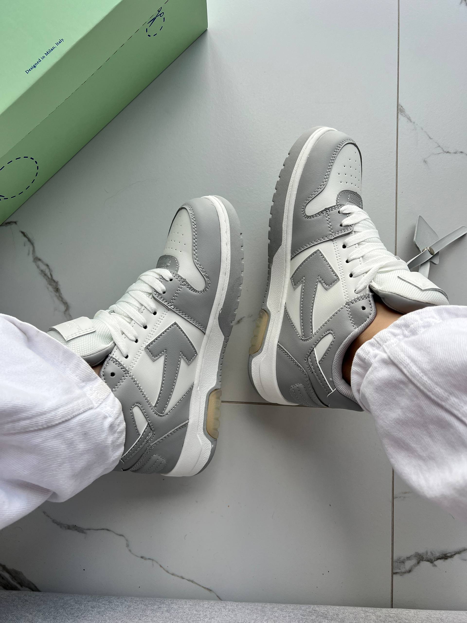 Off-White Out of Office Low Tops Grey White — це стильне поєднання вуличної естетики й мінімалістичного дизайну в сірій та білій гамі з фірмовими акцентами бренду.