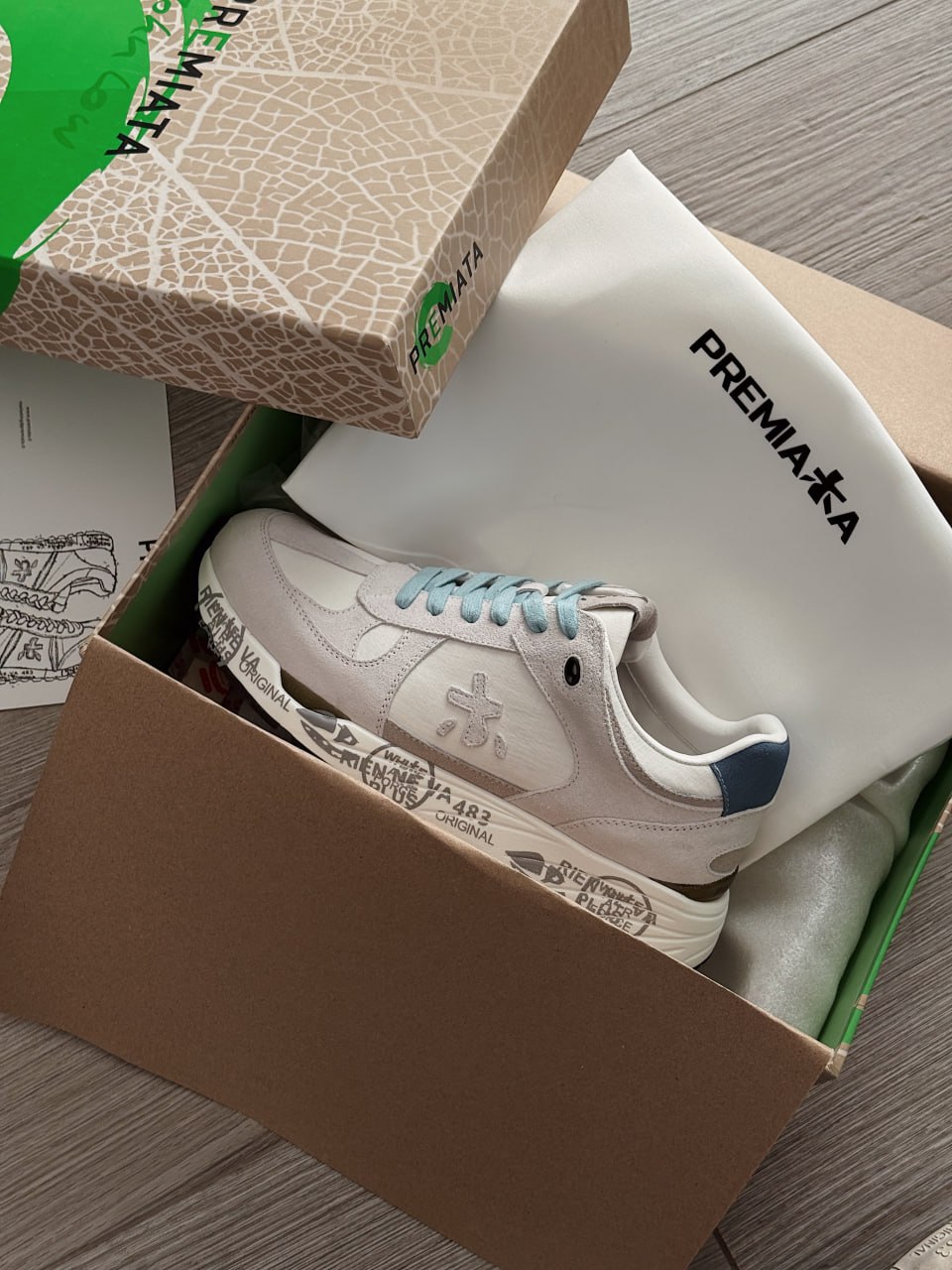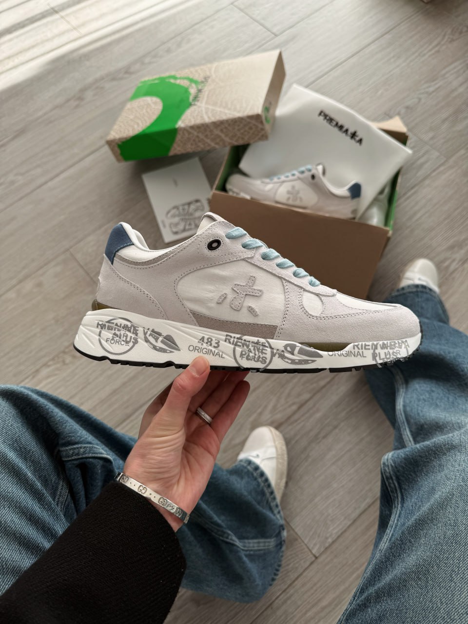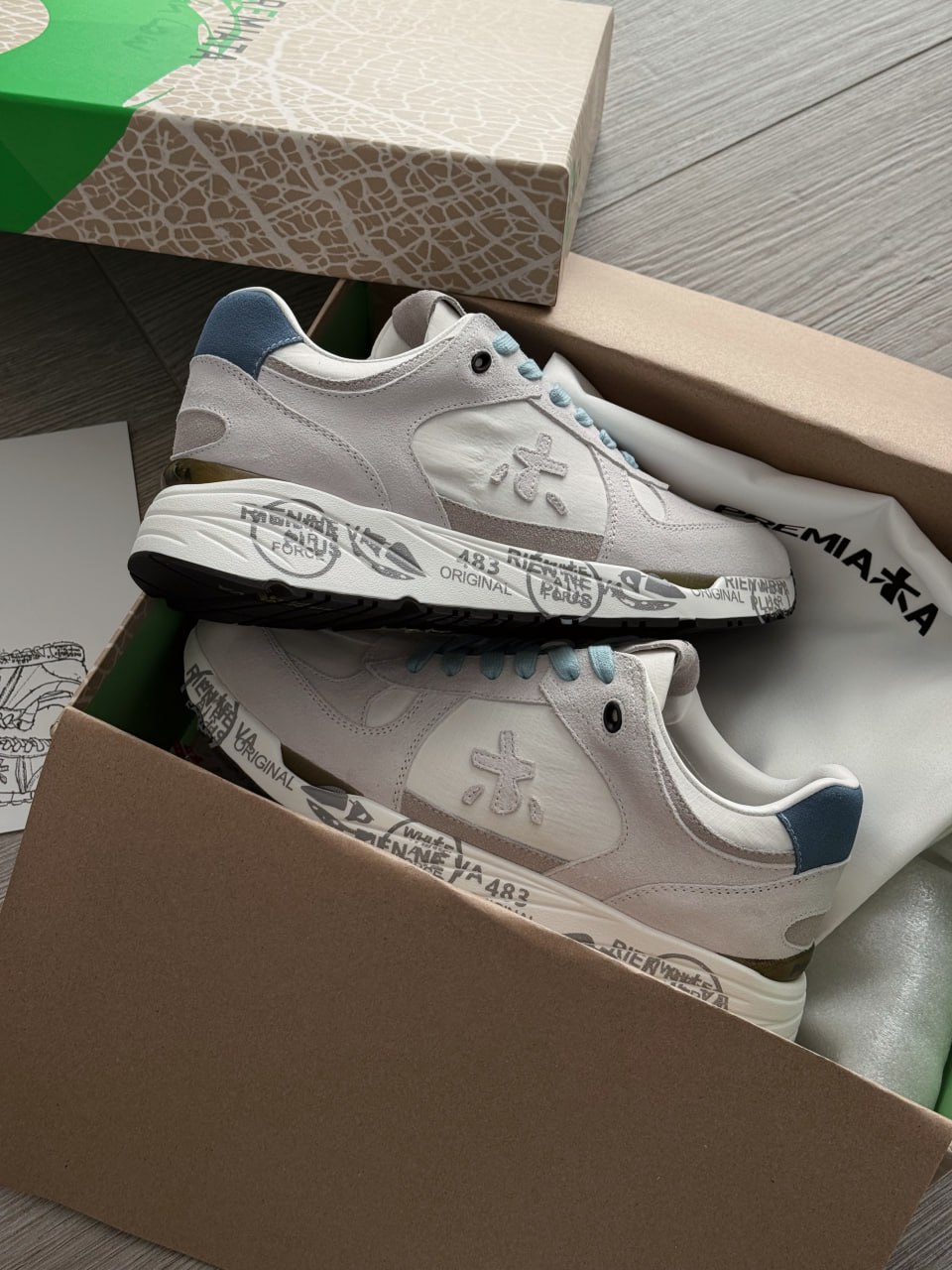 Premiata Lander White Blue — це стильні чоловічі кросівки преміумкласу в біло-блакитній гамі, що поєднують сучасний спортивний дизайн, високоякісні матеріали та фірмову масивну підошву з виразним брендуванням.